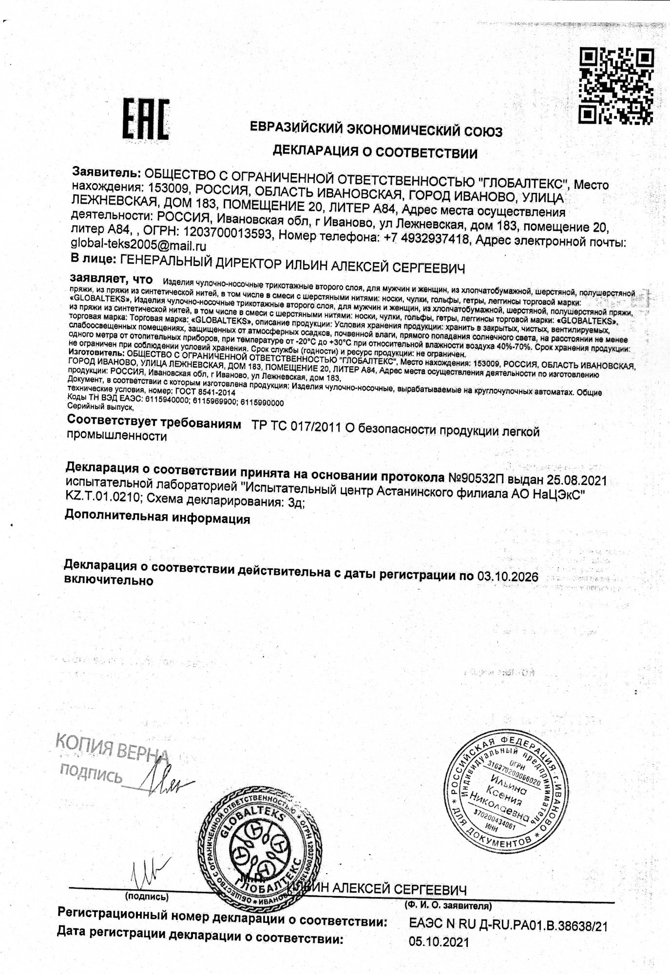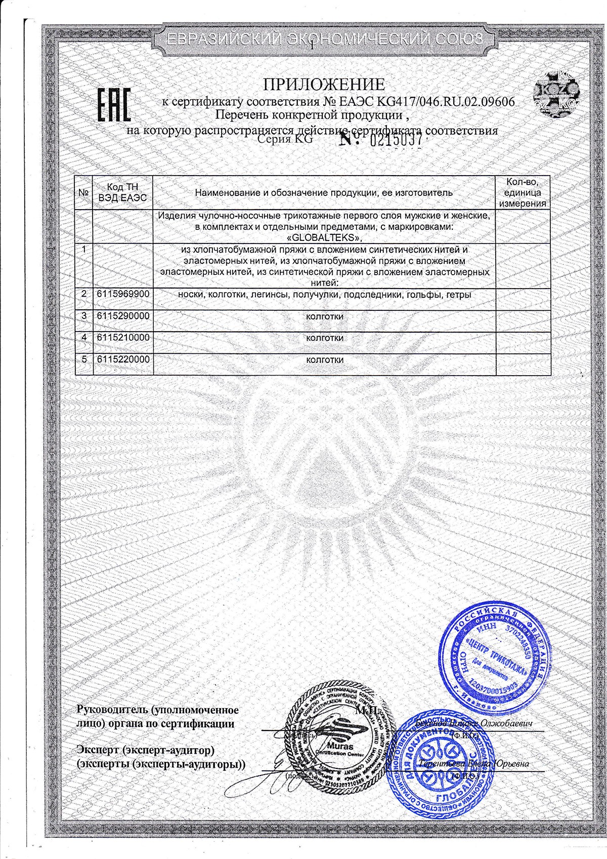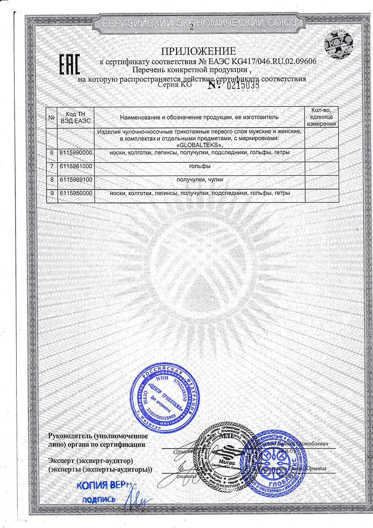 Документы производителя Чулочно-носочные изделия GLOBALTEKS