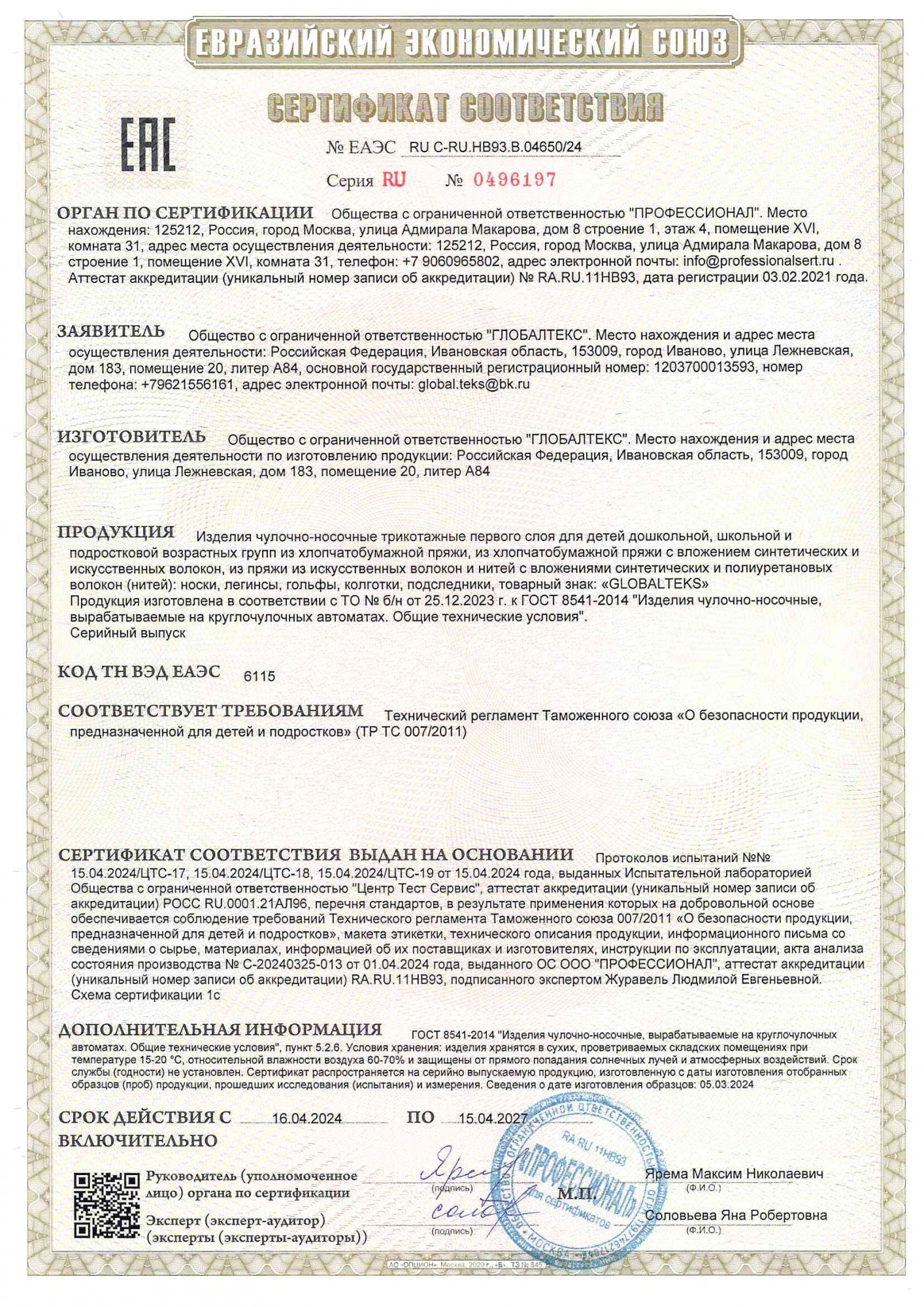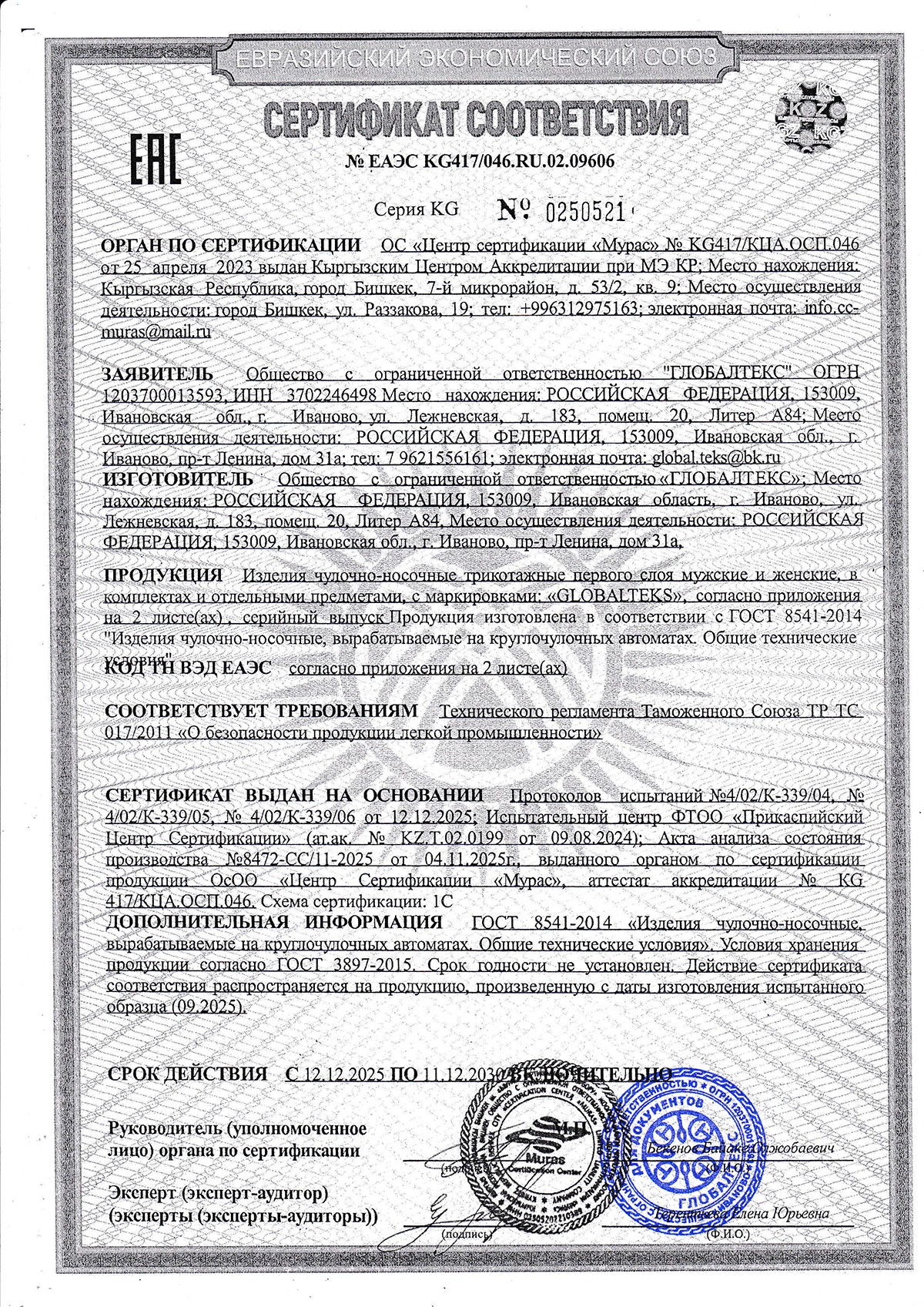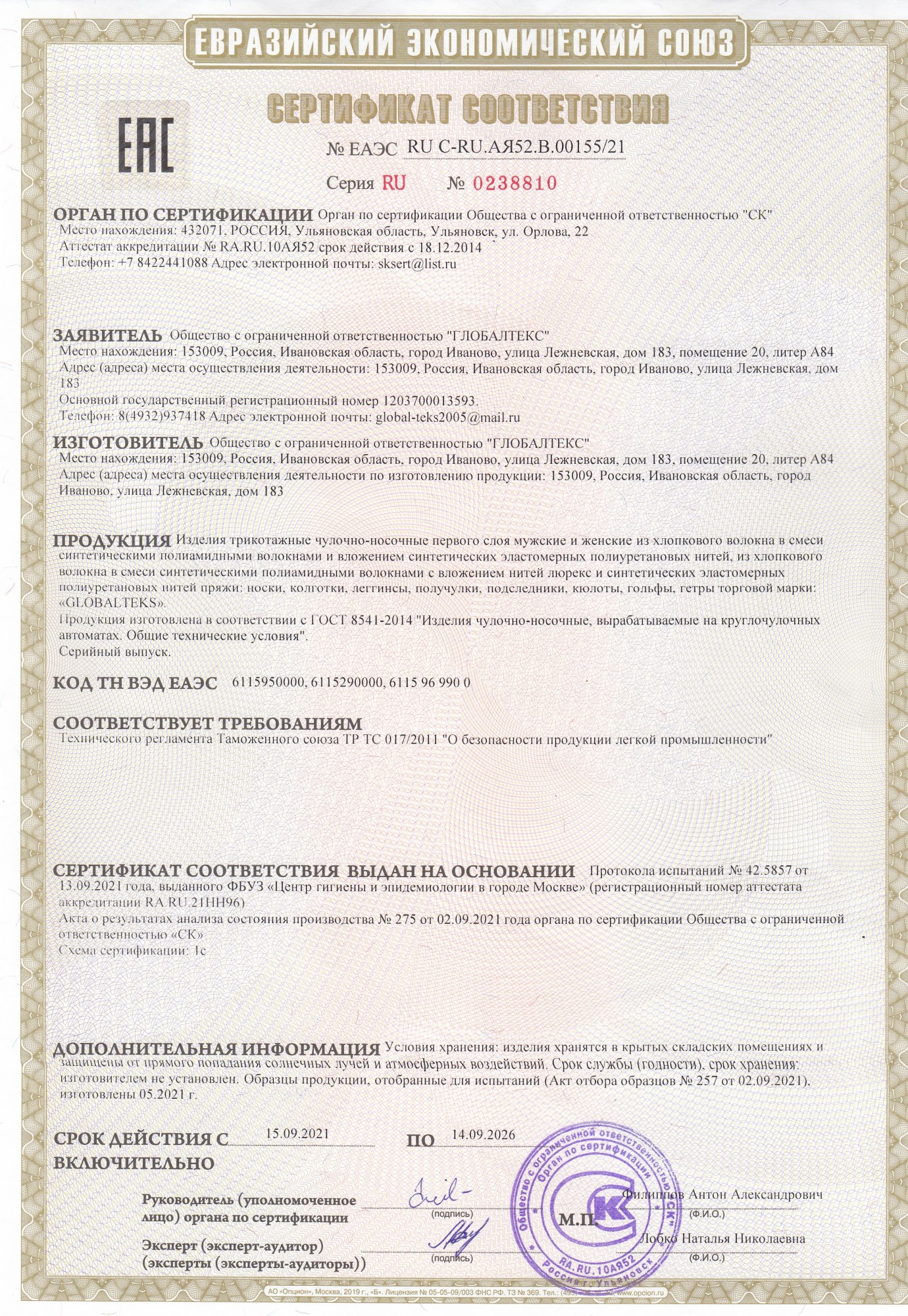 Документы производителя Чулочно-носочные изделия GLOBALTEKS