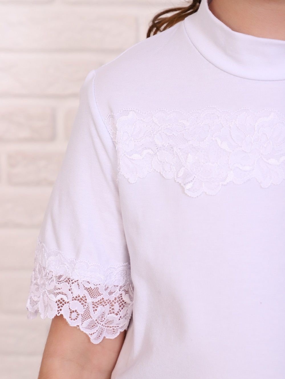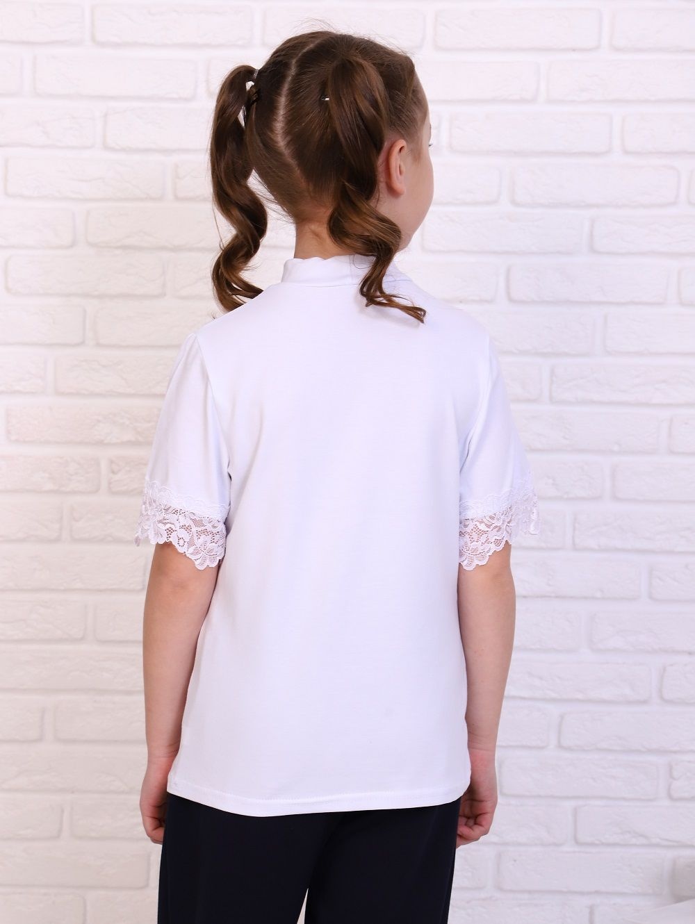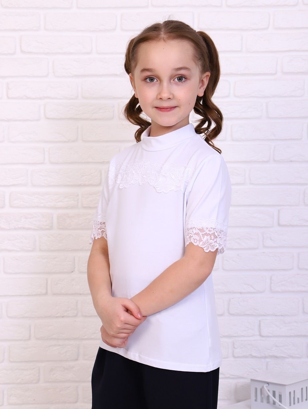 Школьная блузка для девочки с коротким рукавом. Мягкая трикотажная ткань и нежное кружево на рукавах и по переду изделия делают её универсальной - подходящей как для повседневной носки, так и для праздничных мероприятий. Узорчатый, полупрозрачный гипюр придаёт шарм этой модели. Модель составит одинаково удачный комплект и с юбкой, и с брюками. Воротник-стойка, несмотря на отсутствие застежки, хорошо тянется. Блузка сшита из качественного трикотажа, используемый материал не теряет форму после многократных стирок, мягкий и приятный к телу, устойчив к износу. Для сохранения первоначальных свойств изделия, важно соблюдать рекомендации по уходу.