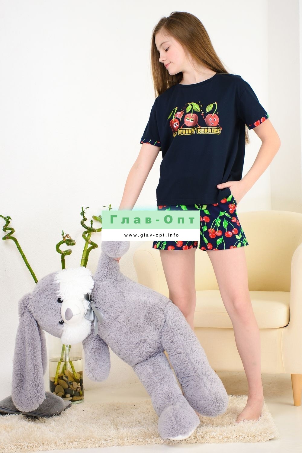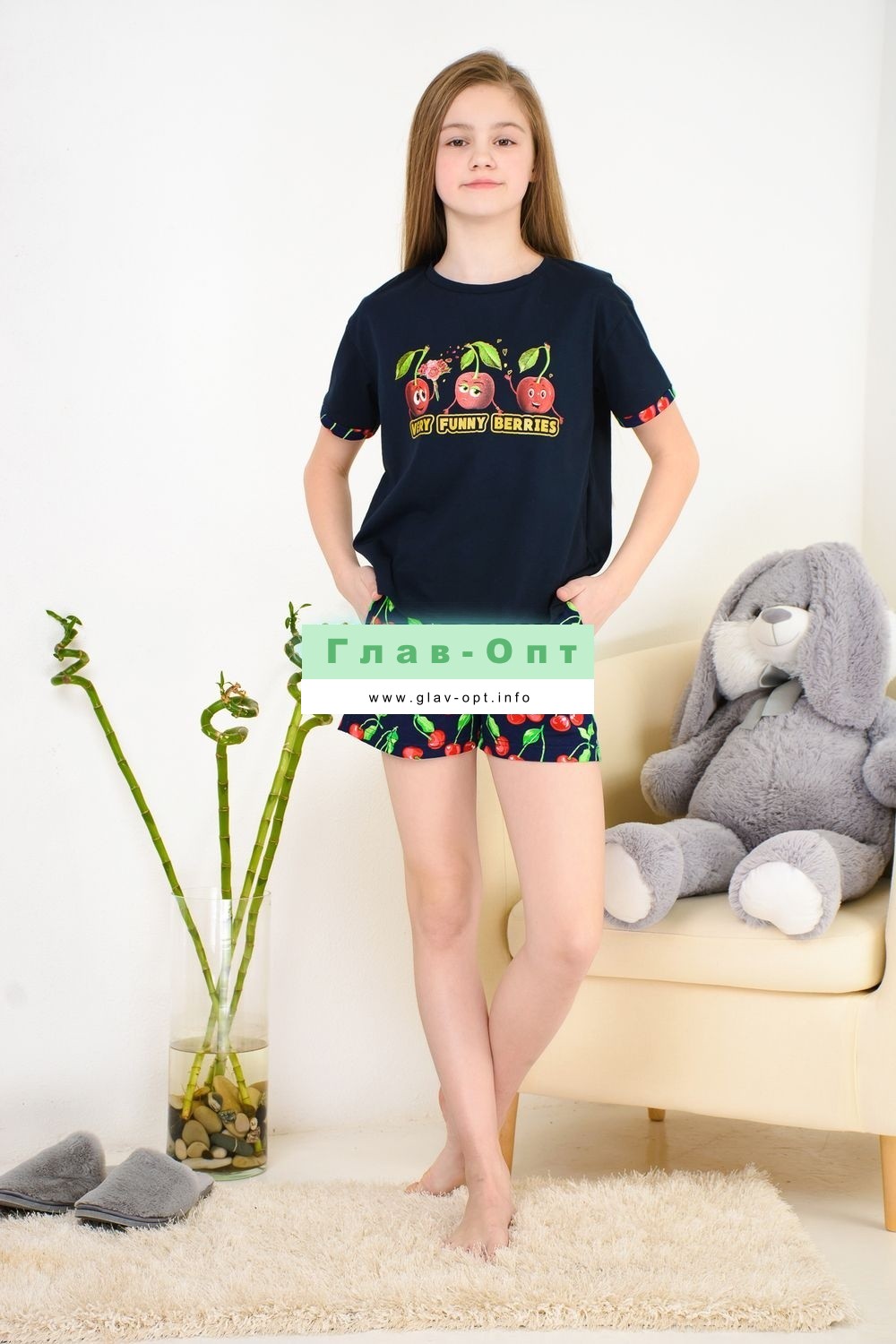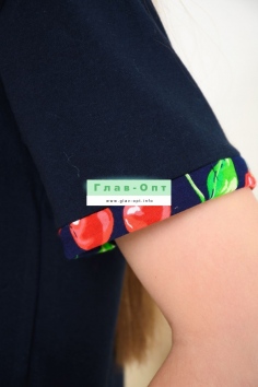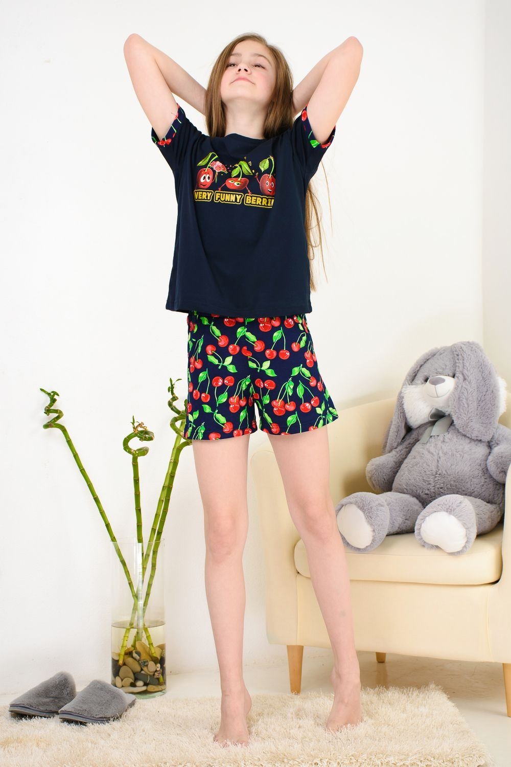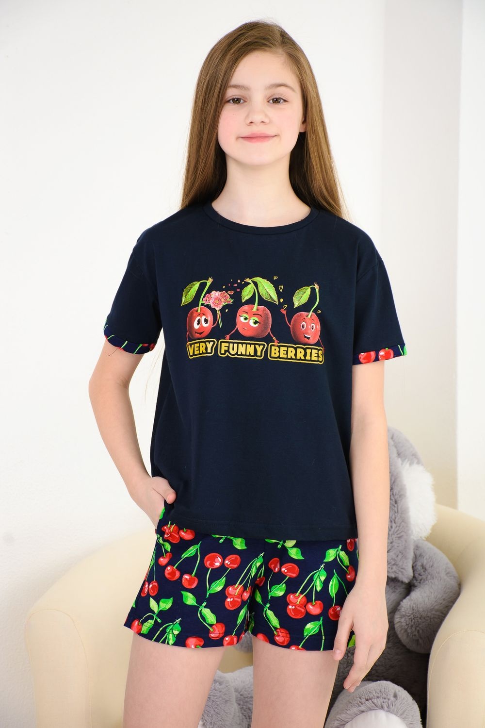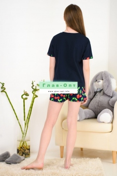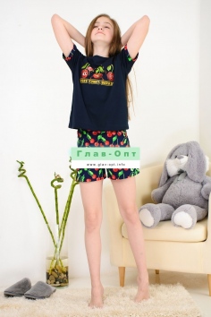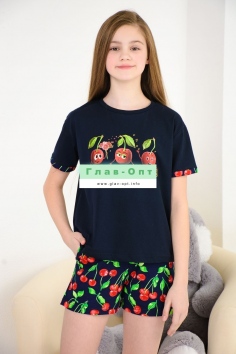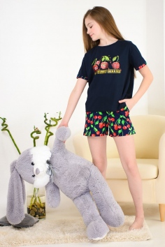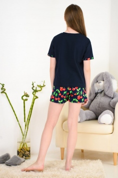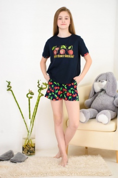 Весёлый костюм для подростков состоит из футболки свободного кроя и шорт с боковыми карманами. Симпатичный принт - три вишенки. На рукавах манжеты с отворотами. Костюм незаменим на отдыхе и дома.