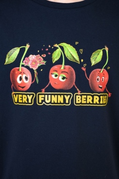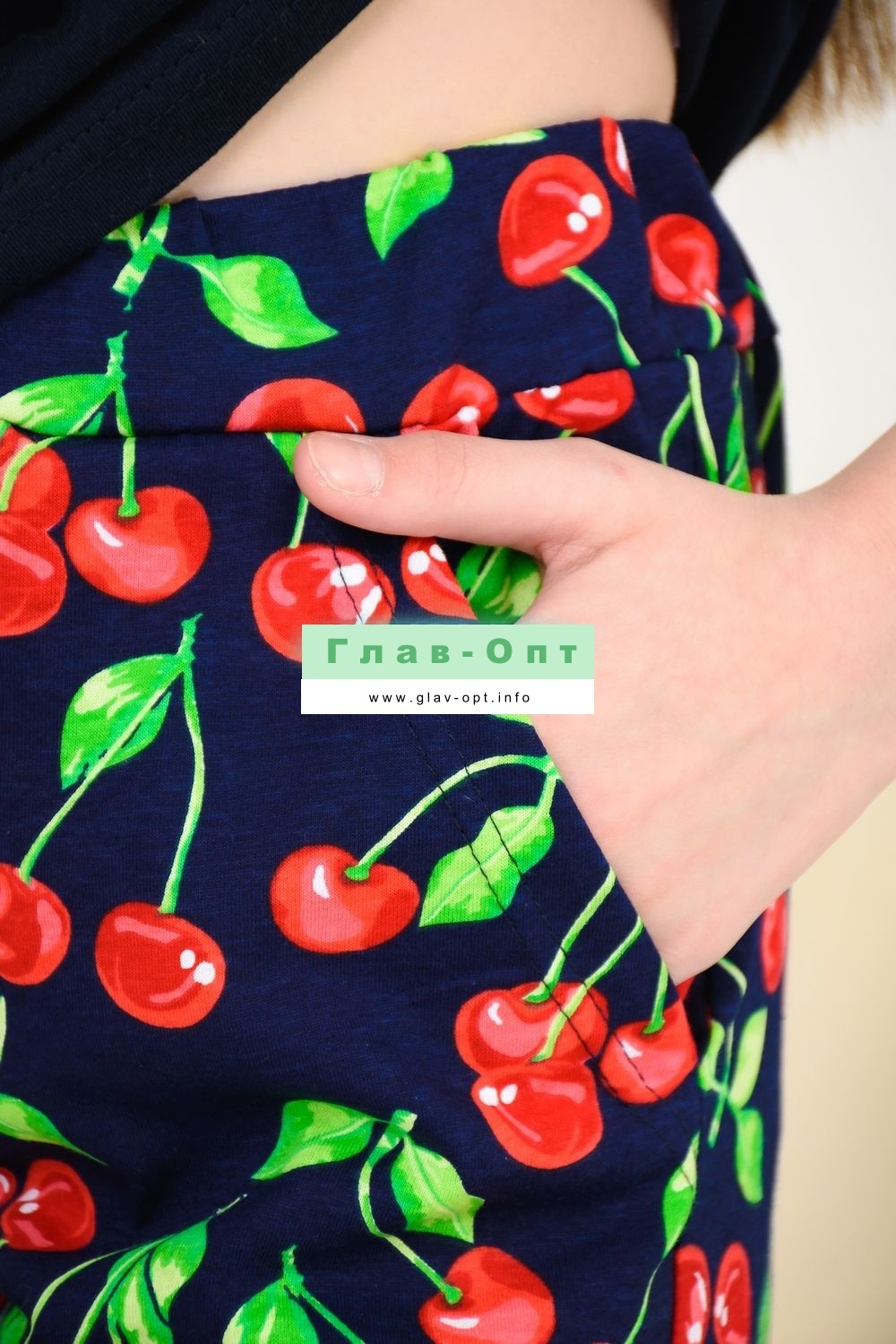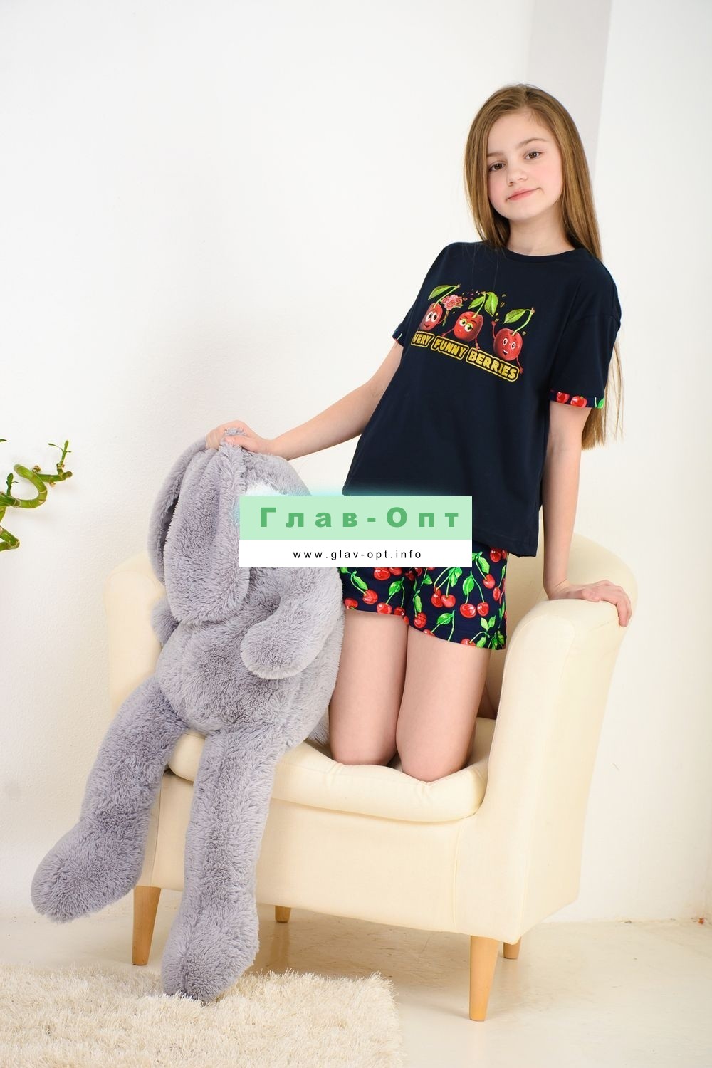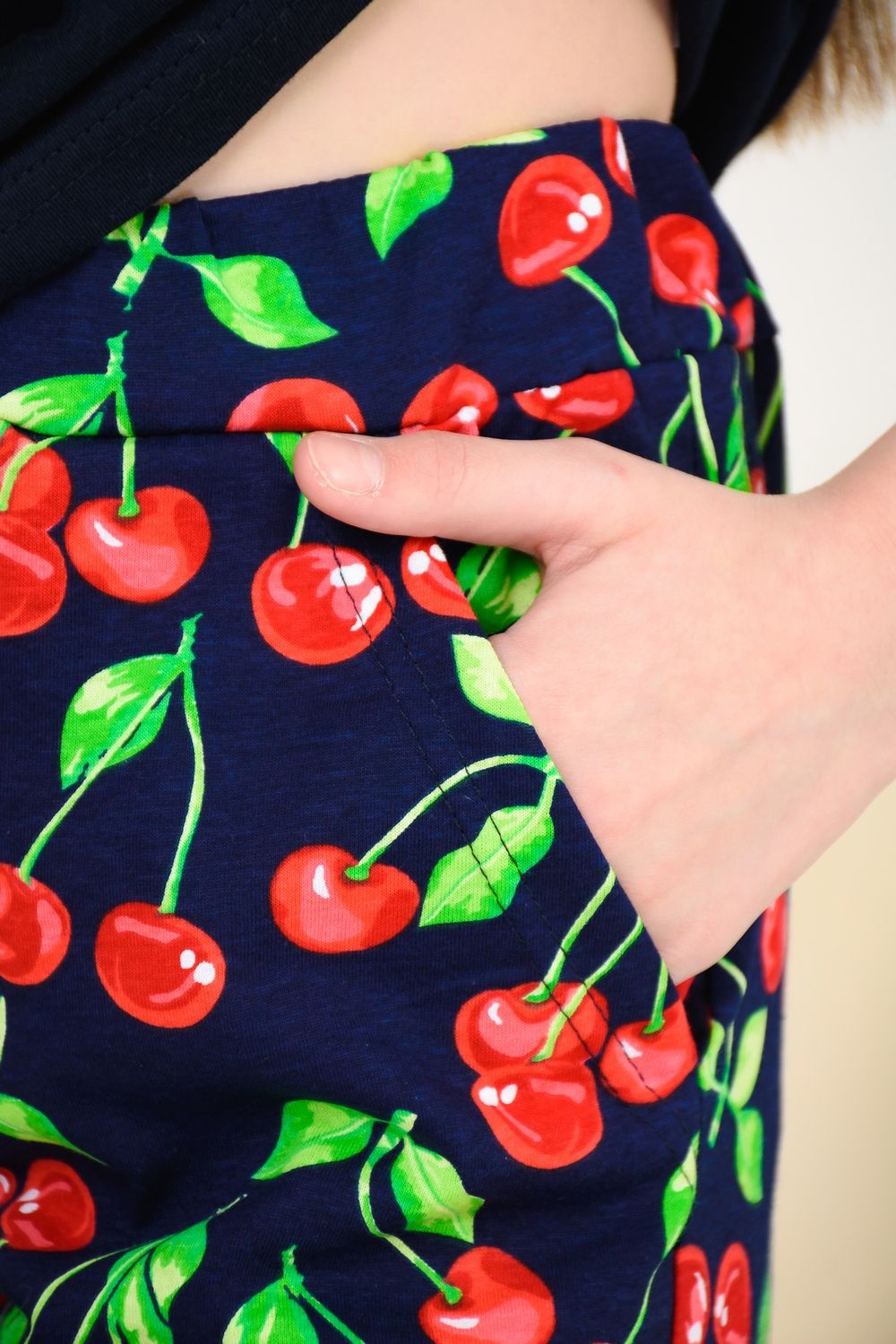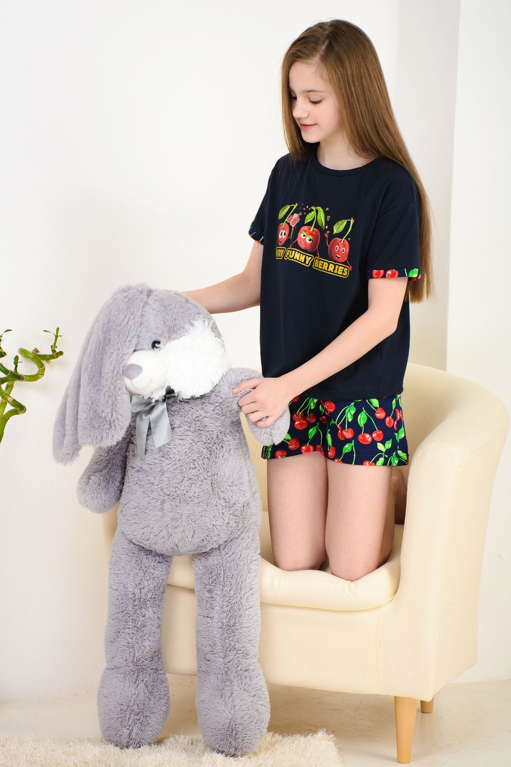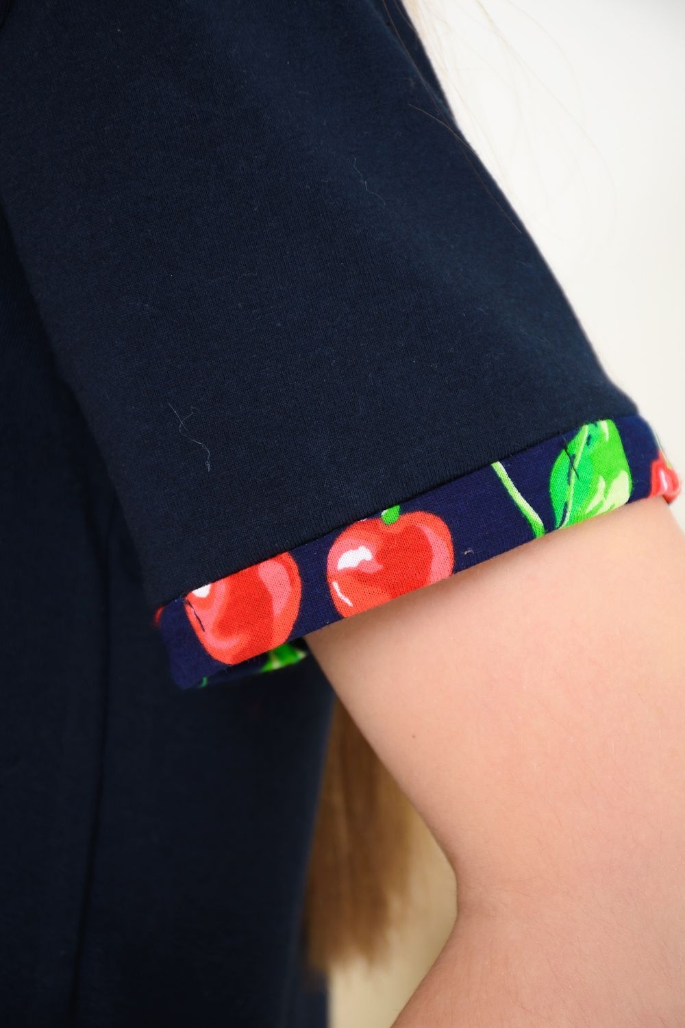 Весёлый костюм для подростков состоит из футболки свободного кроя и шорт с боковыми карманами. Симпатичный принт - три вишенки. На рукавах манжеты с отворотами. Костюм незаменим на отдыхе и дома.