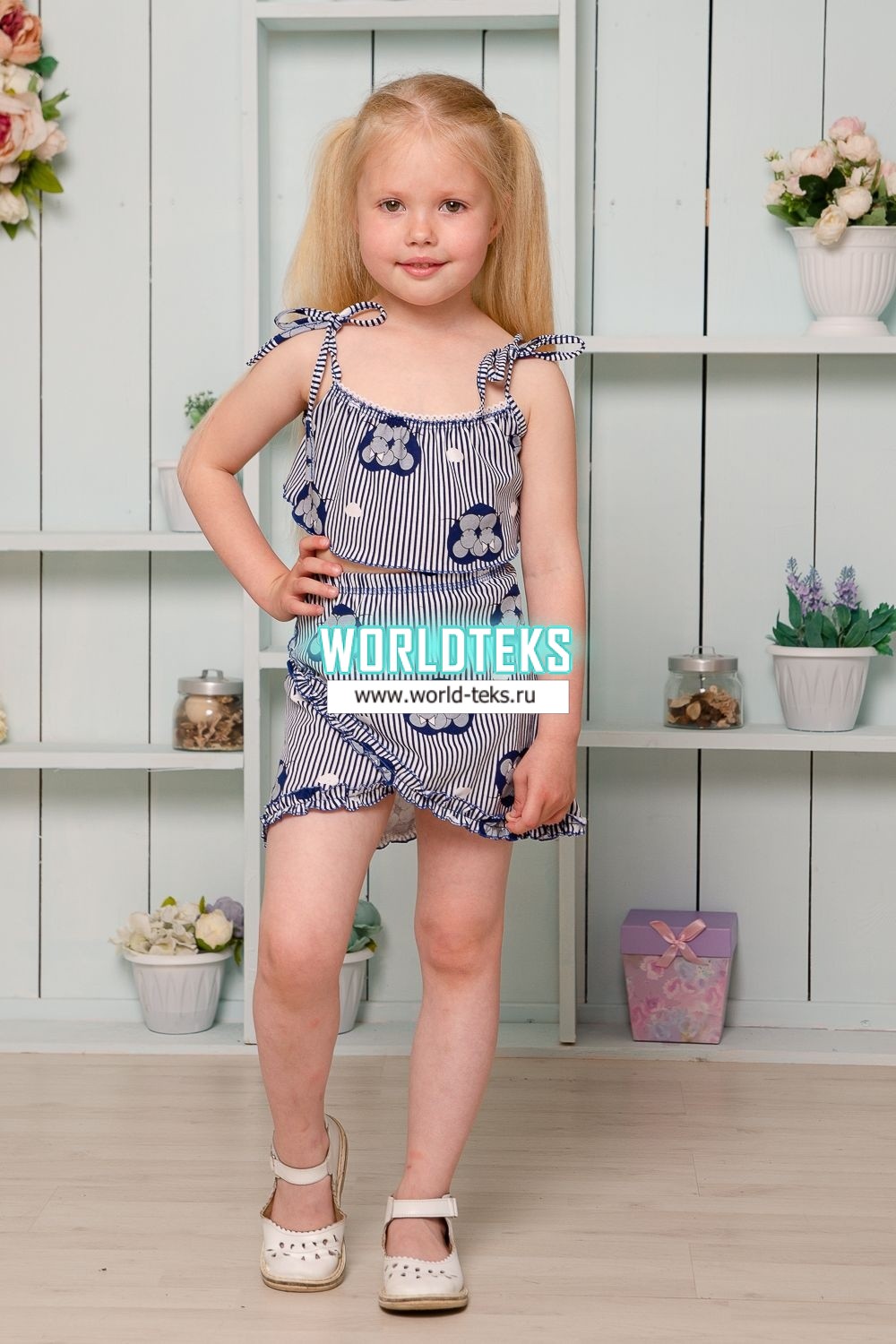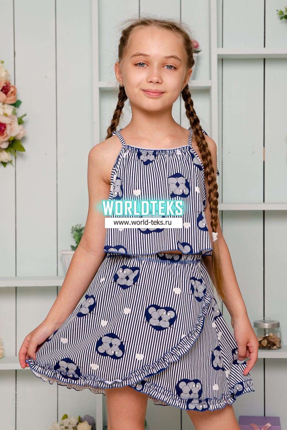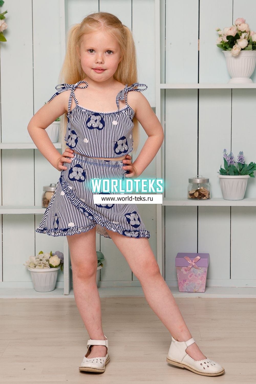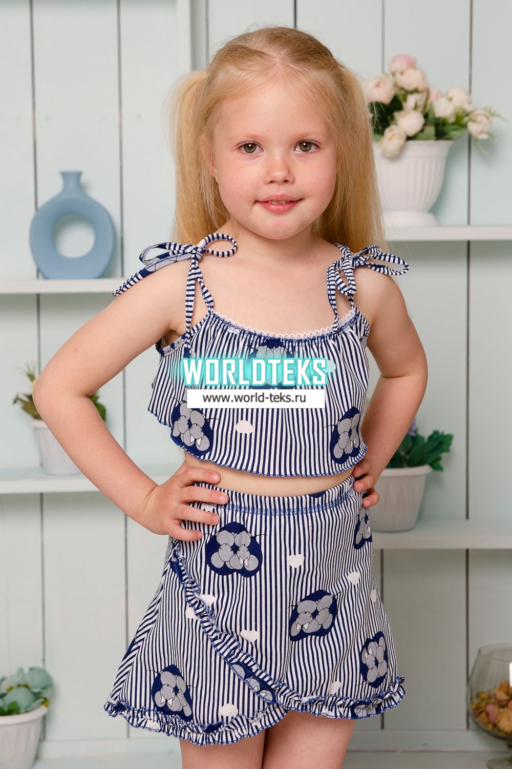 Костюм детский летний с юбкой и топом. Топ свободный на тонких брителях-завязках, которыми удобно регулировать длину изделия, горловина обработана декоративной ажурной резинкой, низ декоративной краеобметочной строчкой. Юбка расклешенная на запах, по всему нижнему контуру настрочена рюша.