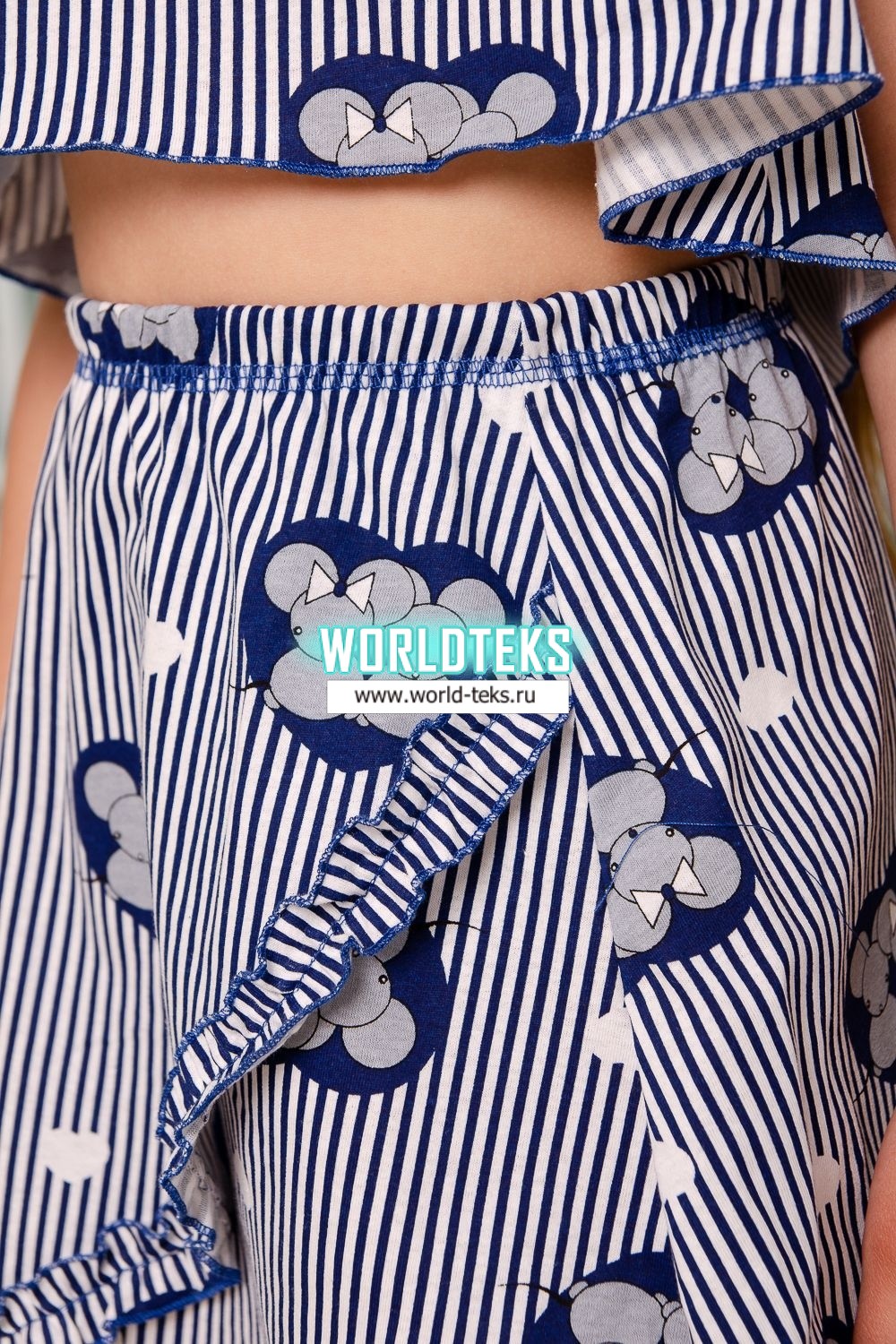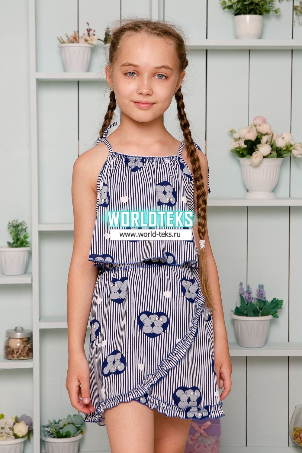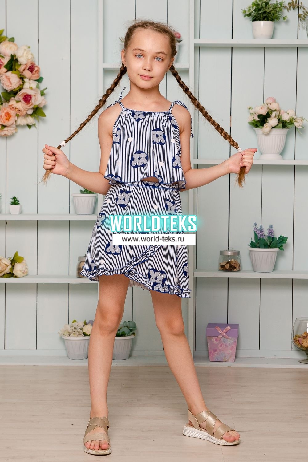 Костюм детский летний с юбкой и топом. Топ свободный на тонких брителях-завязках, которыми удобно регулировать длину изделия, горловина обработана декоративной ажурной резинкой, низ декоративной краеобметочной строчкой. Юбка расклешенная на запах, по всему нижнему контуру настрочена рюша.