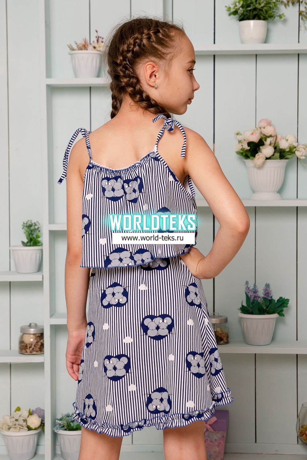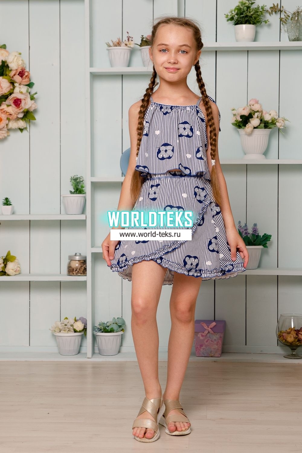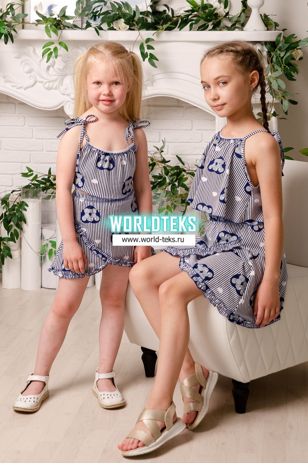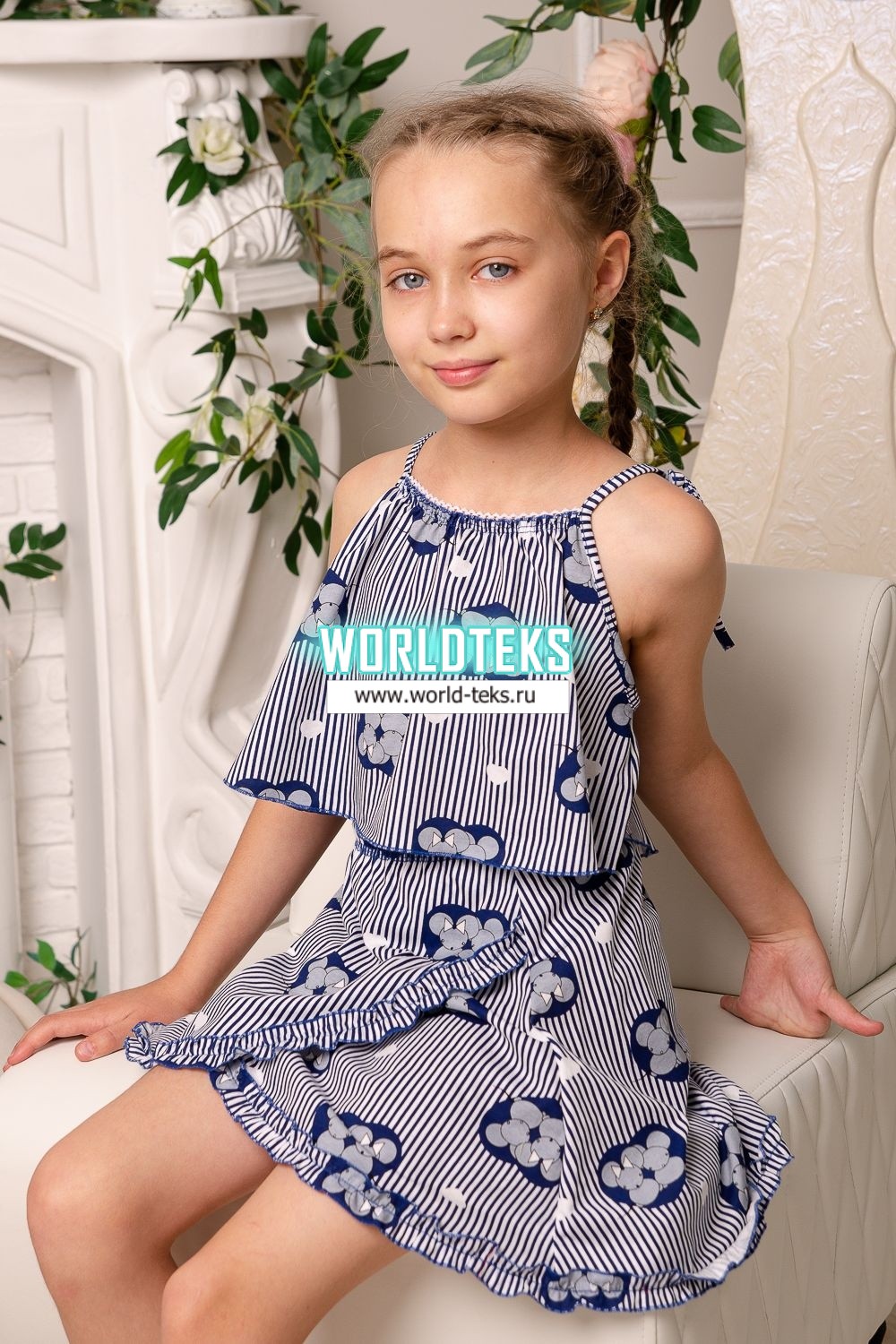 Костюм детский летний с юбкой и топом. Топ свободный на тонких брителях-завязках, которыми удобно регулировать длину изделия, горловина обработана декоративной ажурной резинкой, низ декоративной краеобметочной строчкой. Юбка расклешенная на запах, по всему нижнему контуру настрочена рюша.