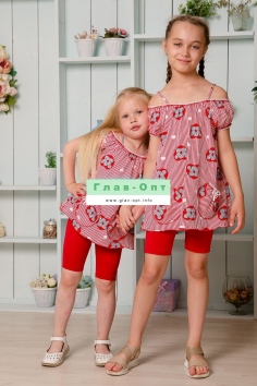 Майка детская летняя. Свободного А-силуэта на тонких бретелях. С двумя декоративными кармашками, на которых настрочены бантики из атласной ленты. Горловина и рукава собраны на кружевную резинку. Все срезы в изделии обработаны декоративной краеобметочной строчкой.