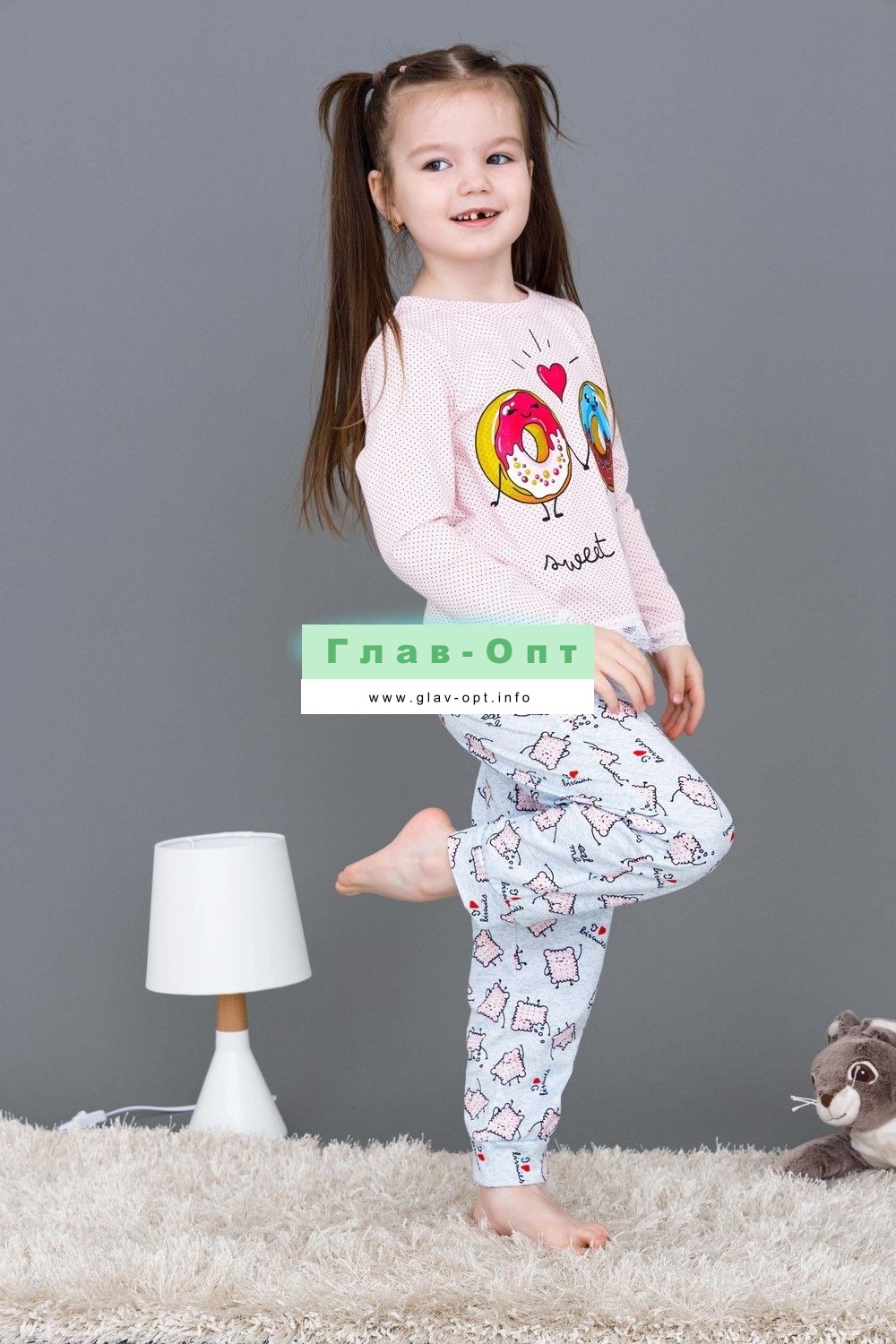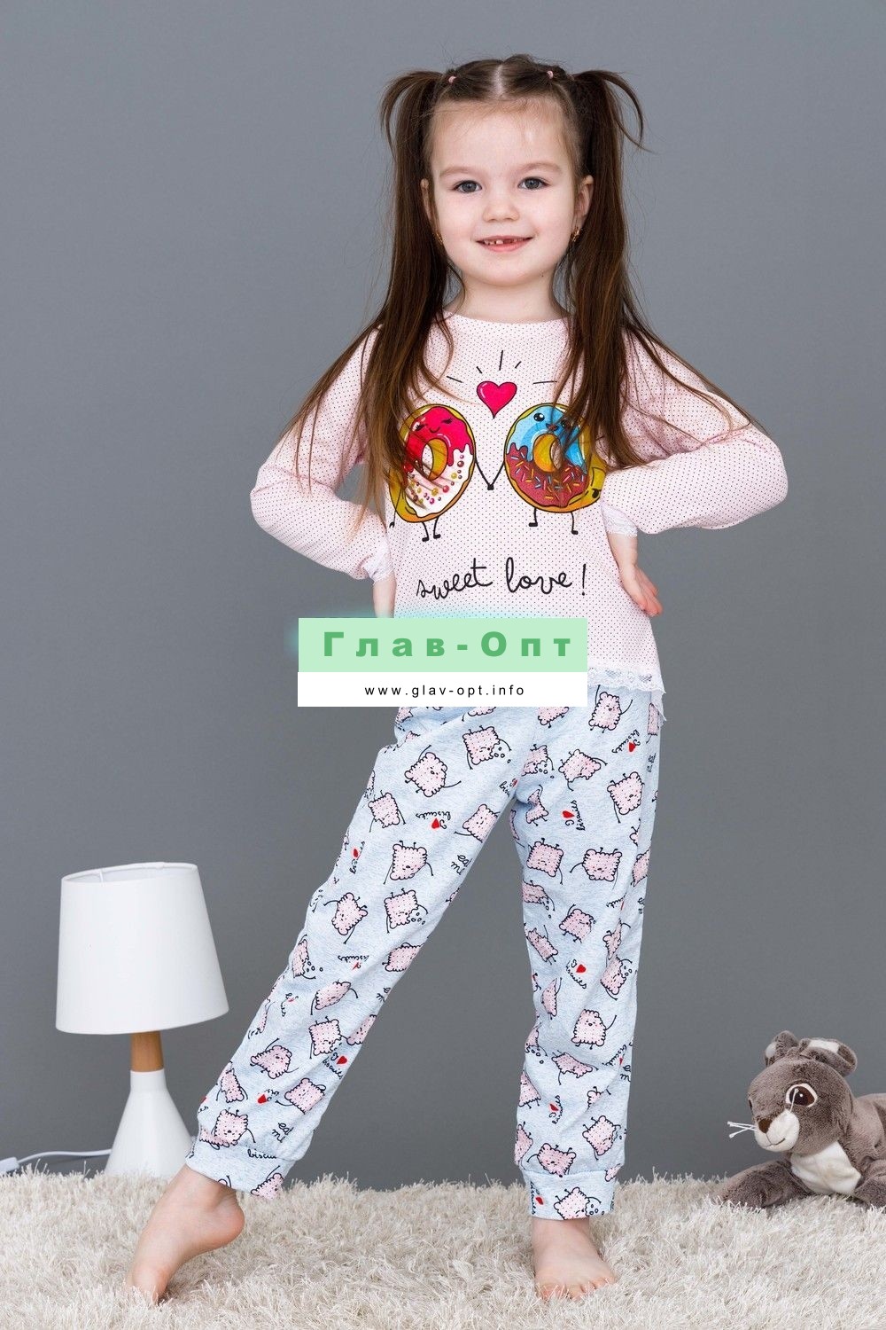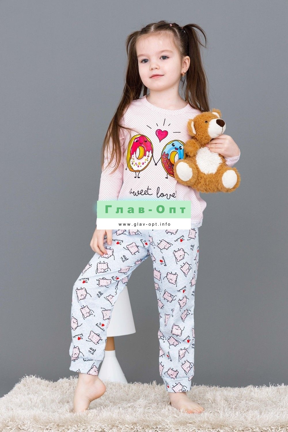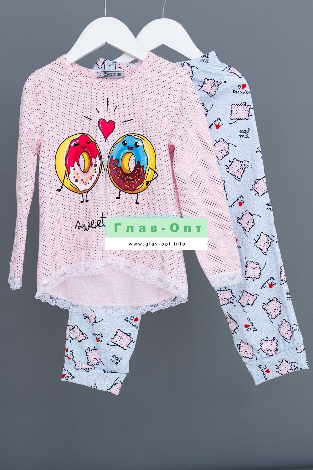 Пижамка детская со сладкой печатью! Изготовлена из гипоаллергенного трикотажа, хлопок не электризуется и обеспечивает циркуляцию воздуха. Пижама свободного кроя, не ограничивает движения. Кофта с длинными рукавами, низки и рукава отделаны мягким кружевом. Штанишки на манжете. На примере пижамы 50506 можно увидеть как выглядит маленький размер. Размерная сетка обеих пижам идентична.