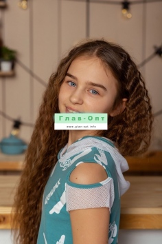 Платье длинной выше колена, с оборкой по низу, с капюшоном из сетки. Рукав короткий из сетки, с фигурным вырезом. Лицевой край капюшона, фигурные вырезы рукавов обработаны бейкой из основного полотна.