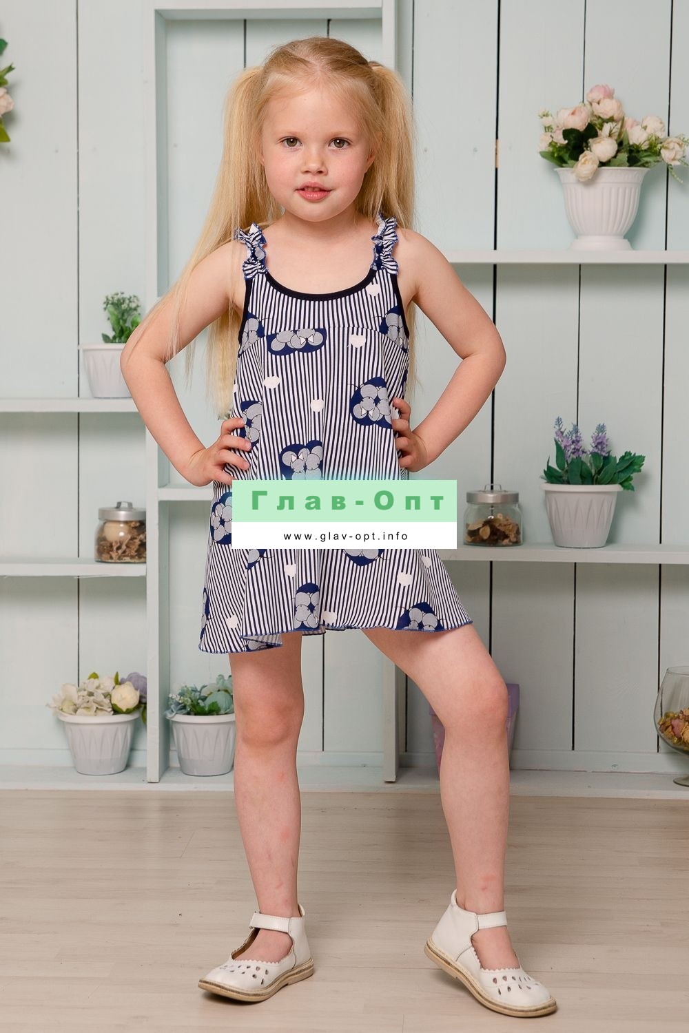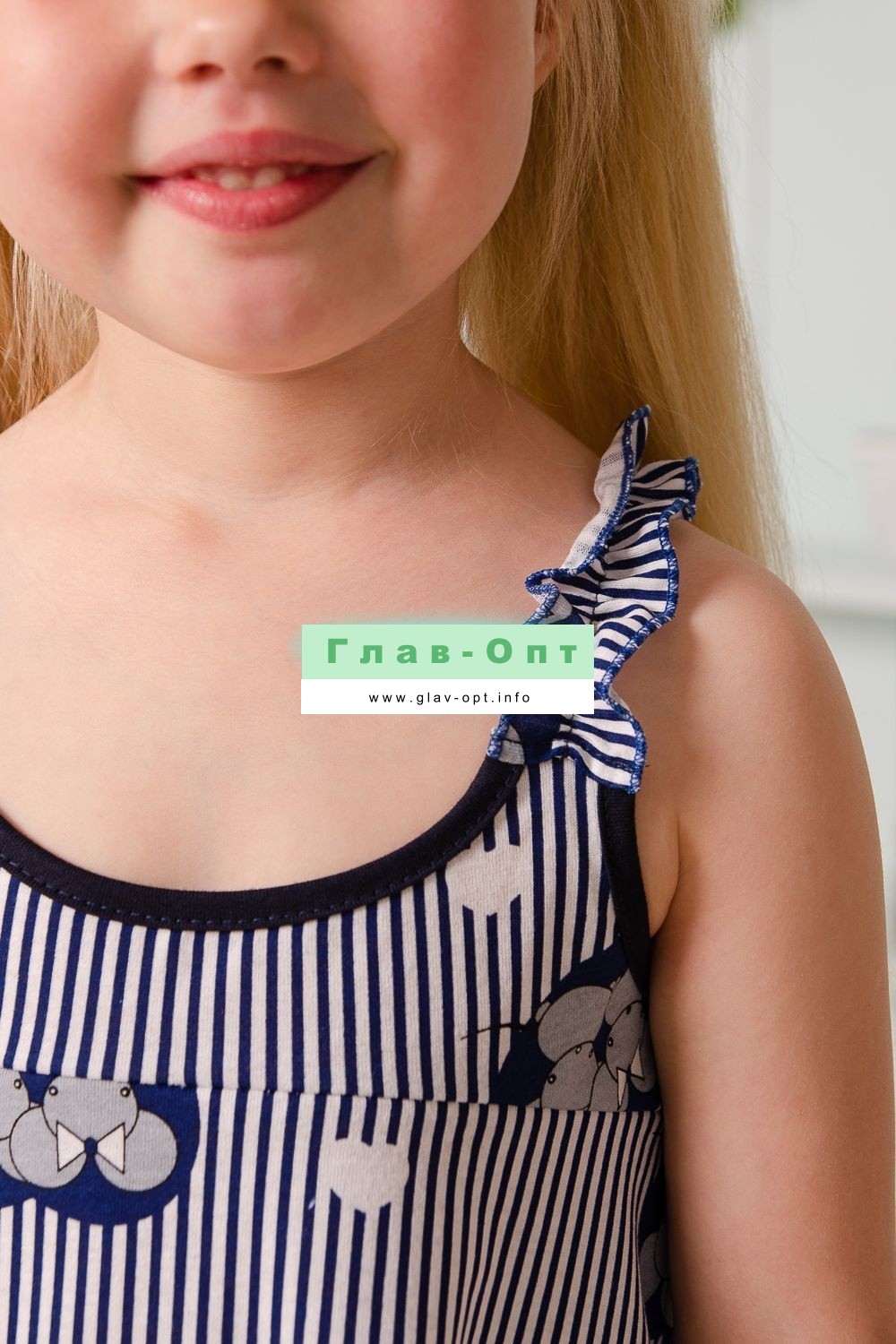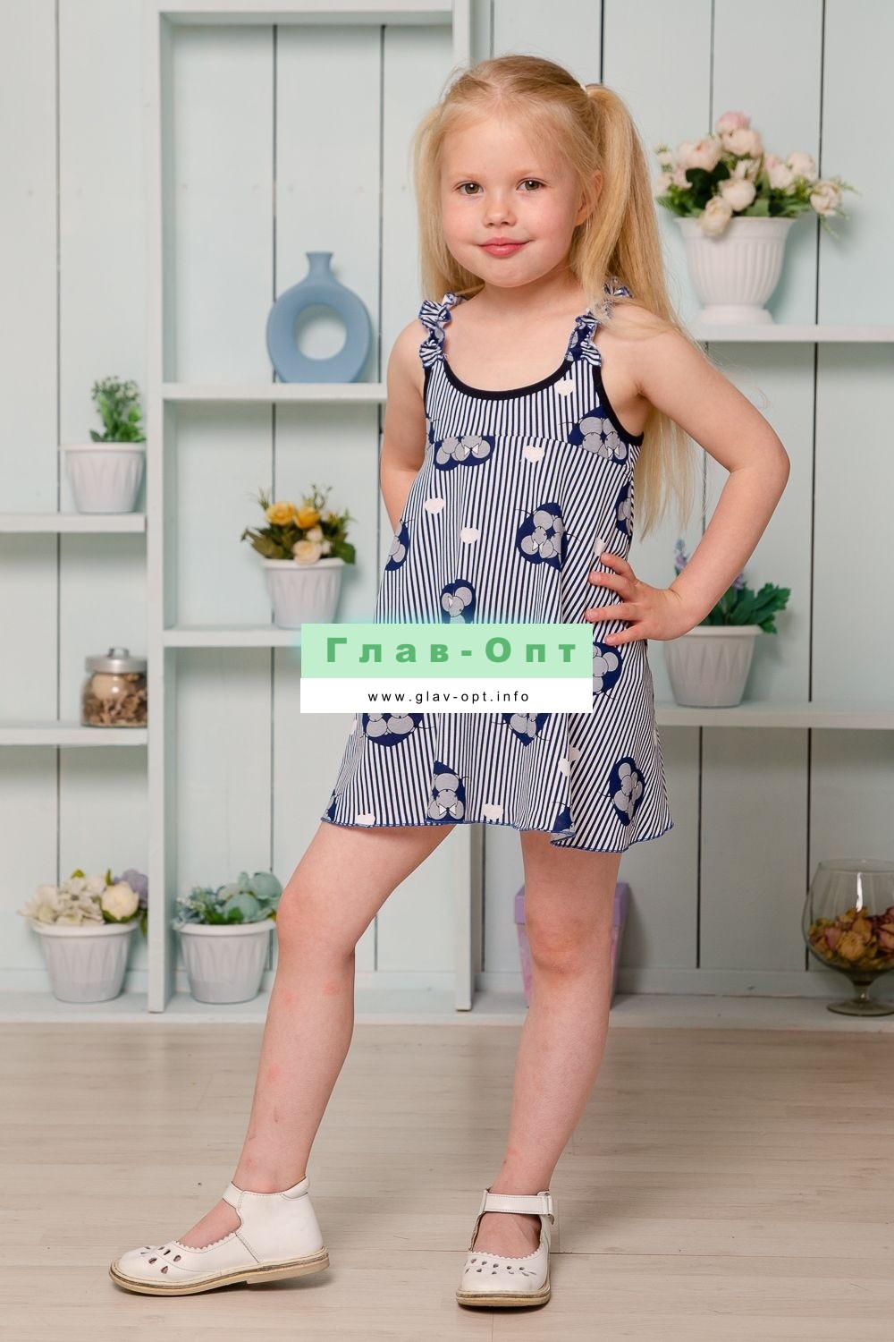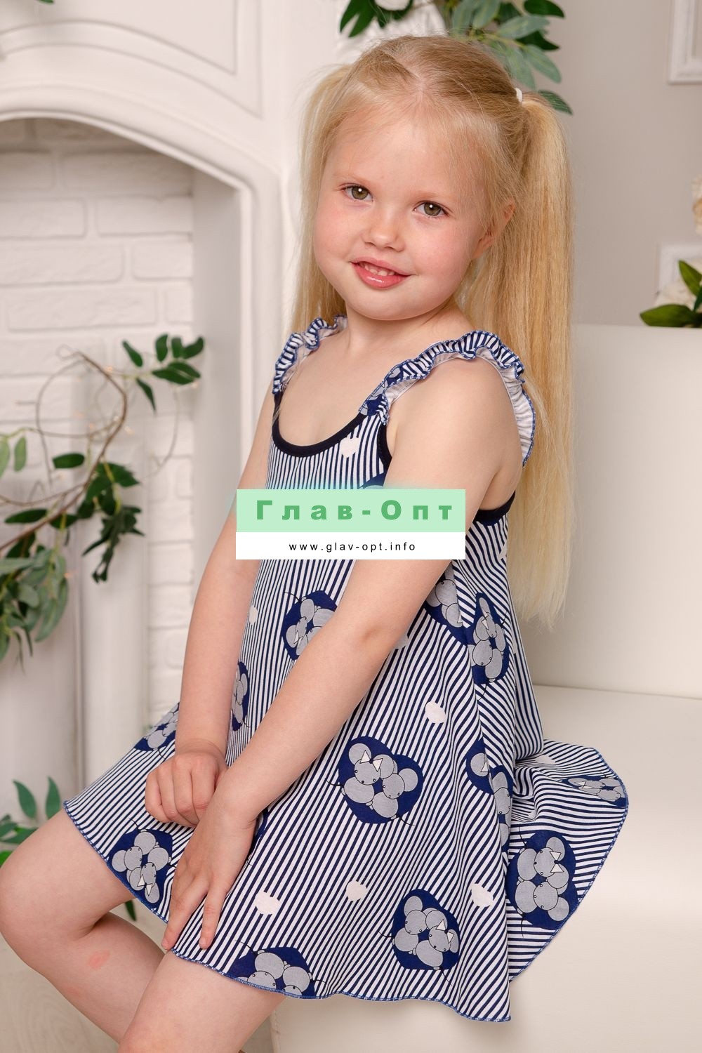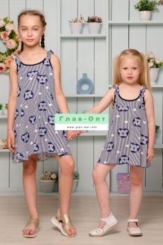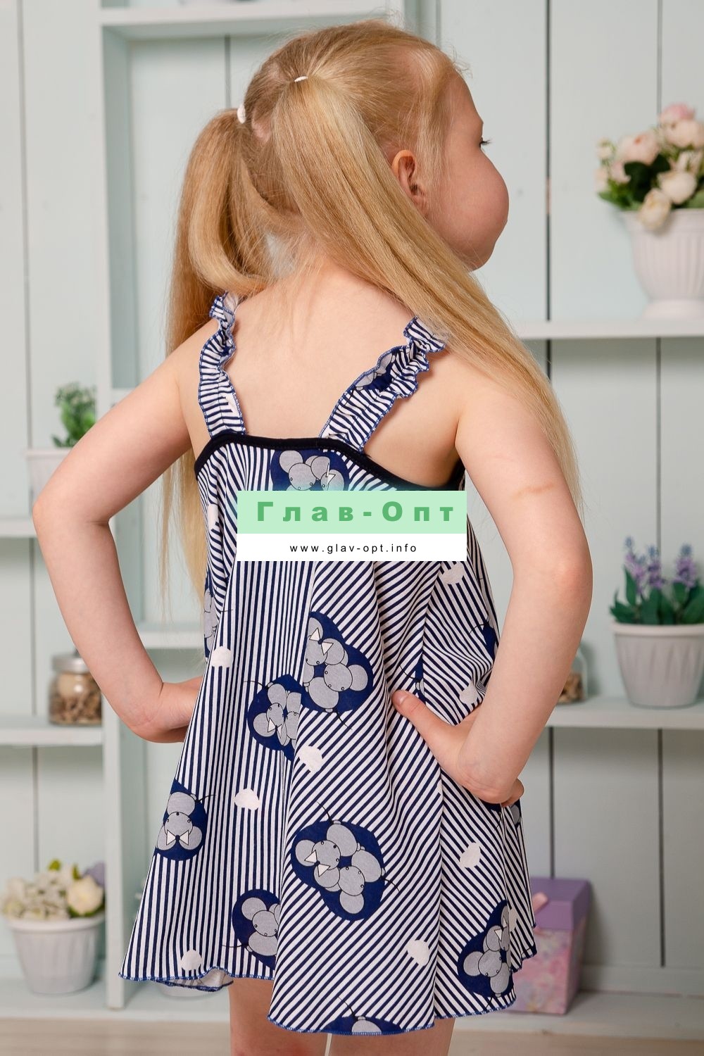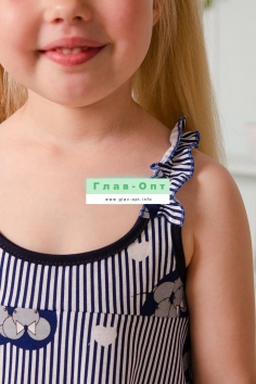 Сарафан детский летний, свободного силуэта с завышенной линией талии. Бретели выполнены из основной ткани собранной на тонкую резинку. Низ изделия обработан декоративной краеобметочной строчкой.