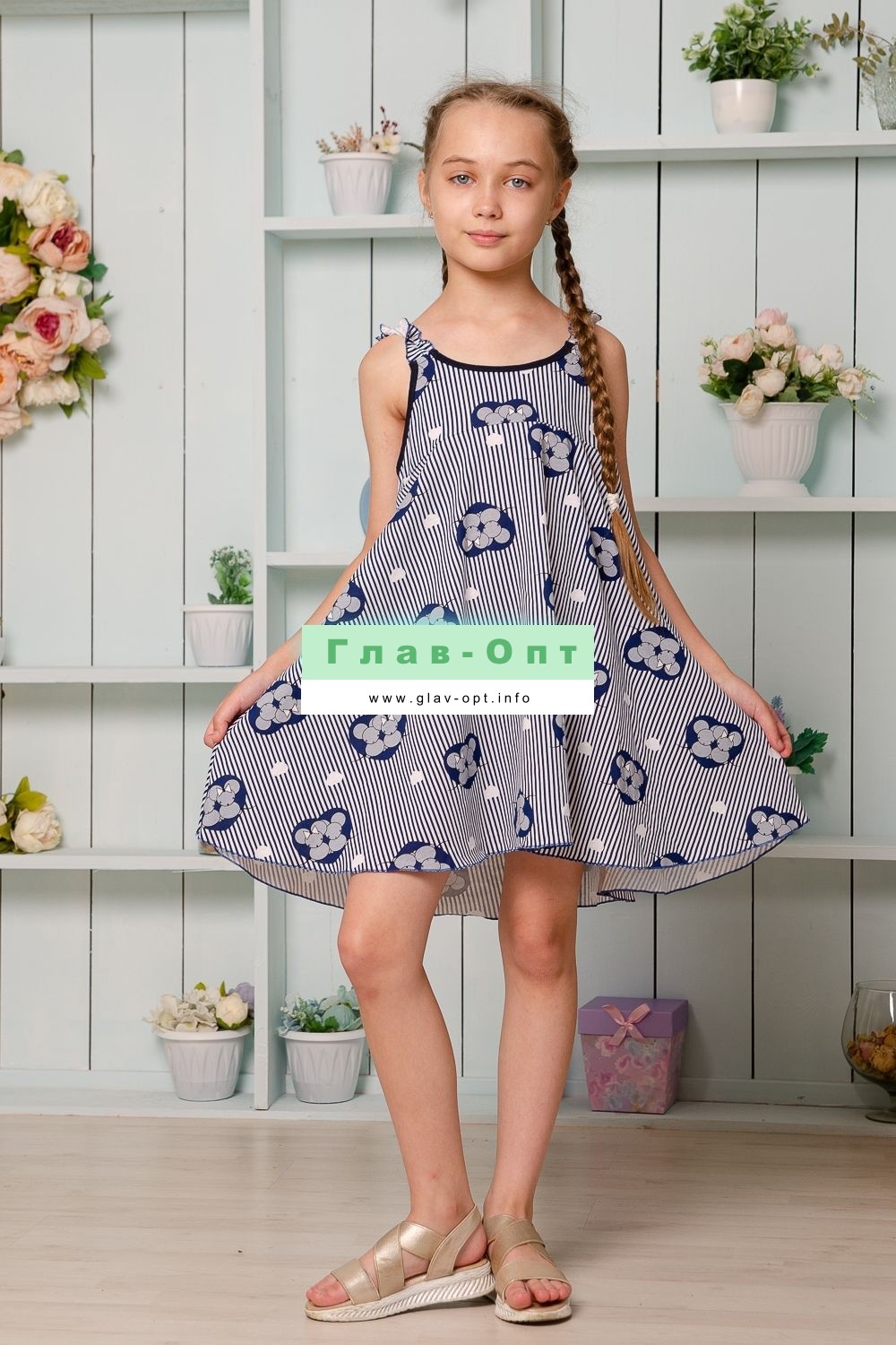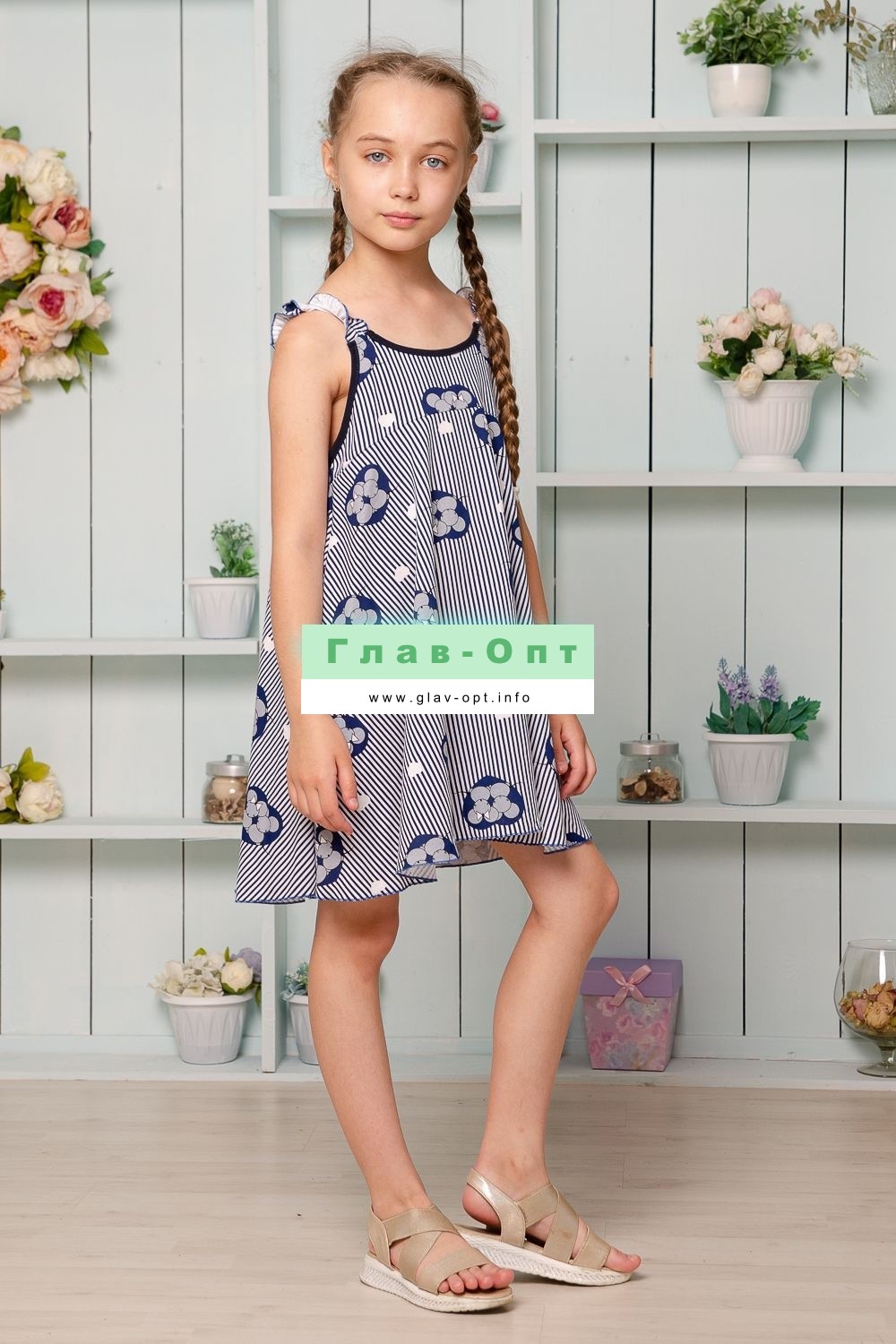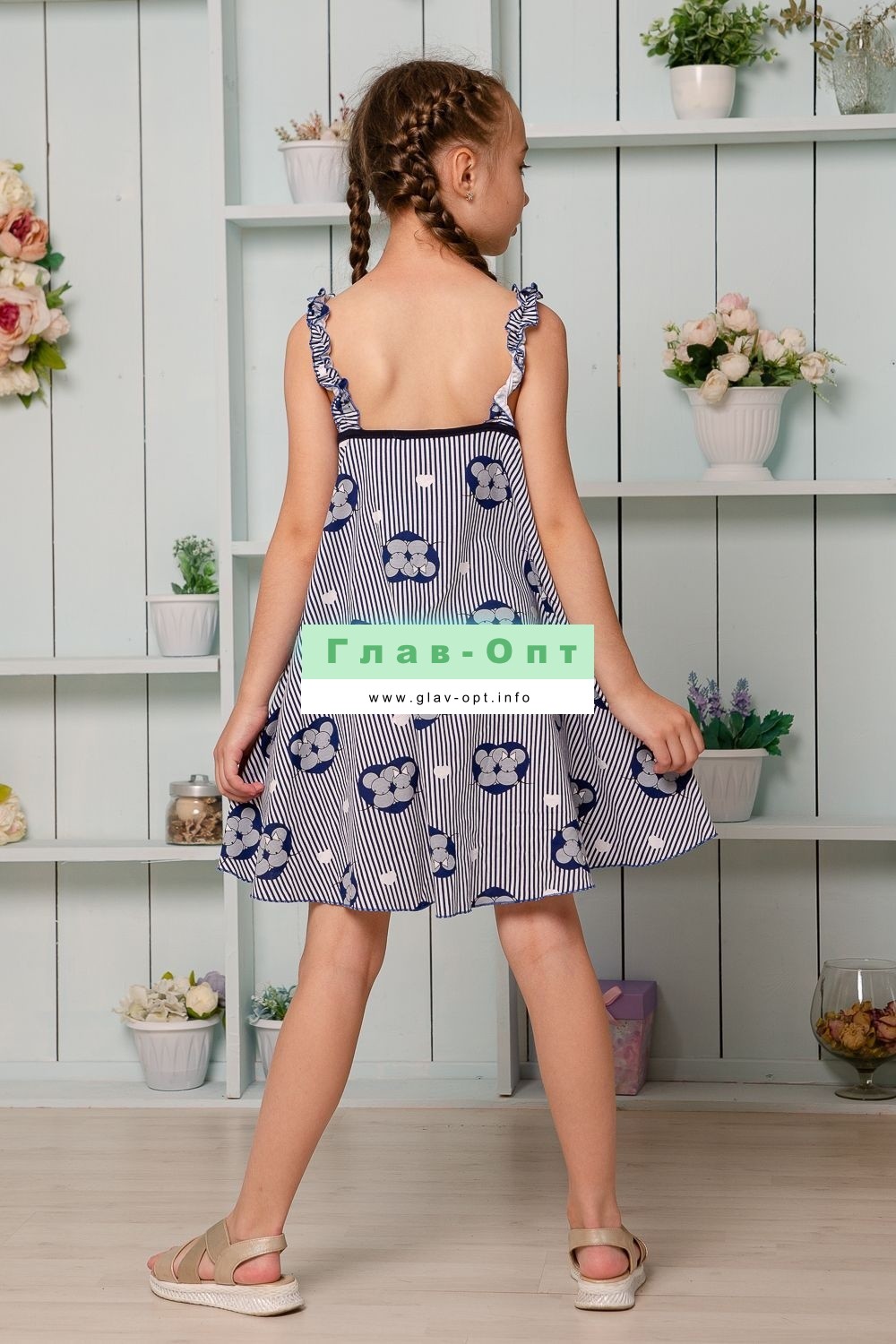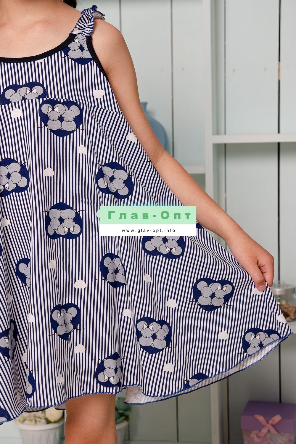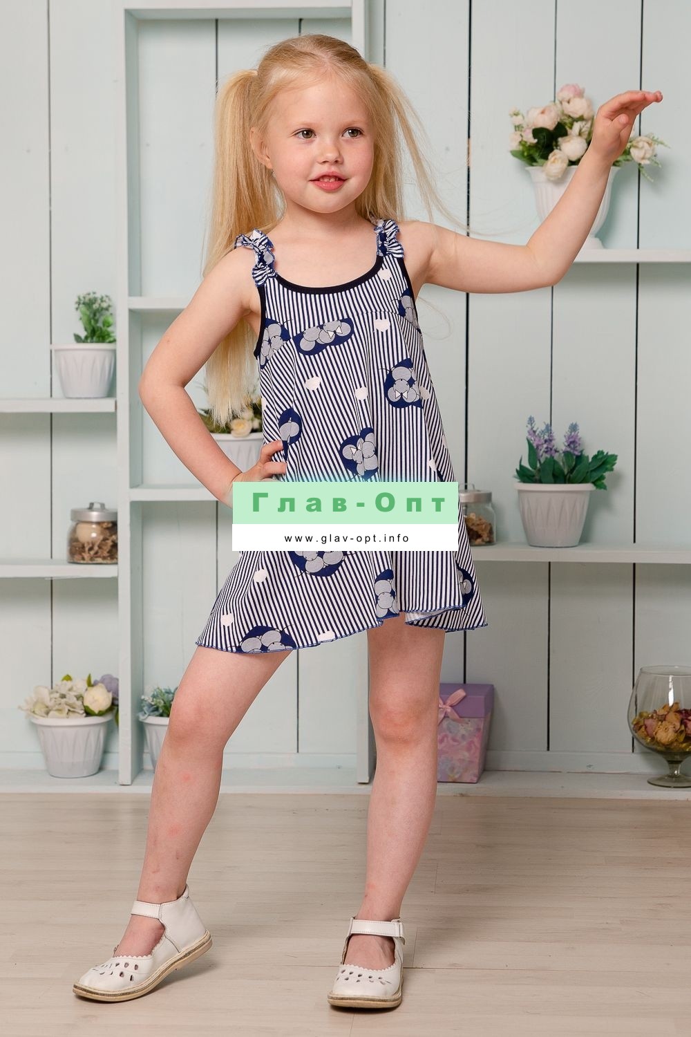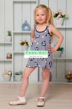 Сарафан детский летний, свободного силуэта с завышенной линией талии. Бретели выполнены из основной ткани собранной на тонкую резинку. Низ изделия обработан декоративной краеобметочной строчкой.