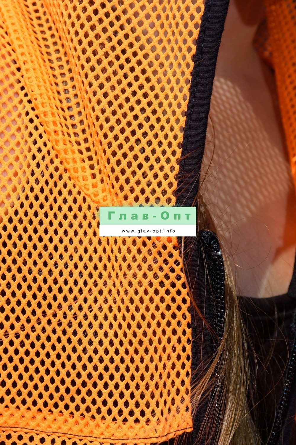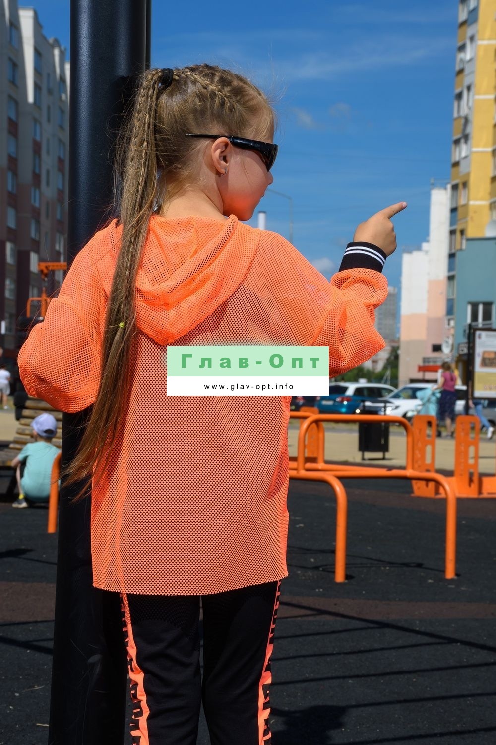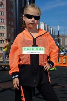 Толстовка прямая, свободная, с капюшоном из сетки, на молнии. Рукав длинный, из сетки, на эластичном манжете. Спинка удлиненная, из сетки. В верхней части полочки расположены кокетки из сетки. На полочку настрочены накладные карманы с клапанами из сетки.