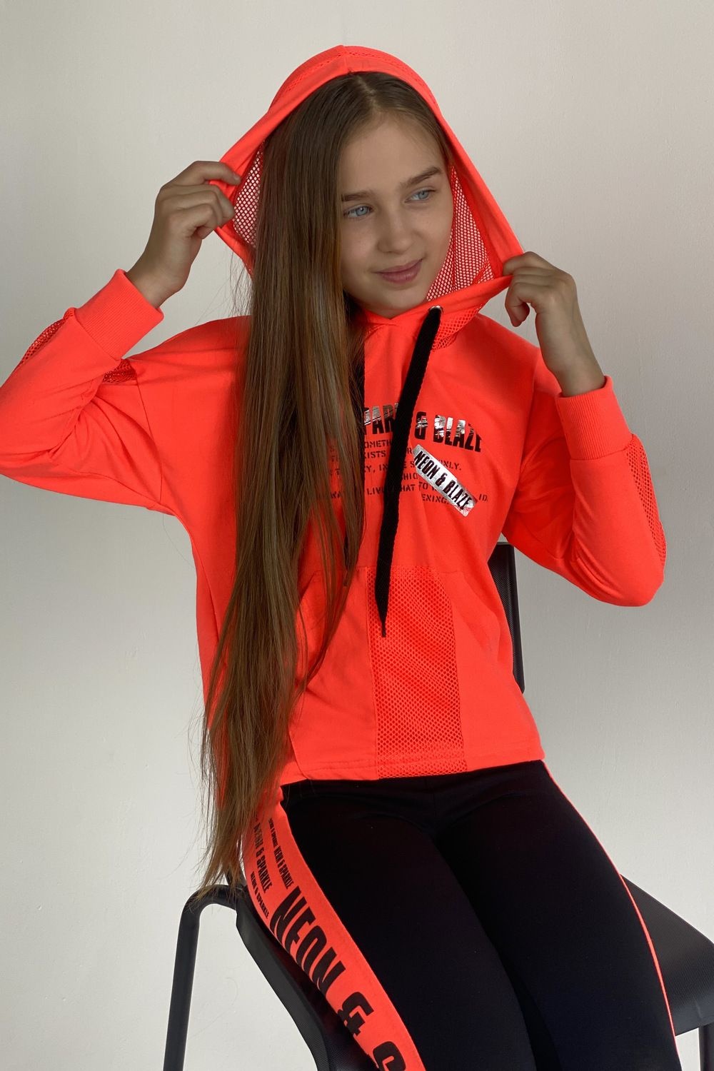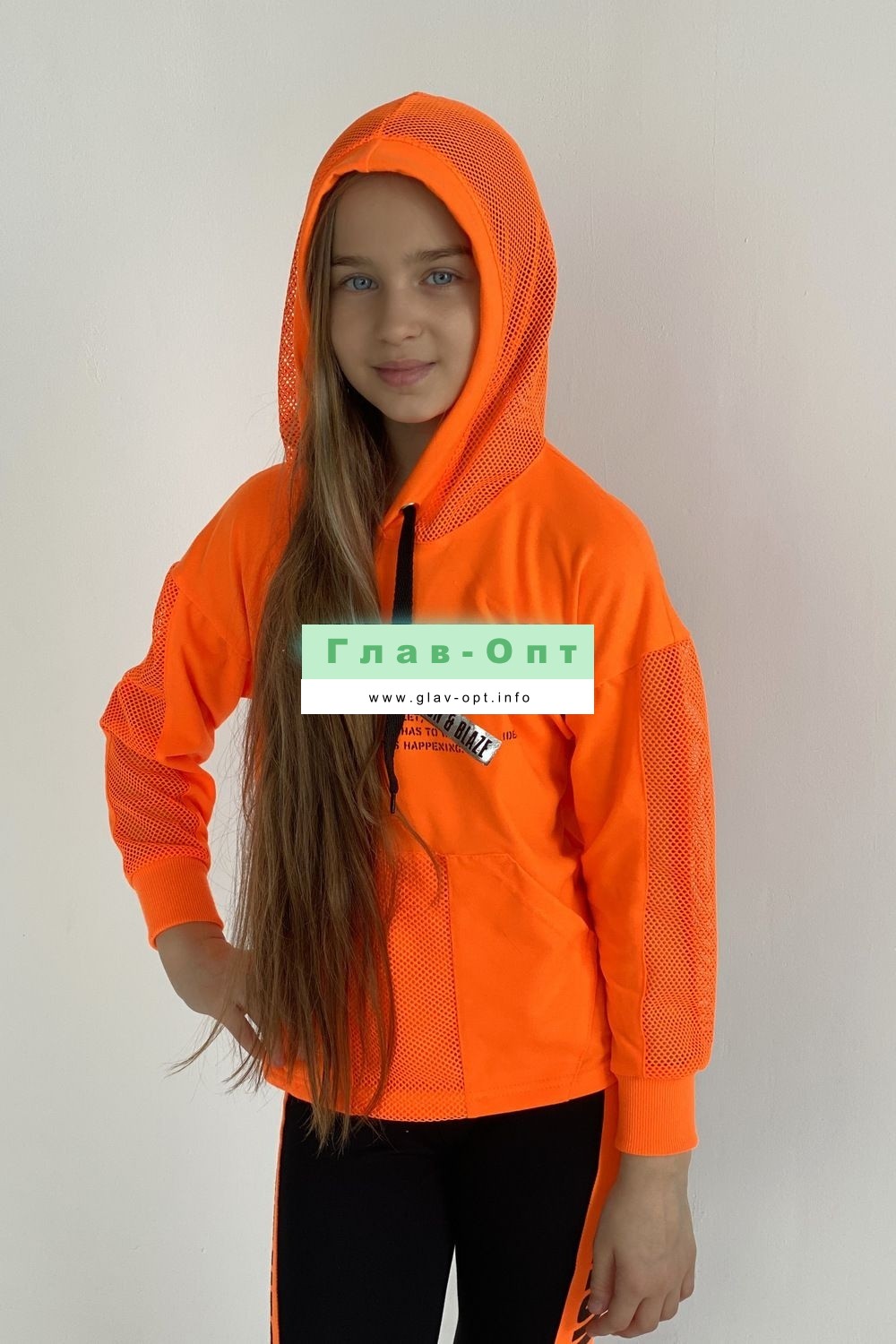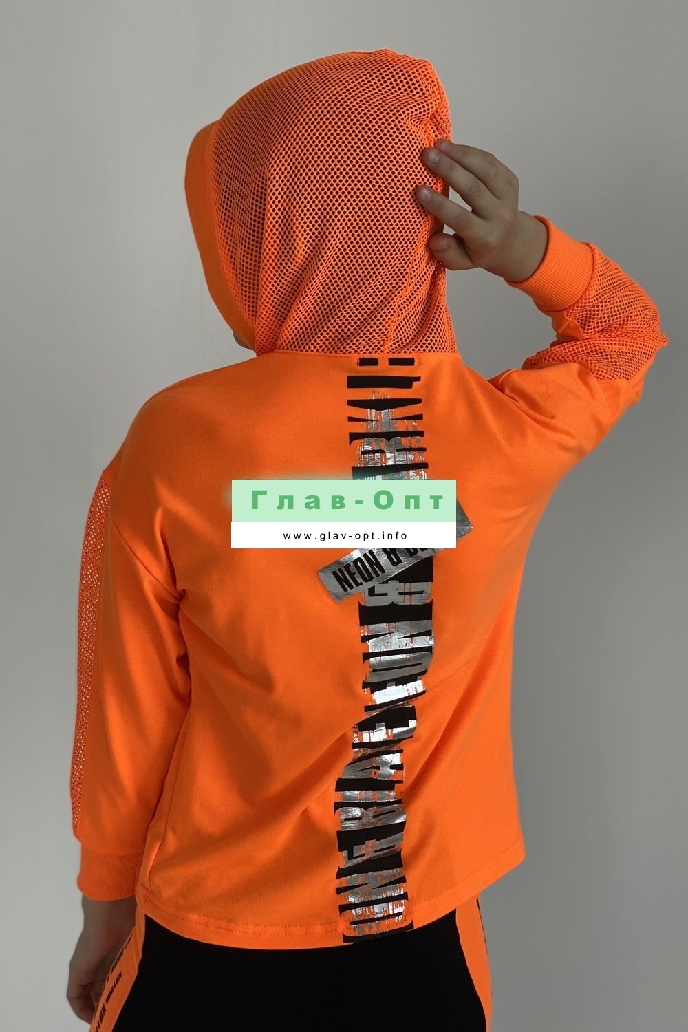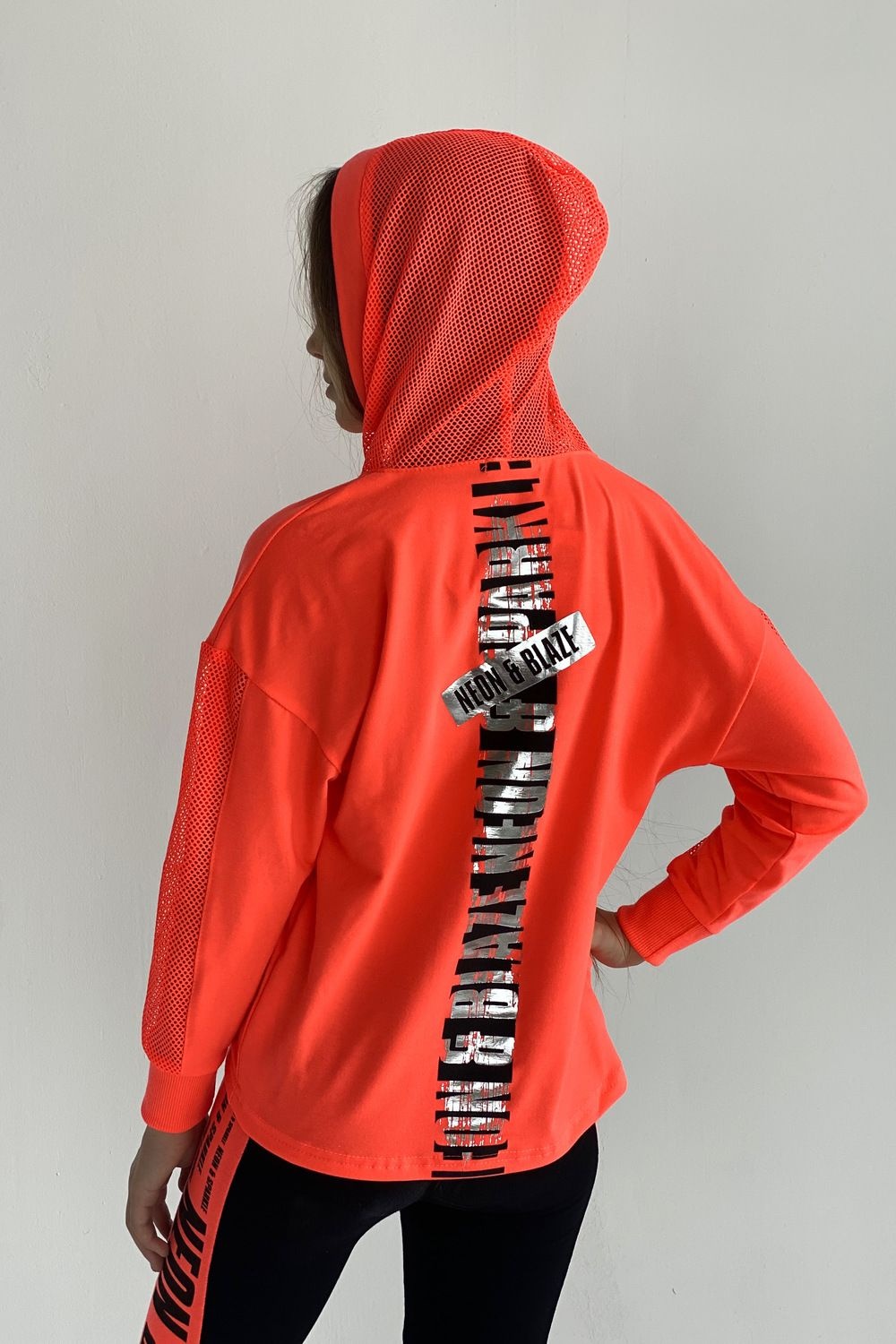 Толстовка прямая, свободная, с капюшоном из сетки, с удлиненной спинкой. Рукав длинный, со вставкой из сетки вдоль рукава, на эластичном манжете. На полочке расположен карман кенгуру .