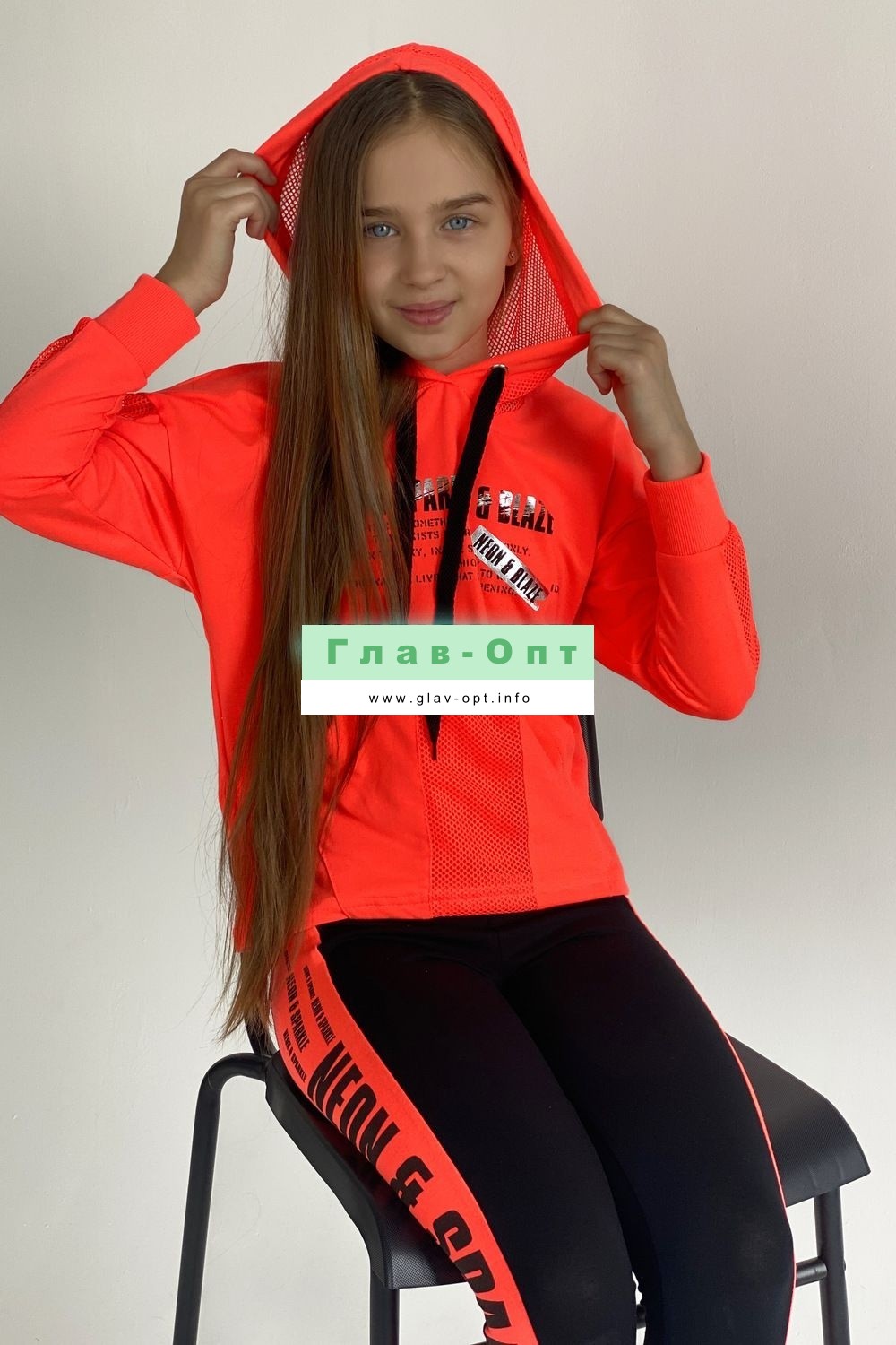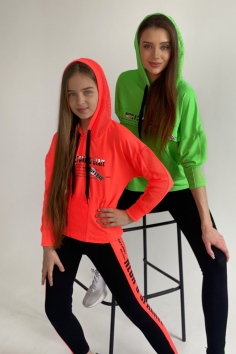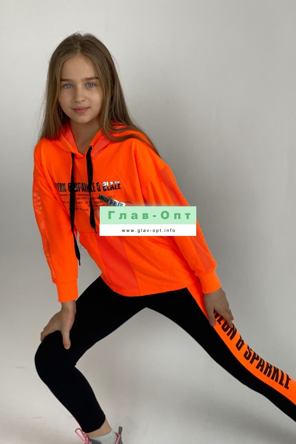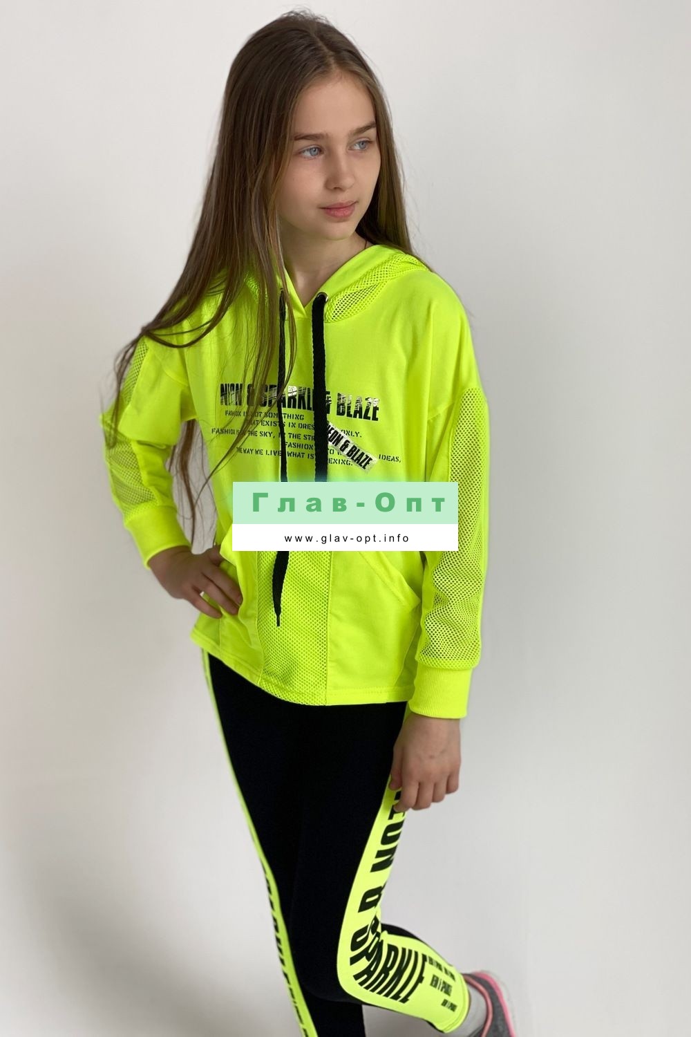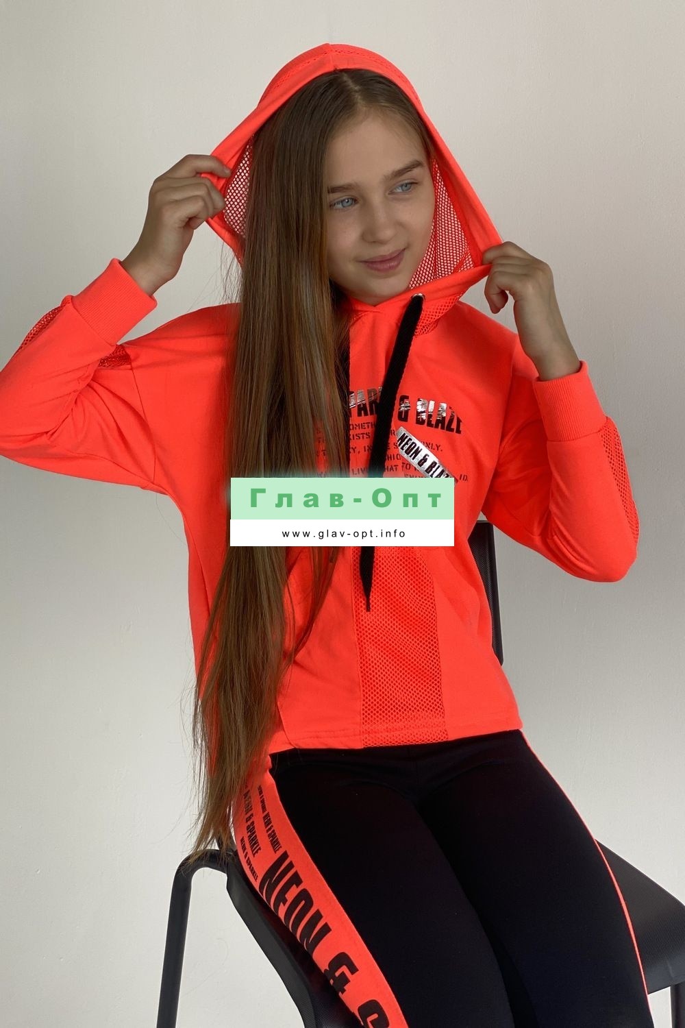 Толстовка прямая, свободная, с капюшоном из сетки, с удлиненной спинкой. Рукав длинный, со вставкой из сетки вдоль рукава, на эластичном манжете. На полочке расположен карман кенгуру .