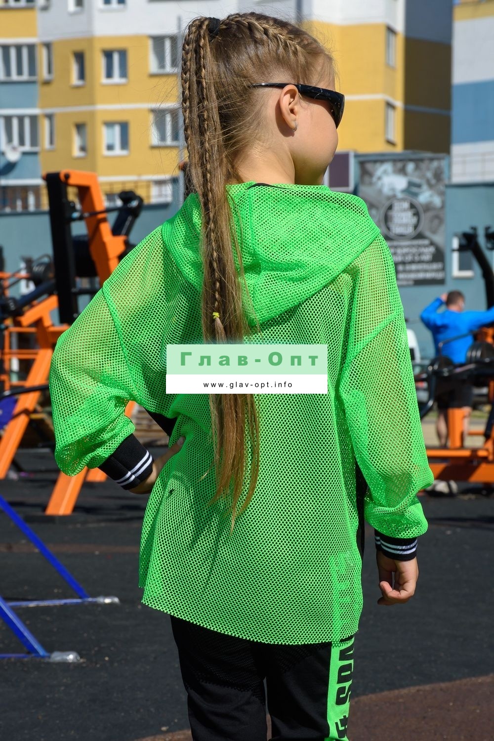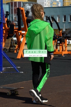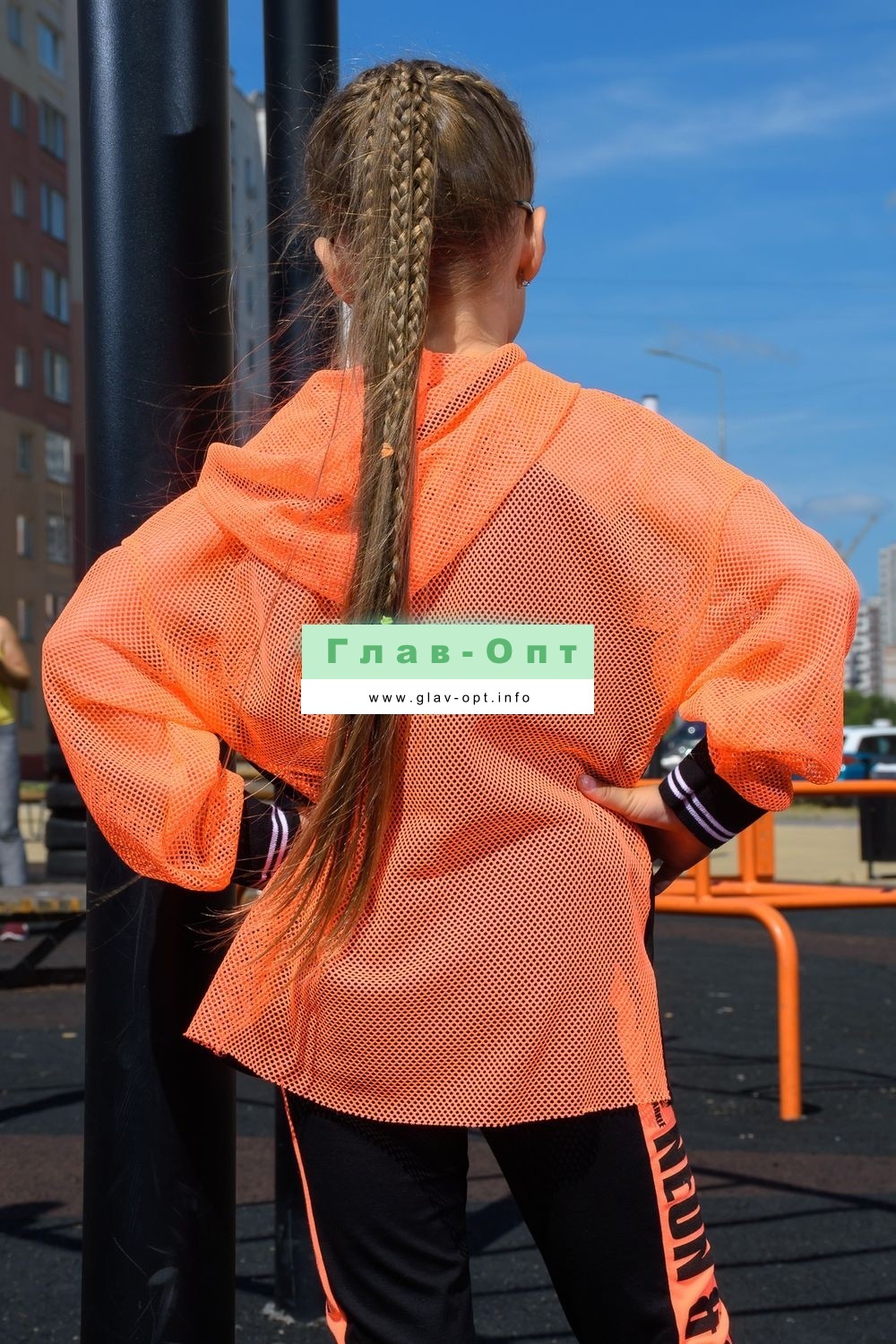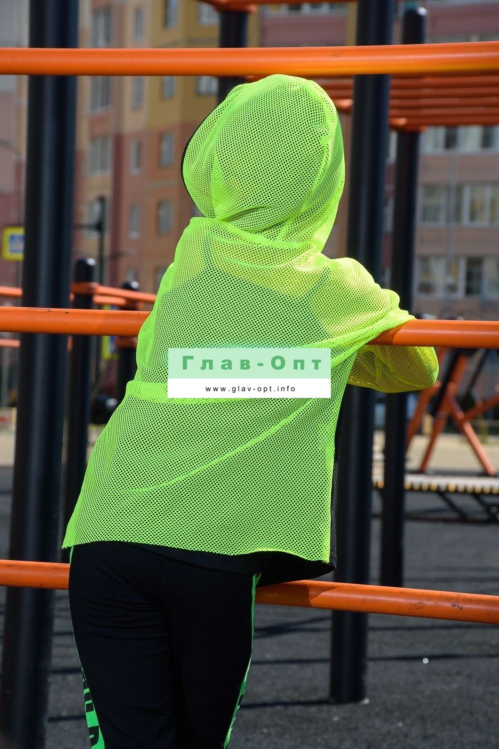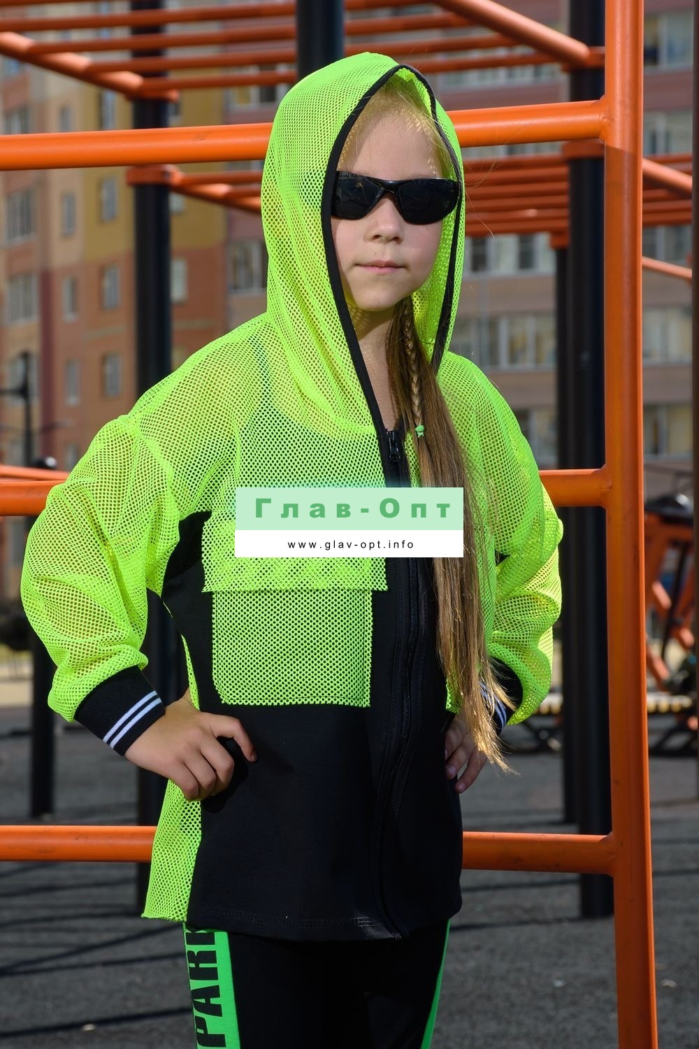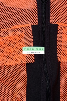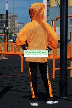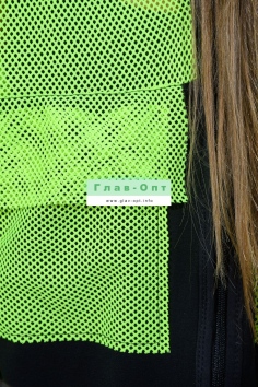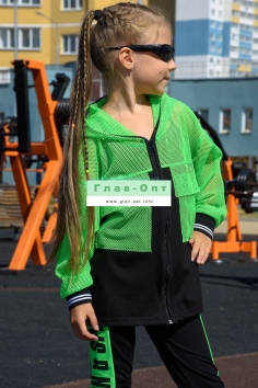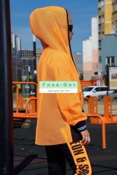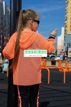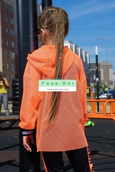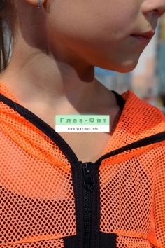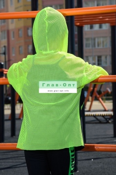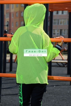 Толстовка прямая, свободная, с капюшоном из сетки, на молнии. Рукав длинный, из сетки, на эластичном манжете. Спинка удлиненная, из сетки. В верхней части полочки расположены кокетки из сетки. На полочку настрочены накладные карманы с клапанами из сетки.
