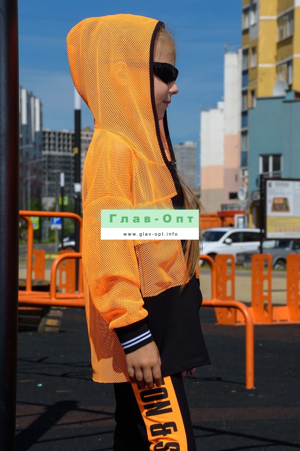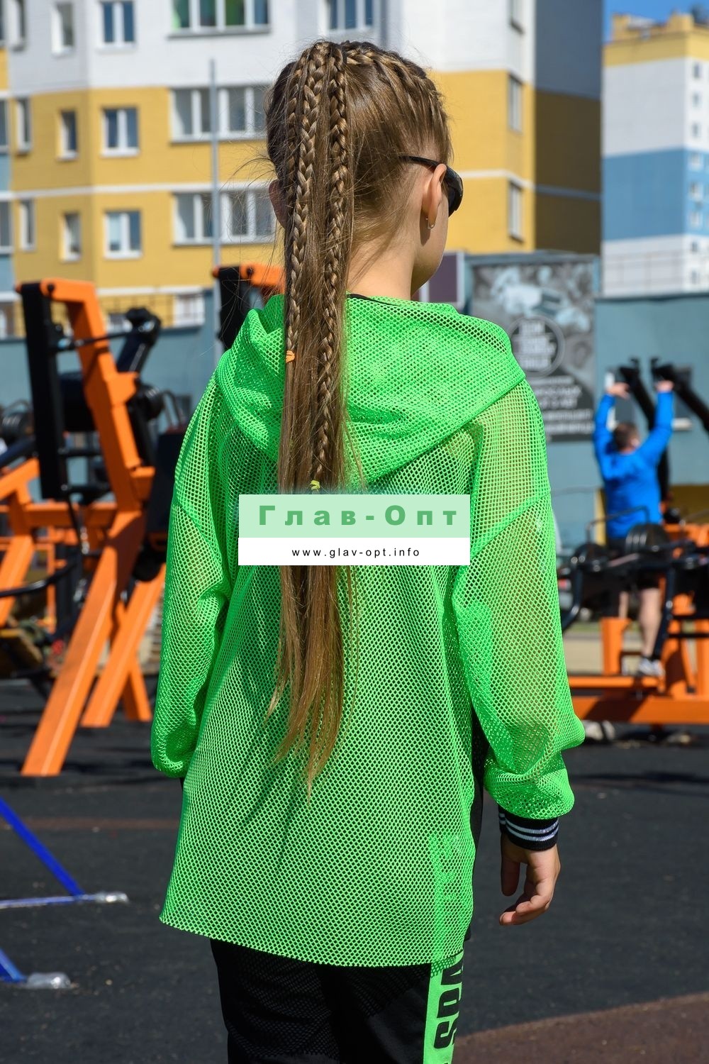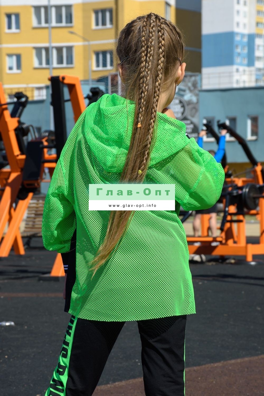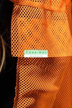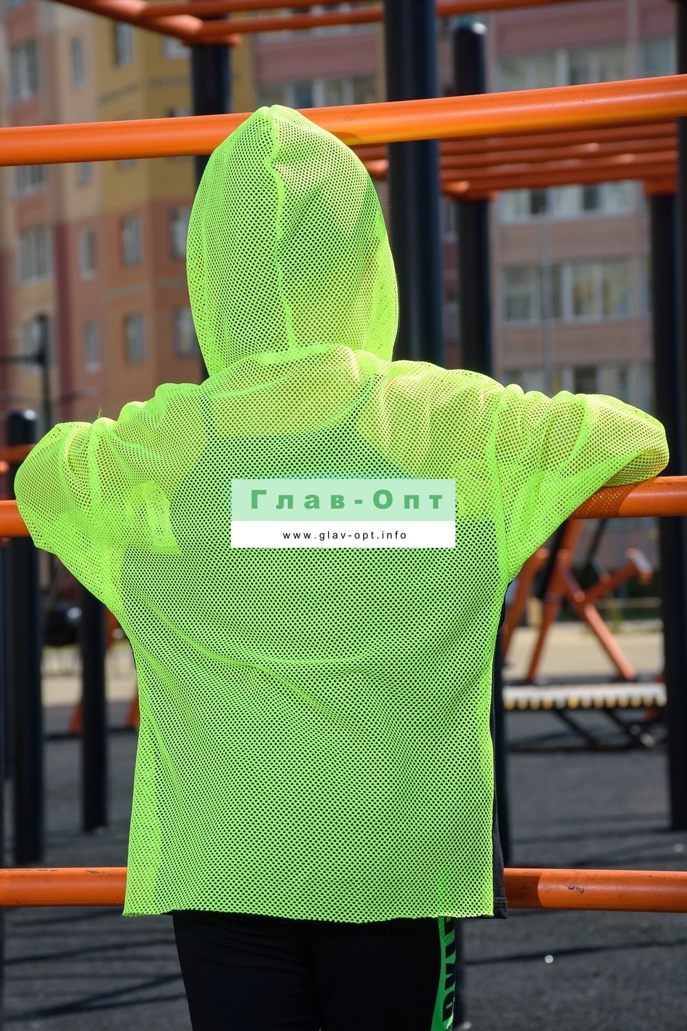 Толстовка прямая, свободная, с капюшоном из сетки, на молнии. Рукав длинный, из сетки, на эластичном манжете. Спинка удлиненная, из сетки. В верхней части полочки расположены кокетки из сетки. На полочку настрочены накладные карманы с клапанами из сетки.