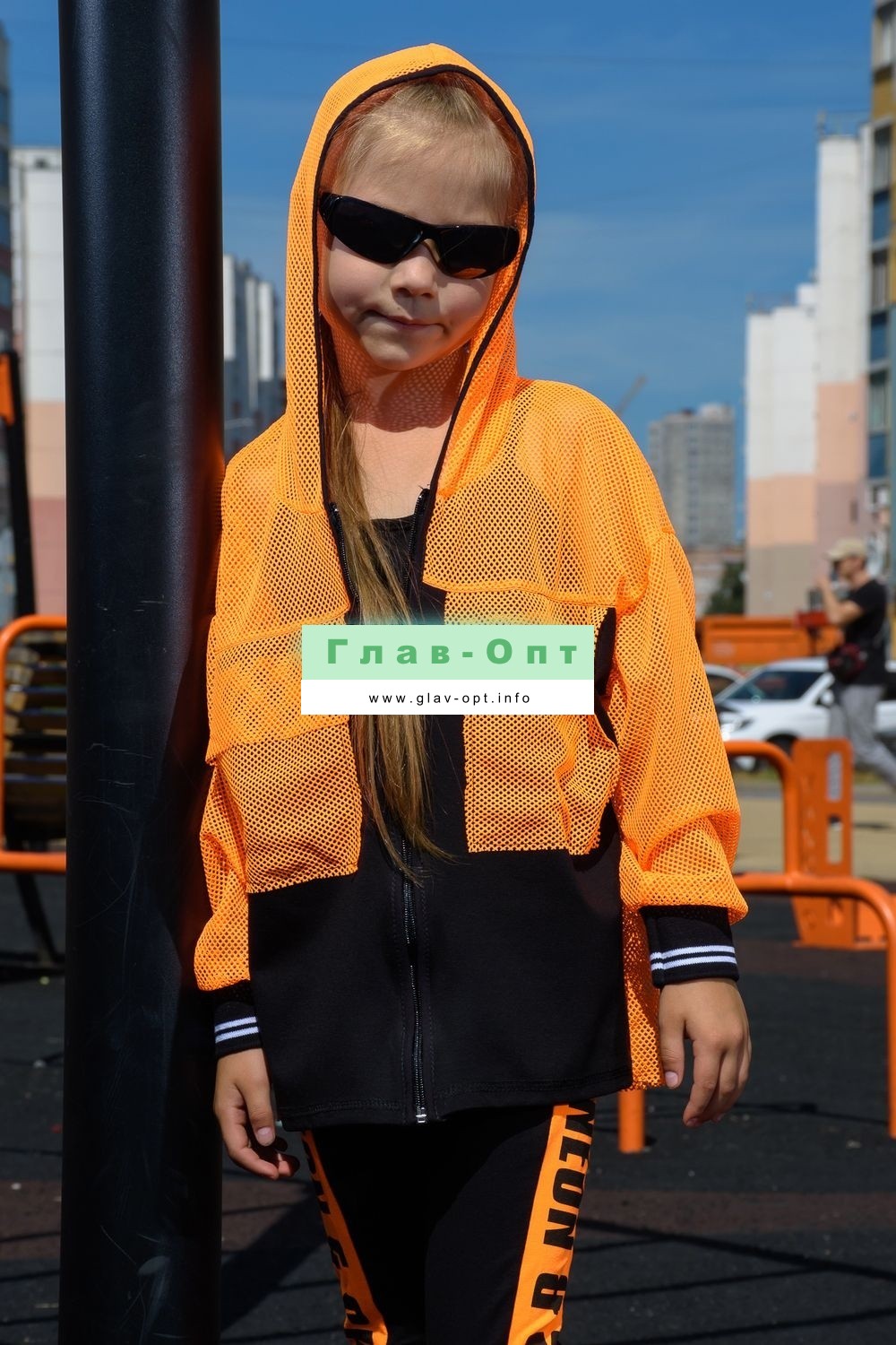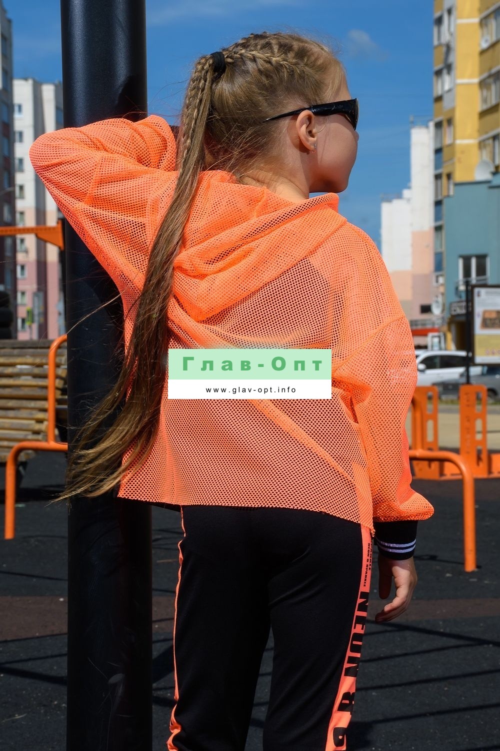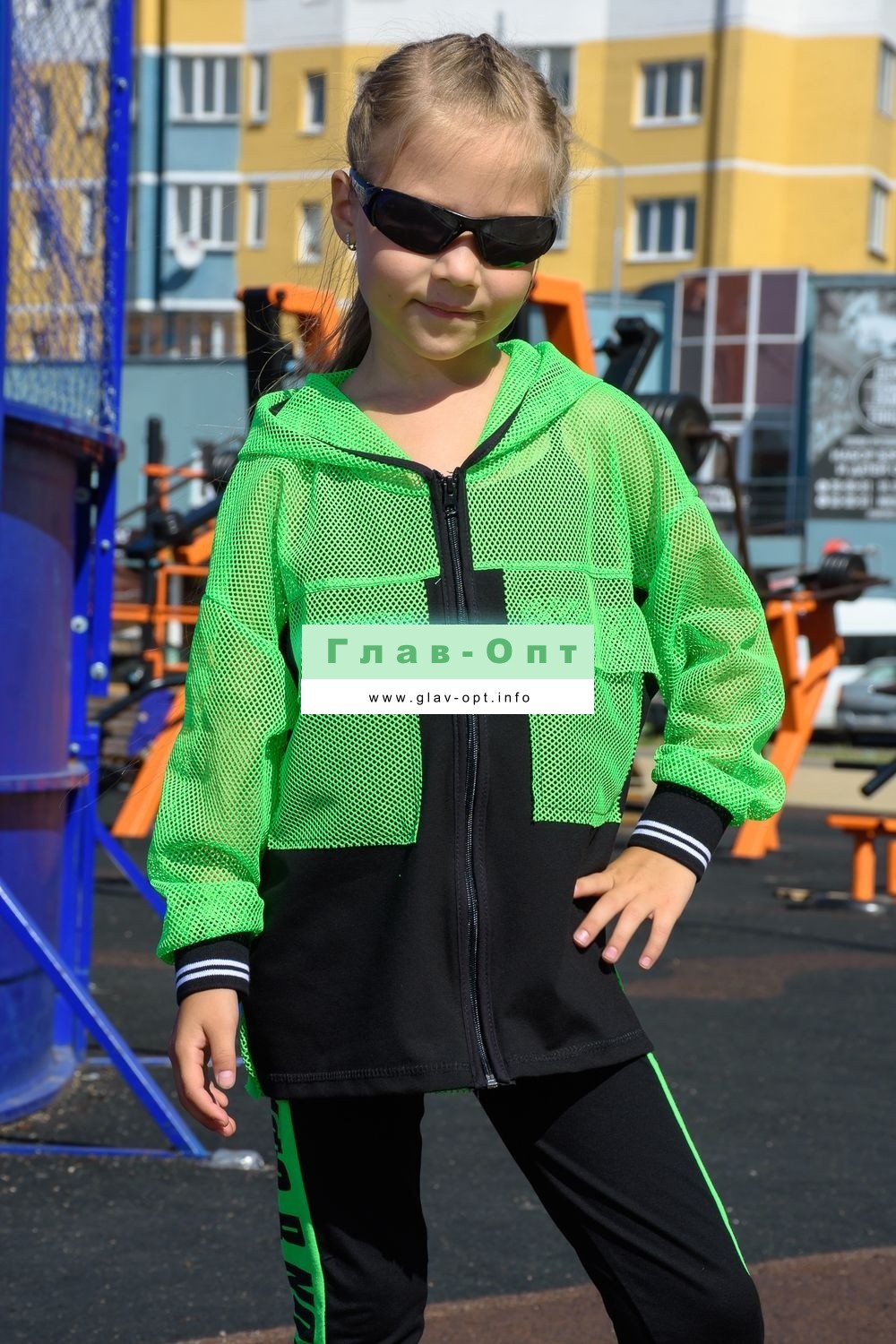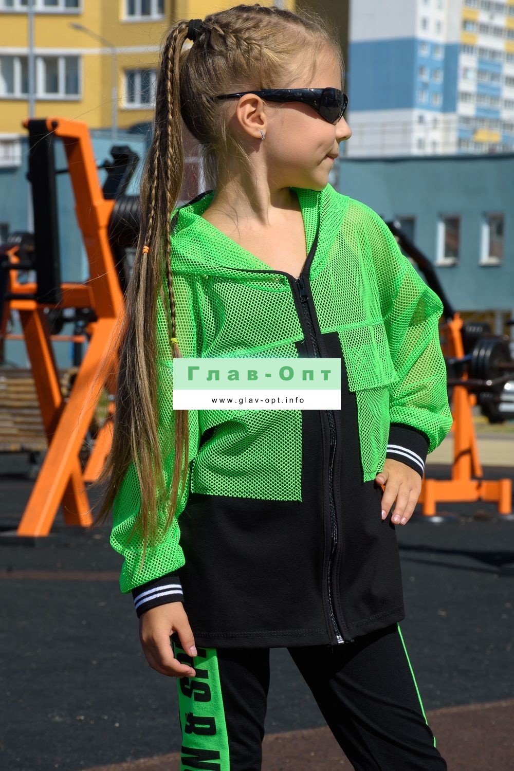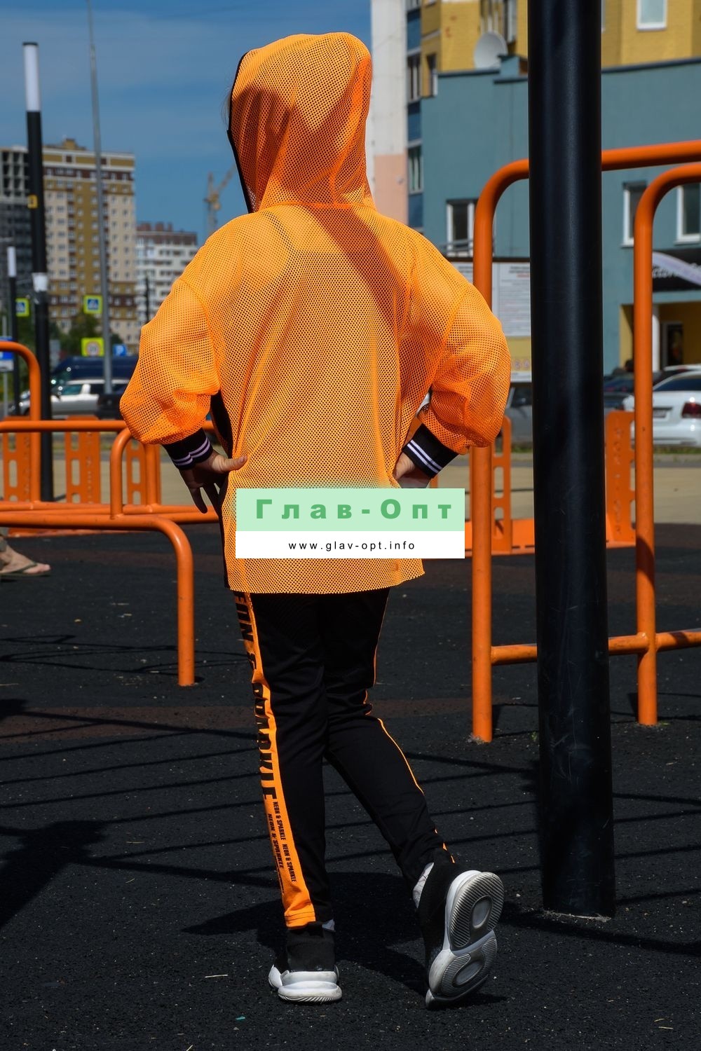 Толстовка прямая, свободная, с капюшоном из сетки, на молнии. Рукав длинный, из сетки, на эластичном манжете. Спинка удлиненная, из сетки. В верхней части полочки расположены кокетки из сетки. На полочку настрочены накладные карманы с клапанами из сетки.