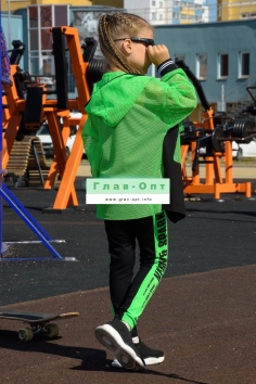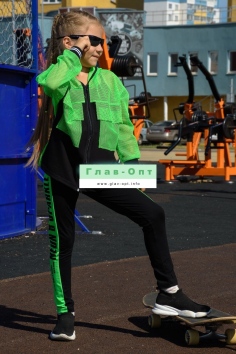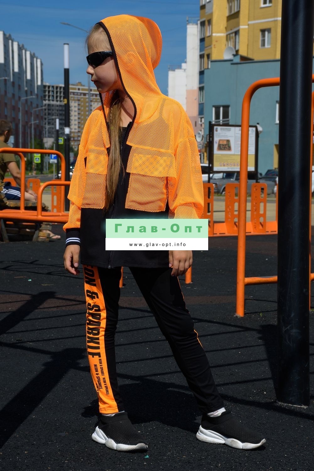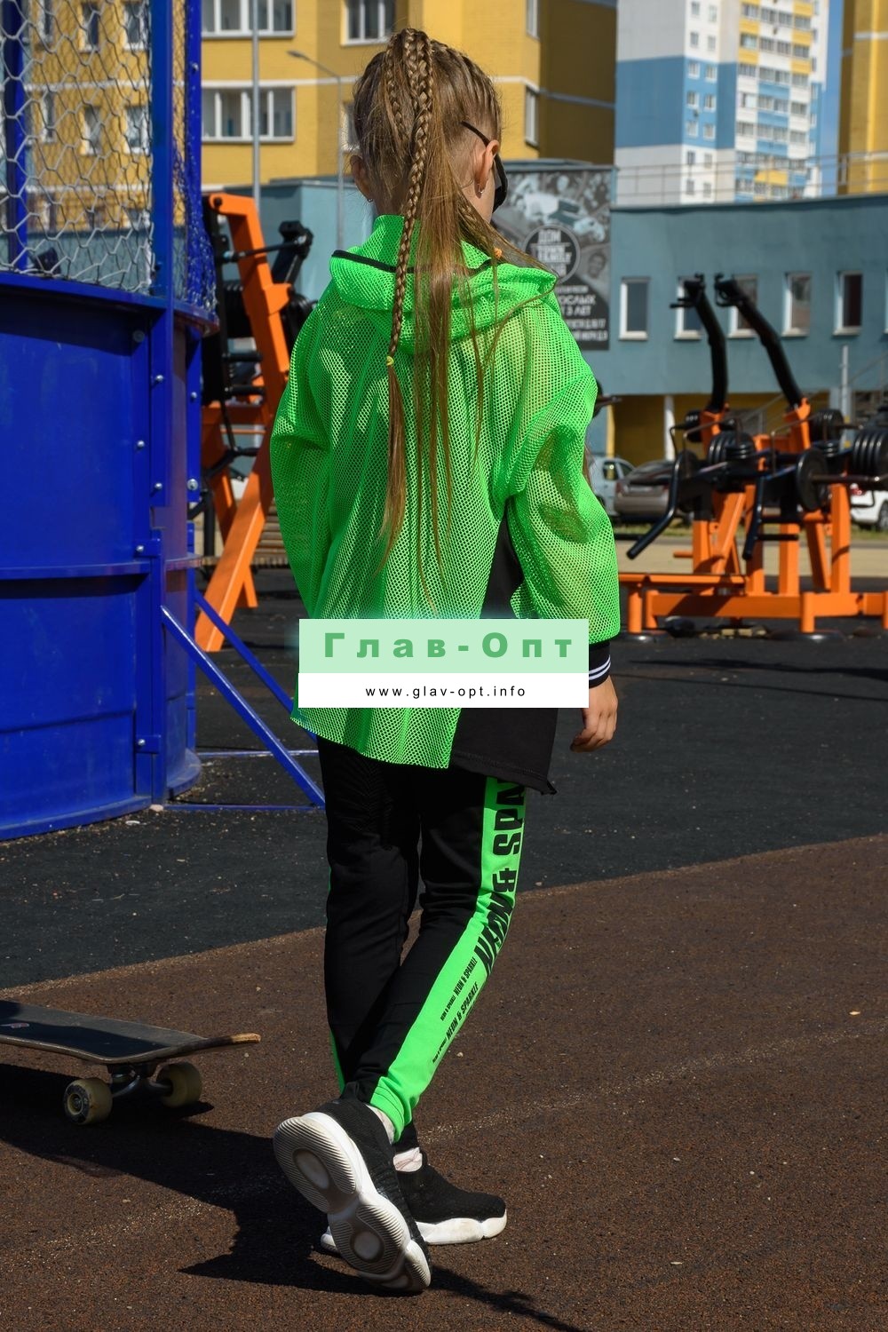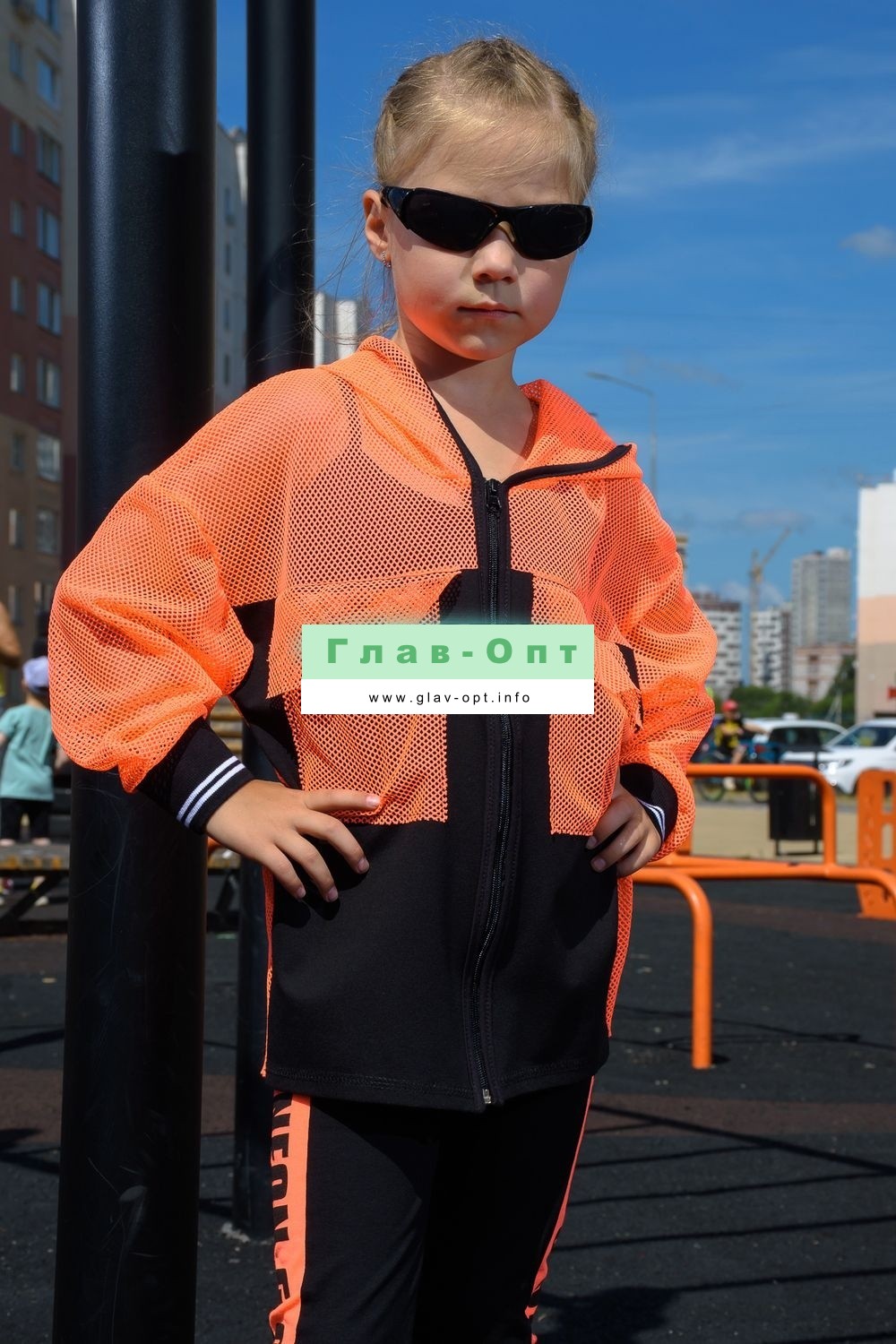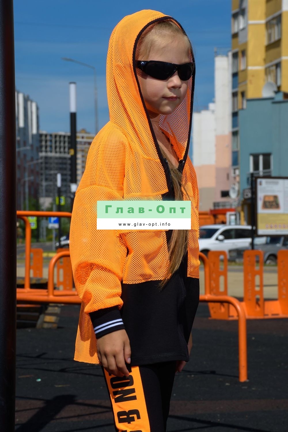 Толстовка прямая, свободная, с капюшоном из сетки, на молнии. Рукав длинный, из сетки, на эластичном манжете. Спинка удлиненная, из сетки. В верхней части полочки расположены кокетки из сетки. На полочку настрочены накладные карманы с клапанами из сетки.
