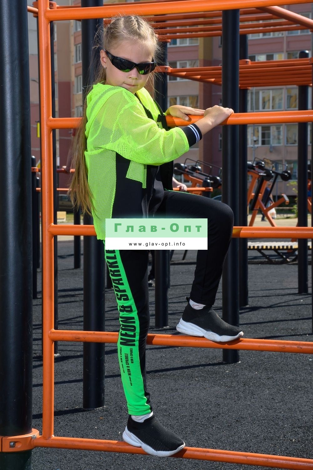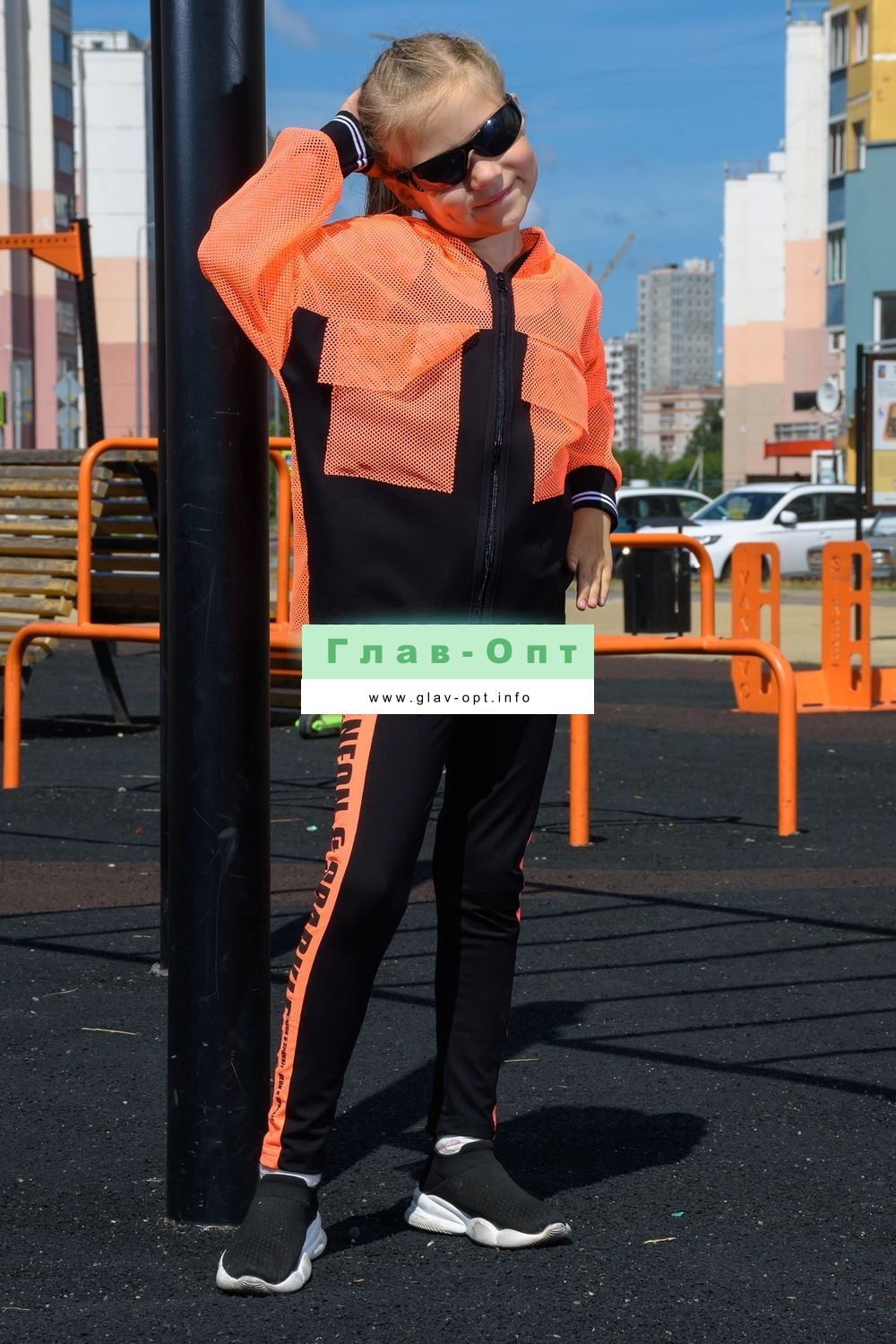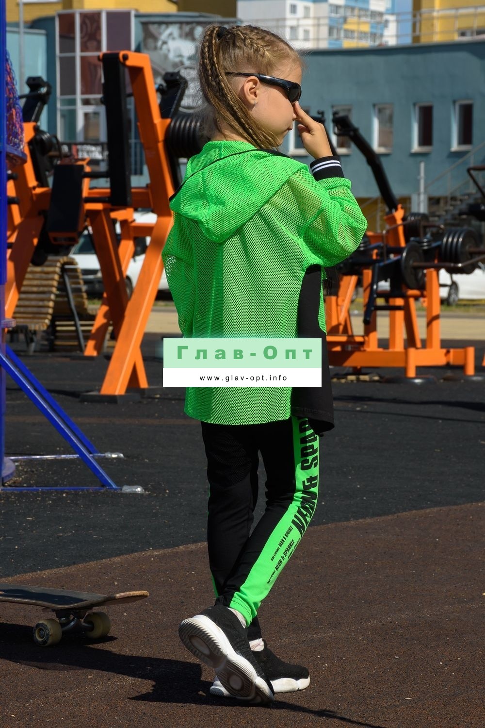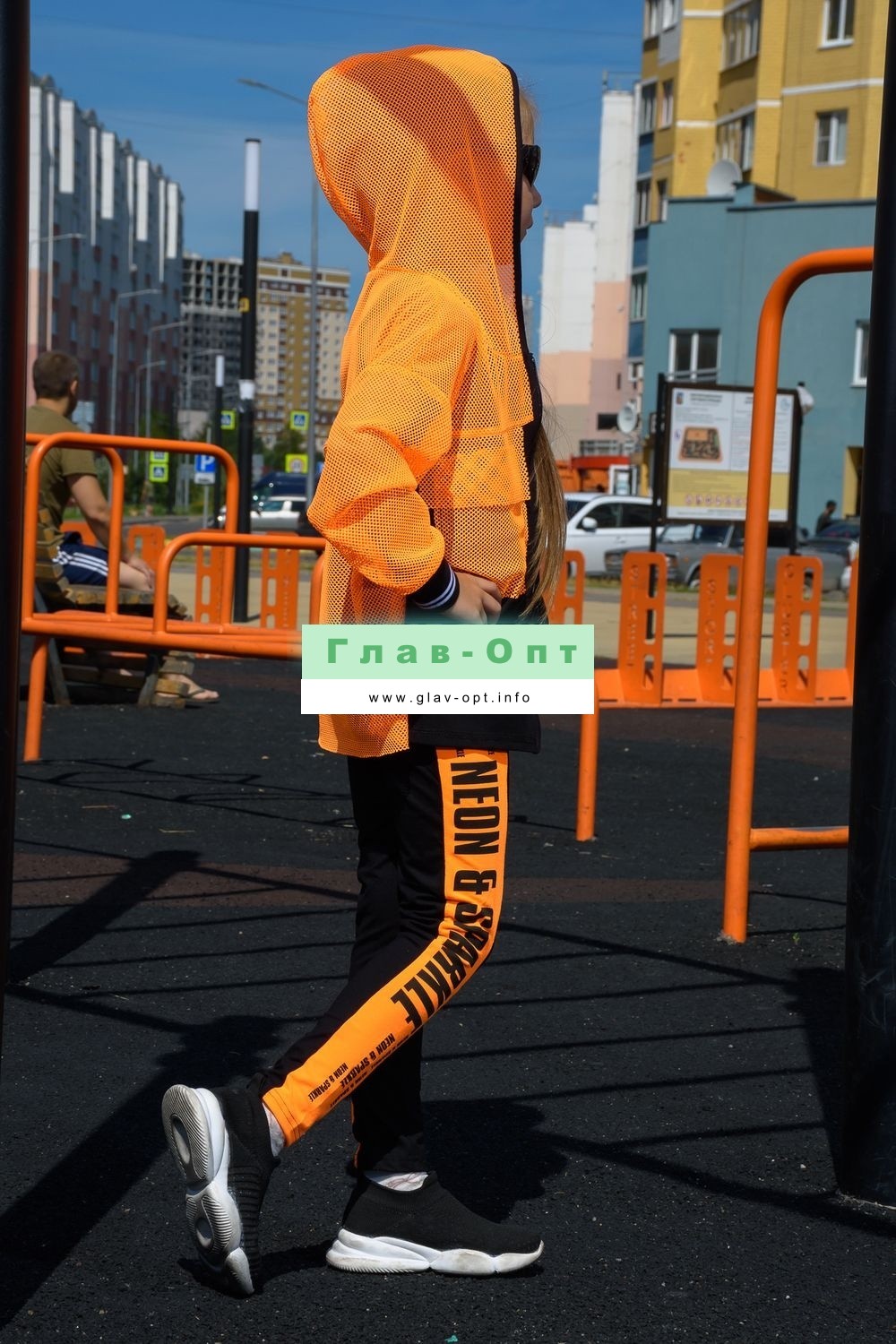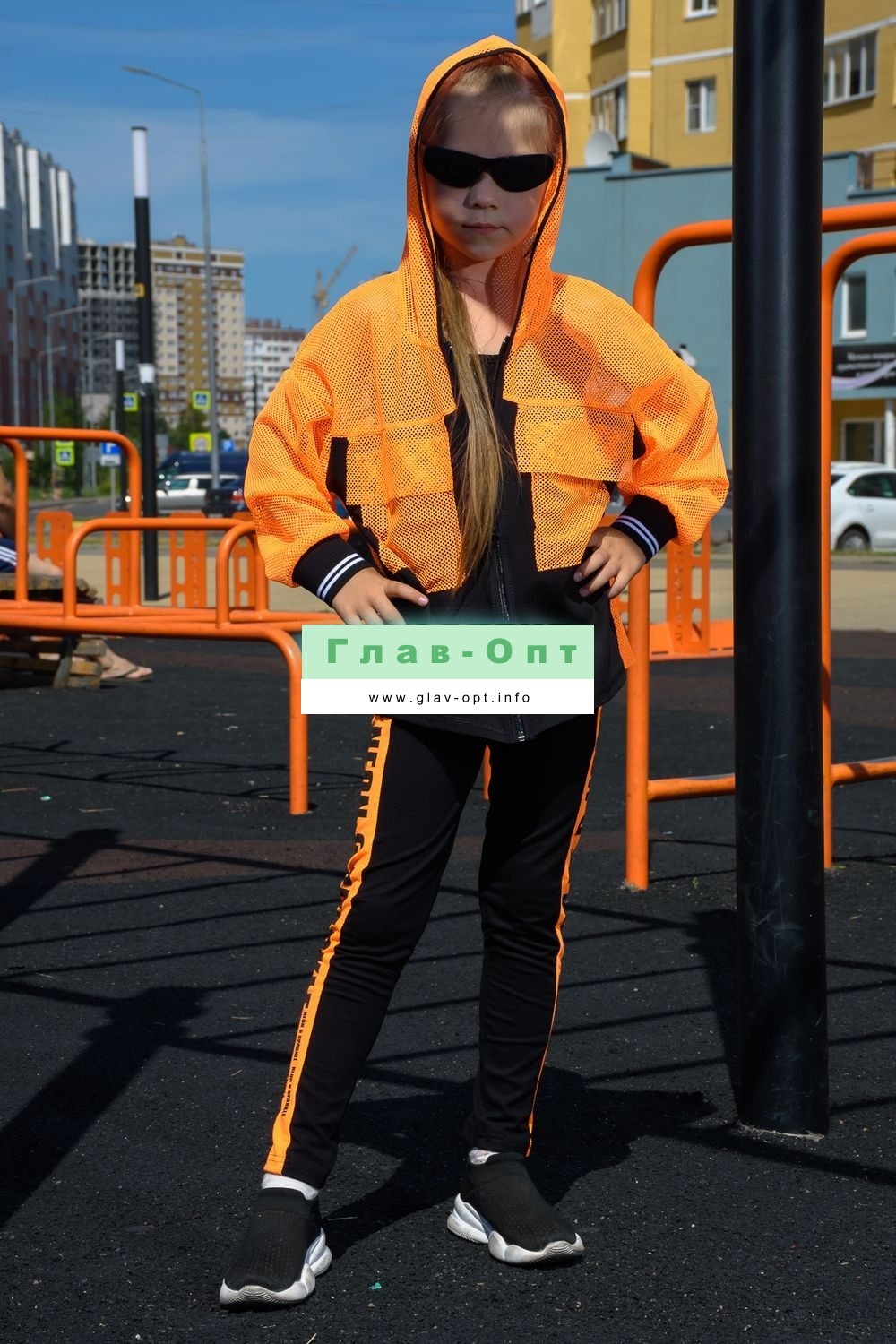Толстовка прямая, свободная, с капюшоном из сетки, на молнии. Рукав длинный, из сетки, на эластичном манжете. Спинка удлиненная, из сетки. В верхней части полочки расположены кокетки из сетки. На полочку настрочены накладные карманы с клапанами из сетки.