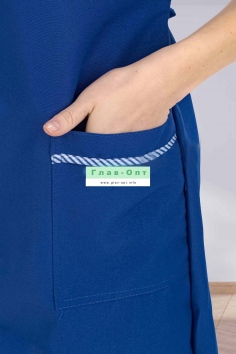 Халат женский укороченный прямого силуэта с центральной застежкой на молнию. Полочка с двумя нижними накладными карманами и разрезами по боковым швам, спинка без отделки. Рукав короткий, втачной. Нижний слой отложного полуворотника выполнен из контрастной ткани. Объем талии регулируется двумя полупоясами. Все срезы халата обработаны капроновым кантом. Для увеличения прочности халата выполнено дополнительное усиление швов центральной застежки и карманов. Халат предназначен для защиты от общепроизводственных загрязнений.