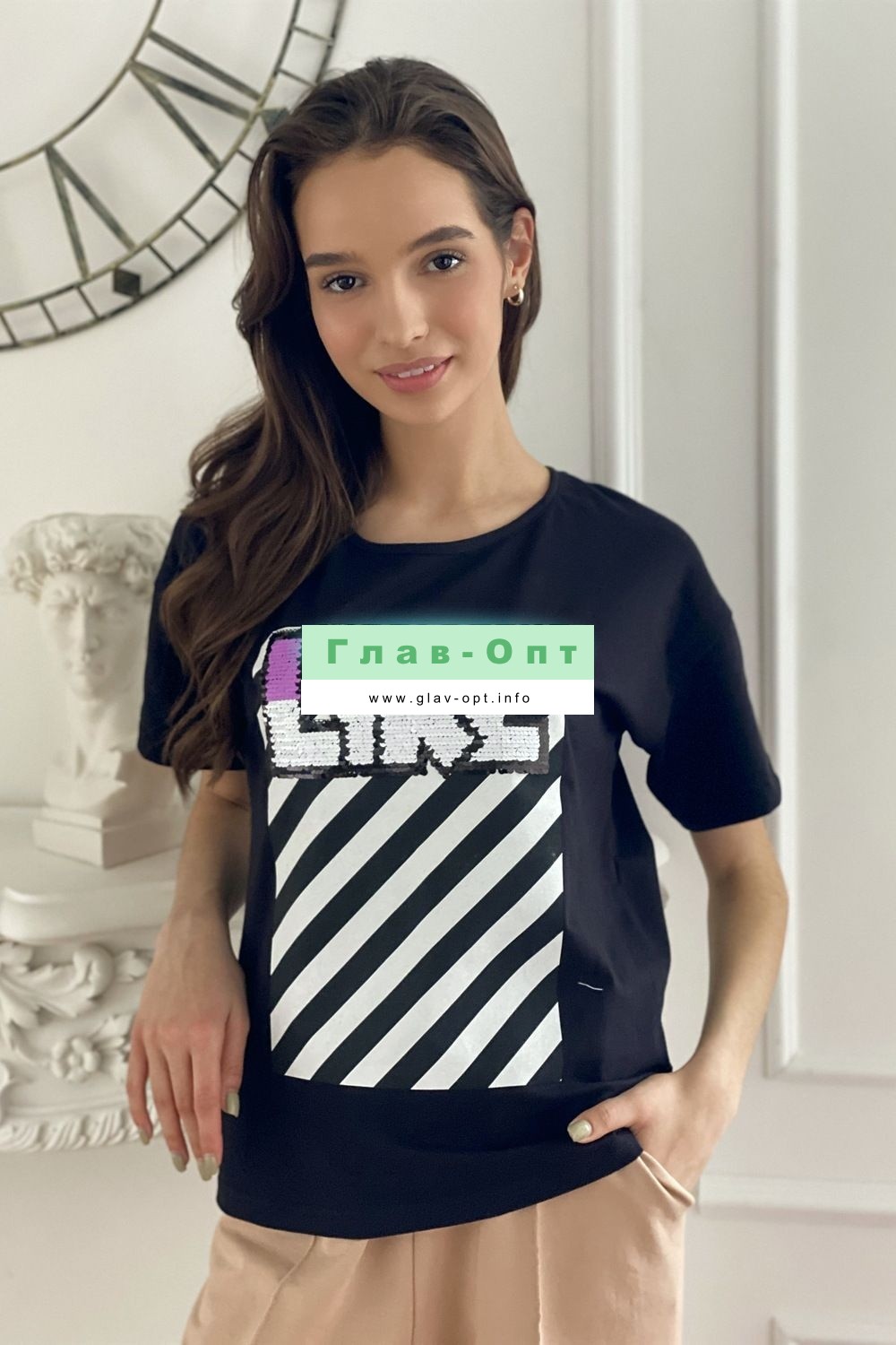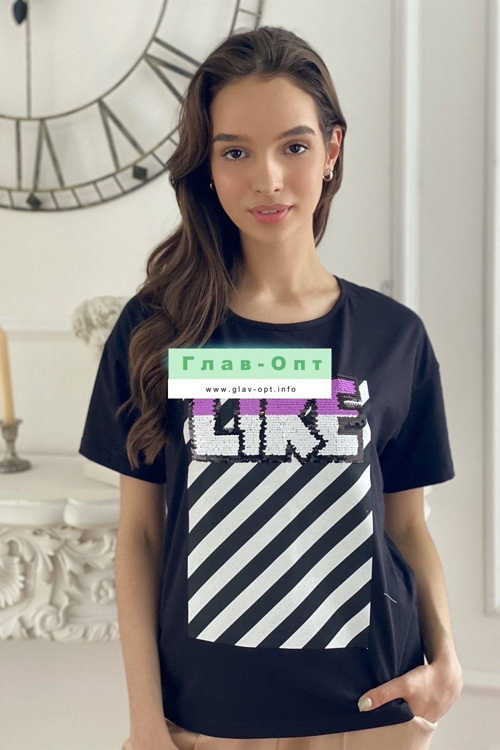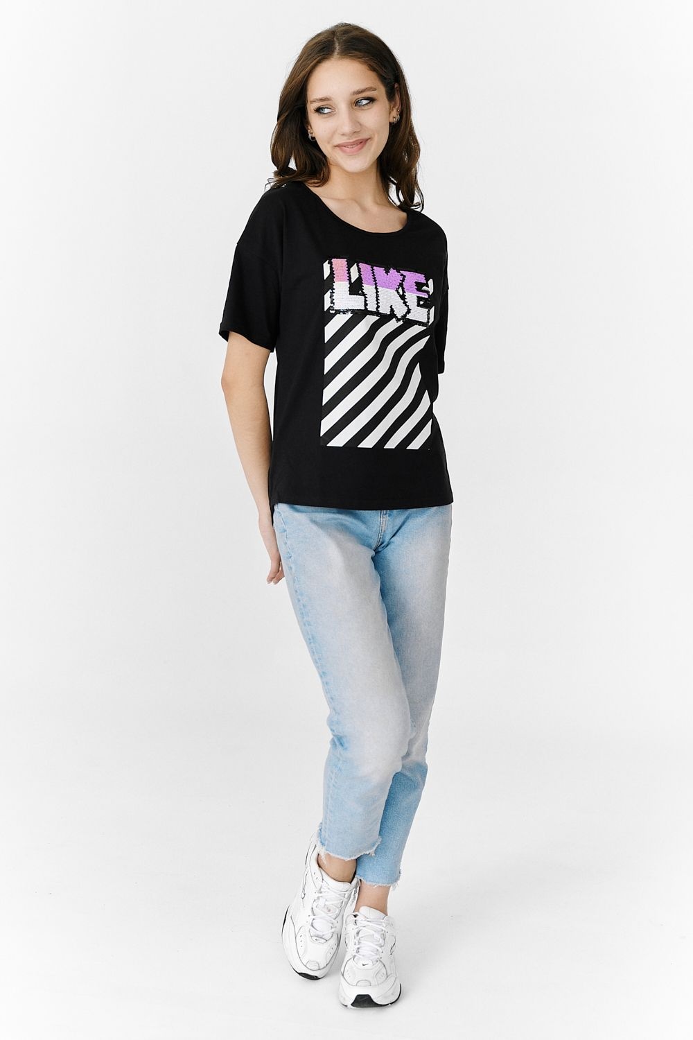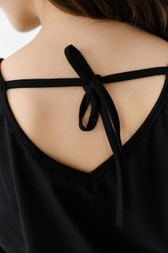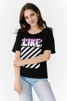 Футболка прямого силуэта, с округлой горловиной спереди и V-образной на спинке, с удлиненной спинкой. Рукав короткий. В верхней части спинки обработан фигурный вырез со шнуром. Горловина обработана бейкой из основного полотна. На полочке эффектная печать с пайетками