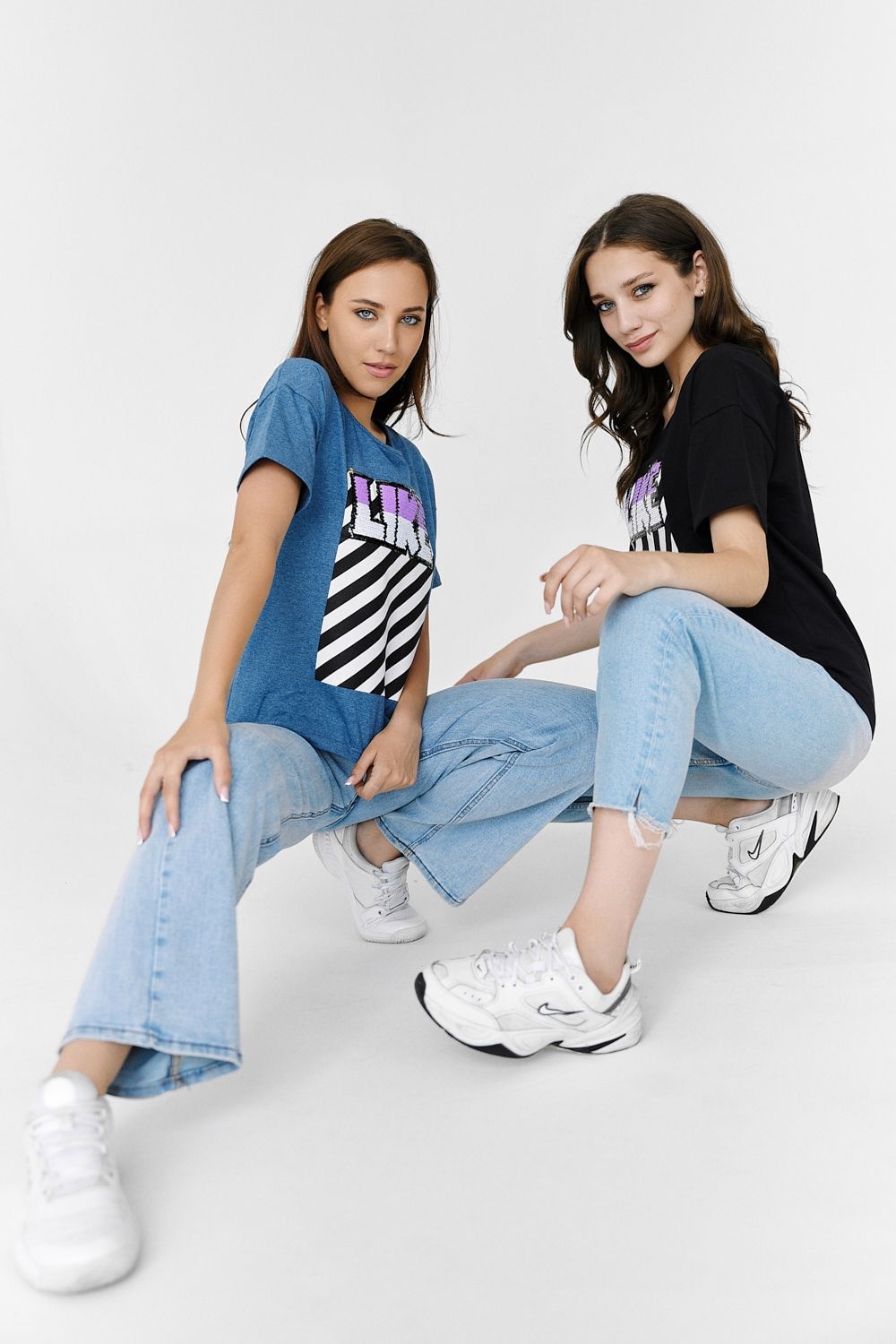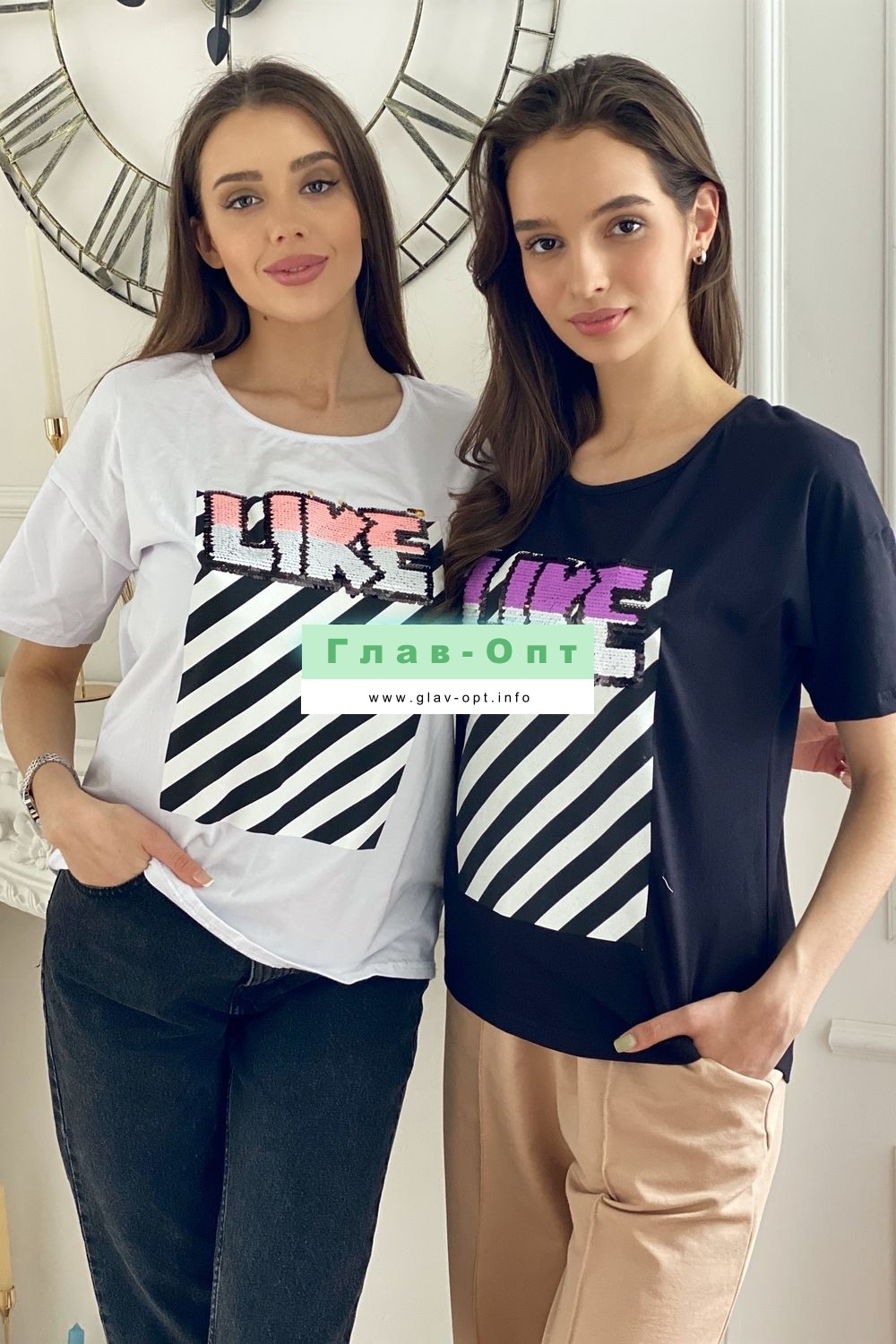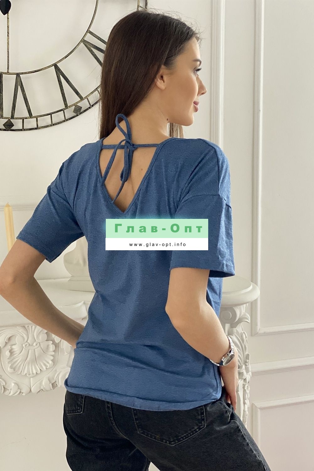 Футболка прямого силуэта, с округлой горловиной спереди и V-образной на спинке, с удлиненной спинкой. Рукав короткий. В верхней части спинки обработан фигурный вырез со шнуром. Горловина обработана бейкой из основного полотна. На полочке эффектная печать с пайетками