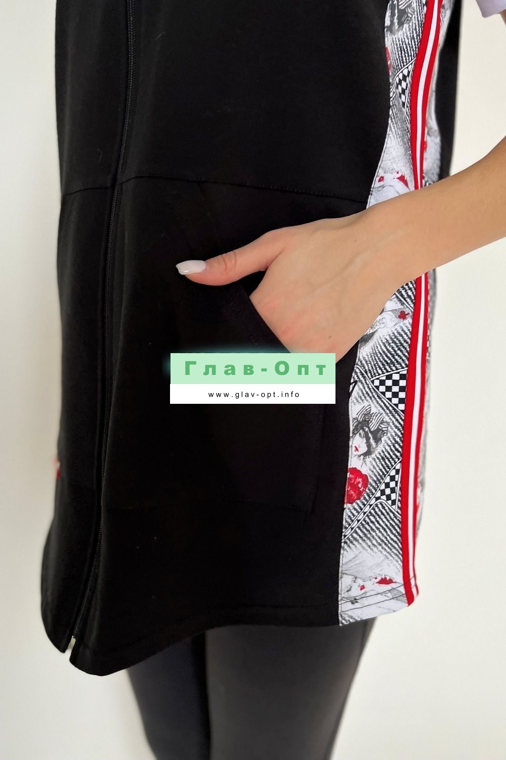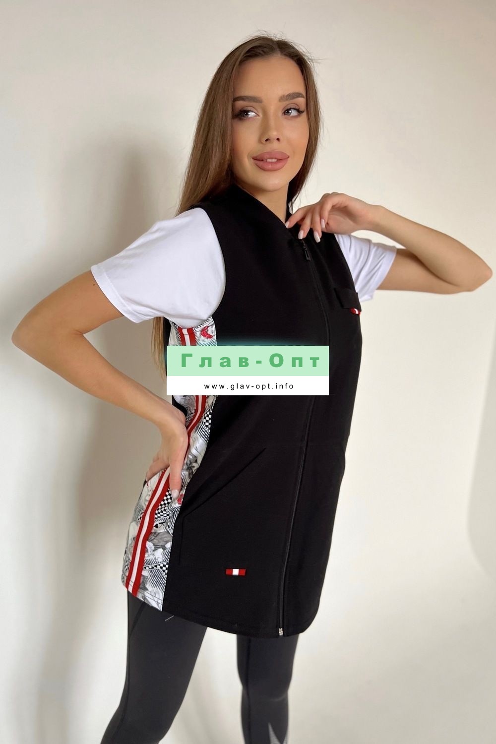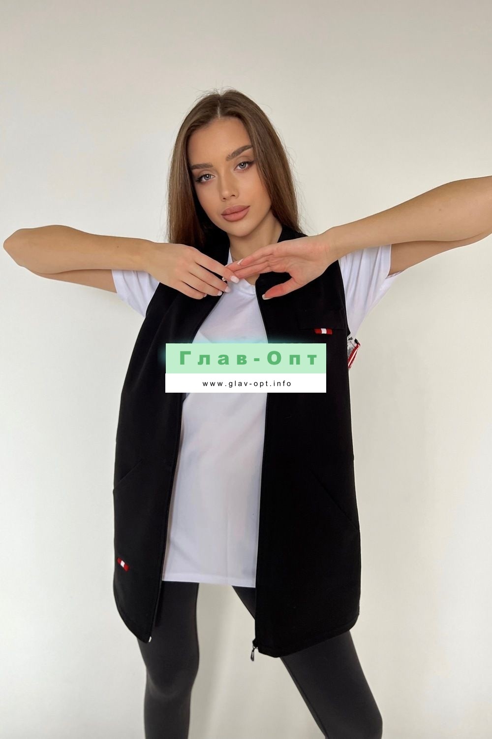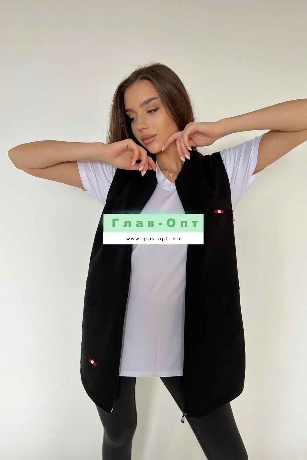 Жилет женский на молнии, прямого силуэта, спереди два кармана.