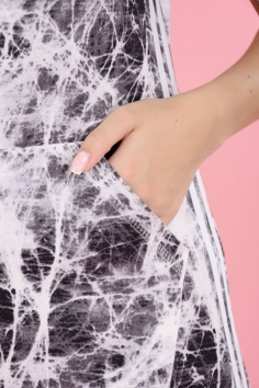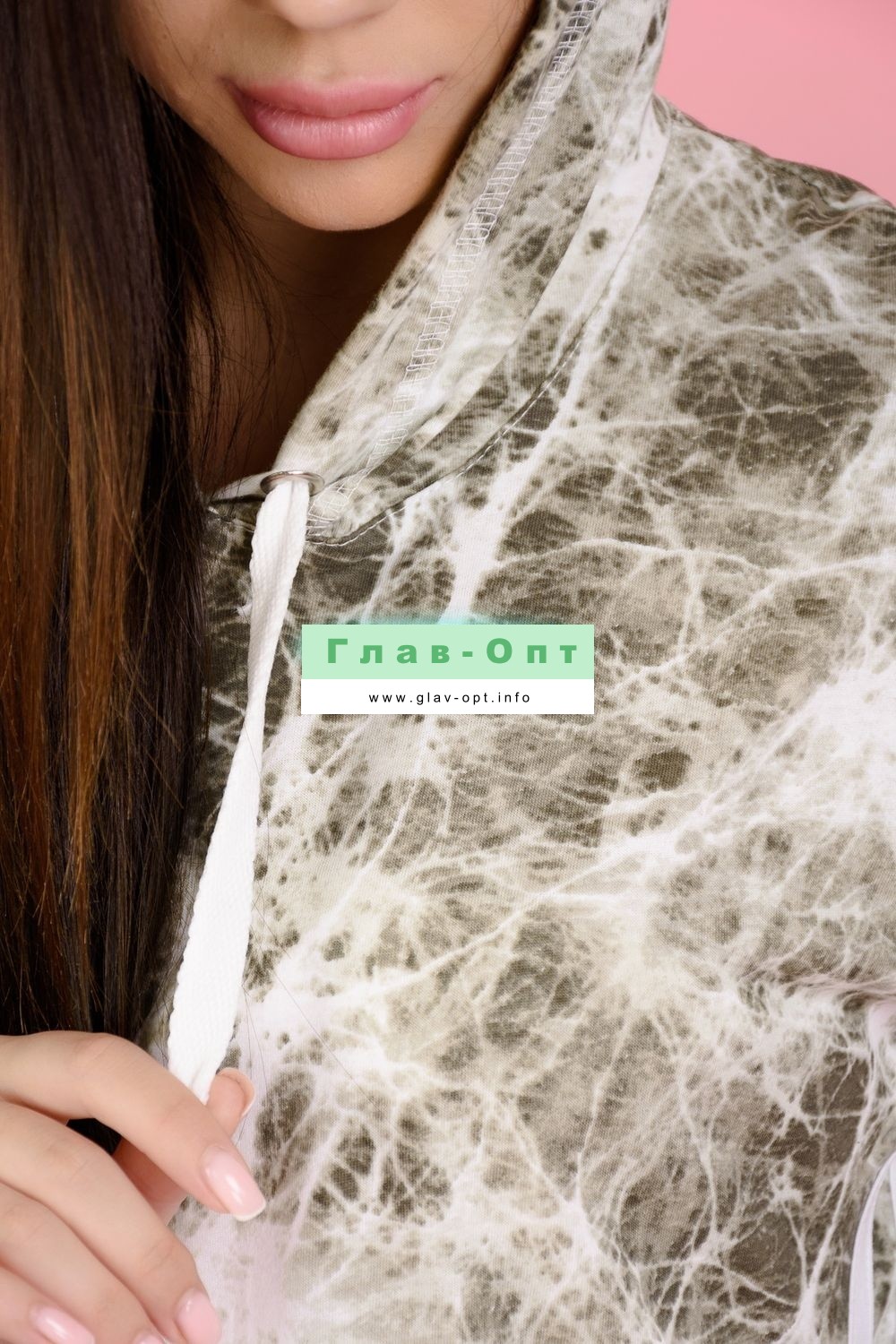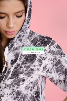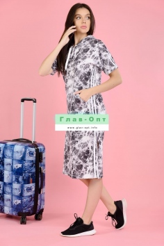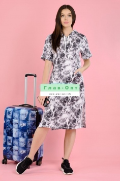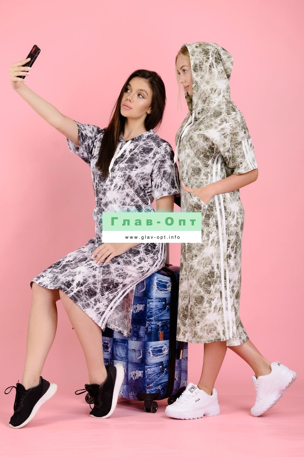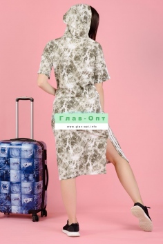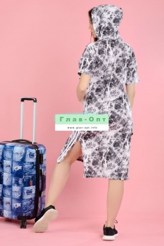 Платье прямое, длинное, с капюшоном, с карманом кенгуру . Рукав короткий, с лампасами из отделочного полотна. Полочка с лампасами из отделочного полотна вдоль боковых швов. В нижней части боковых швов обработаны разрезы.