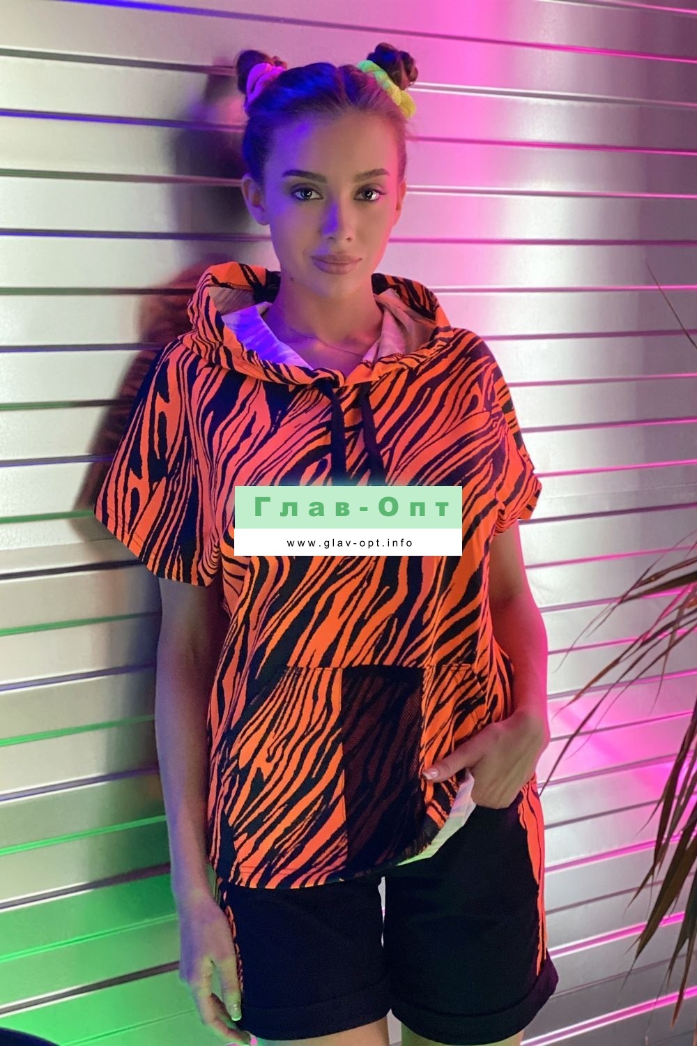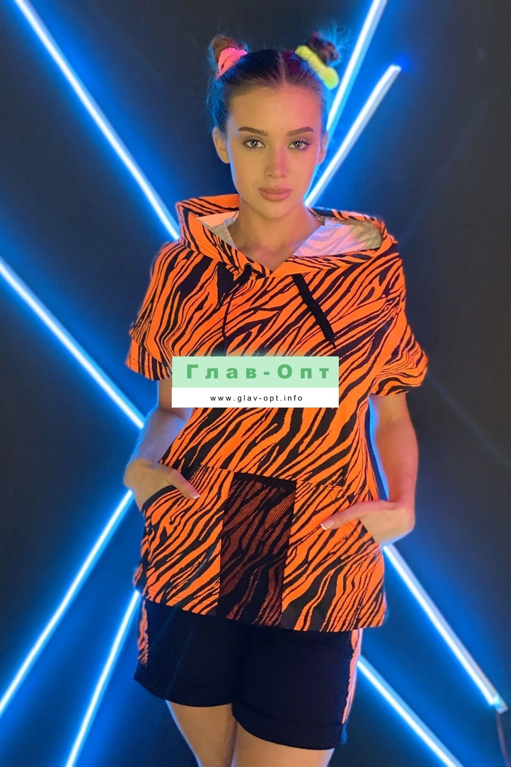 Шорты прямые, на поясе, с карманами, с манжетом. Вдоль боковых швов расположены лампасы из отделочного полотна.