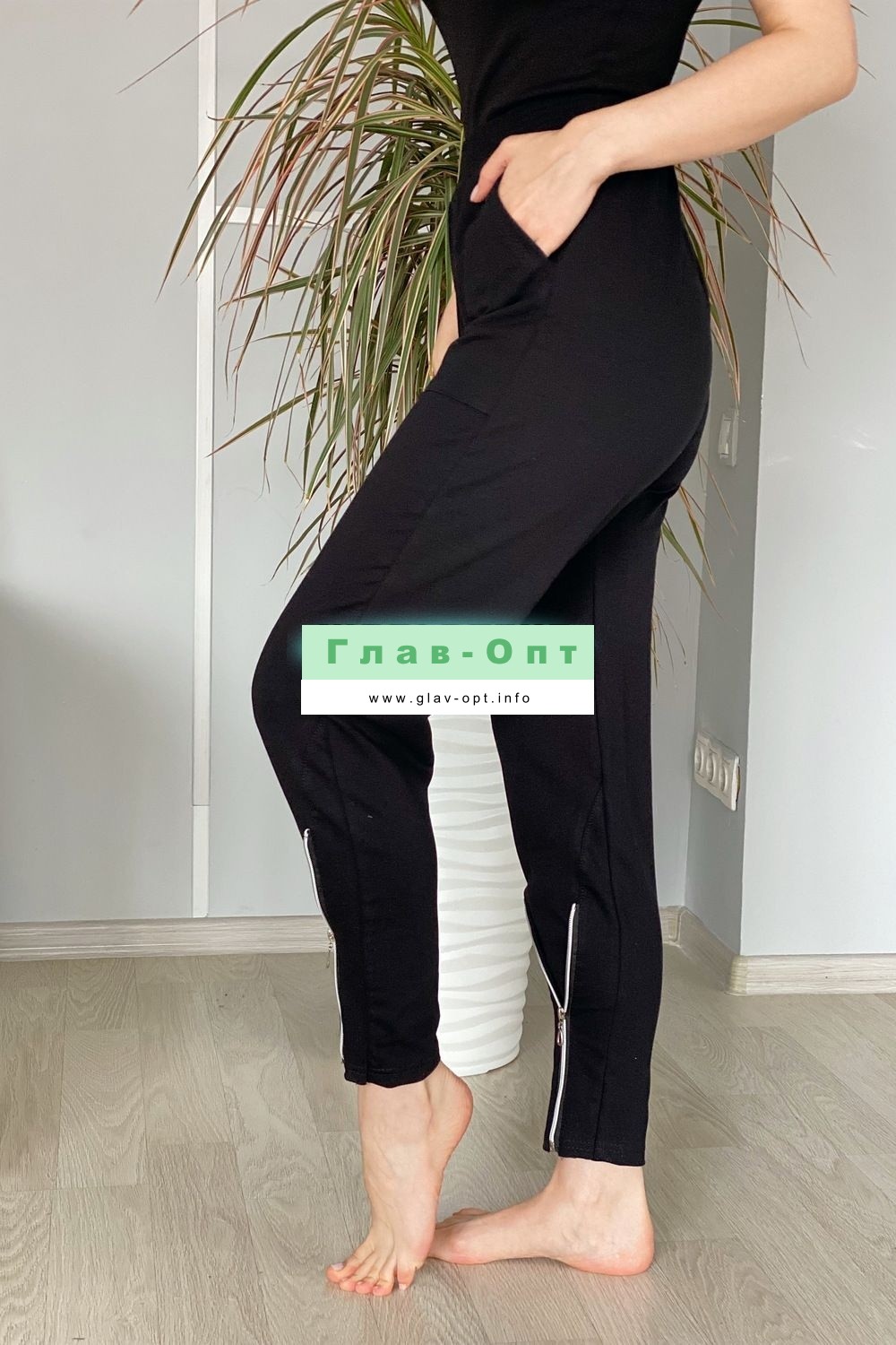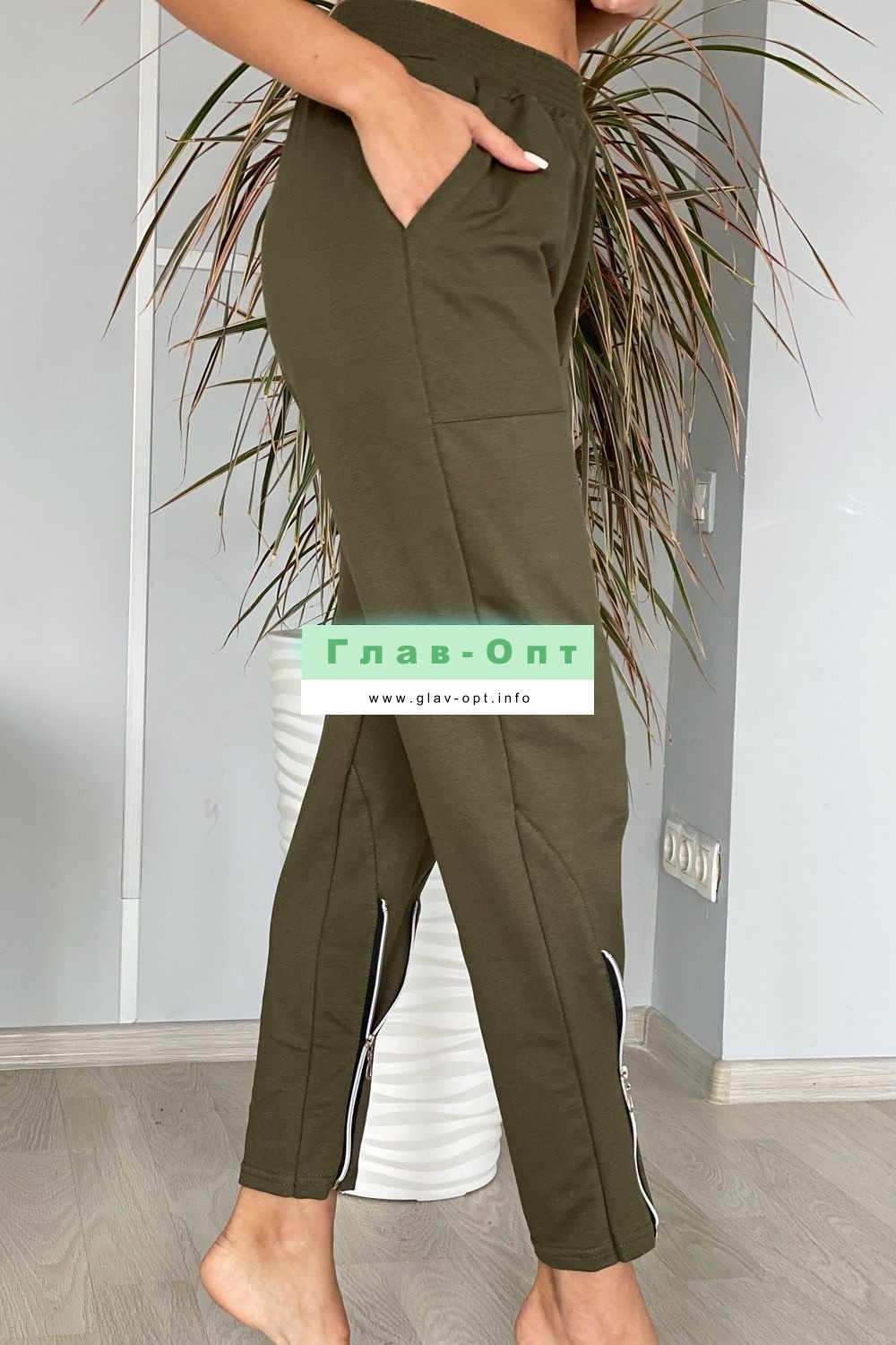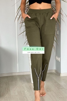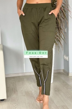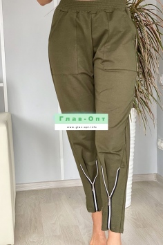 Брюки свободные, с боковыми накладными карманами, на эластичном поясе. В нижней части передних половинок обработаны декоративные элементы с молниями.