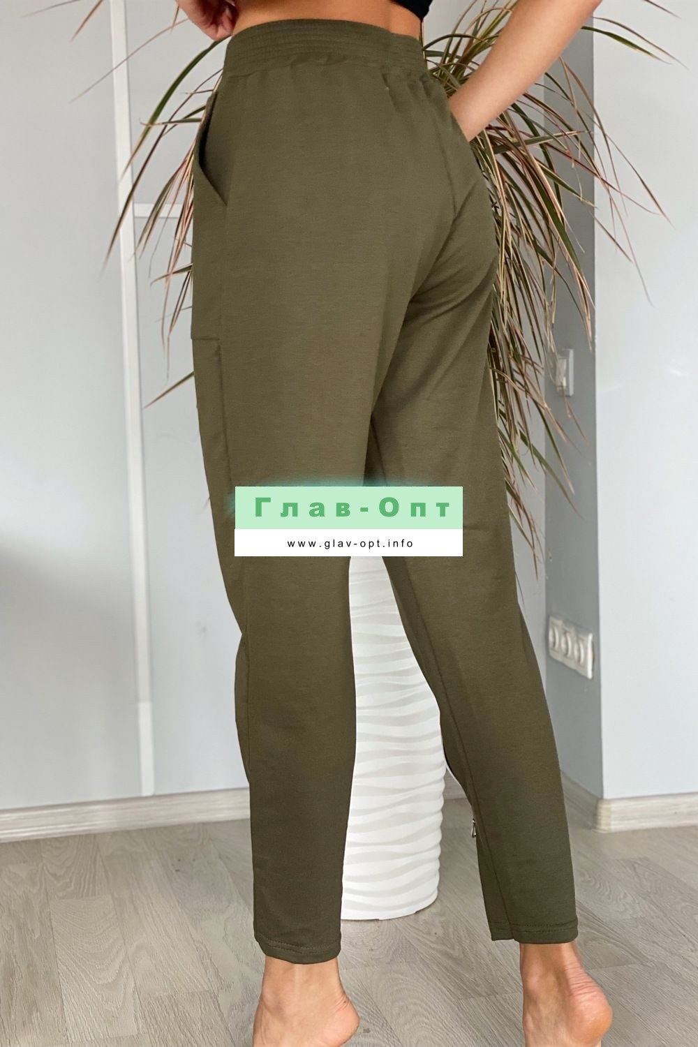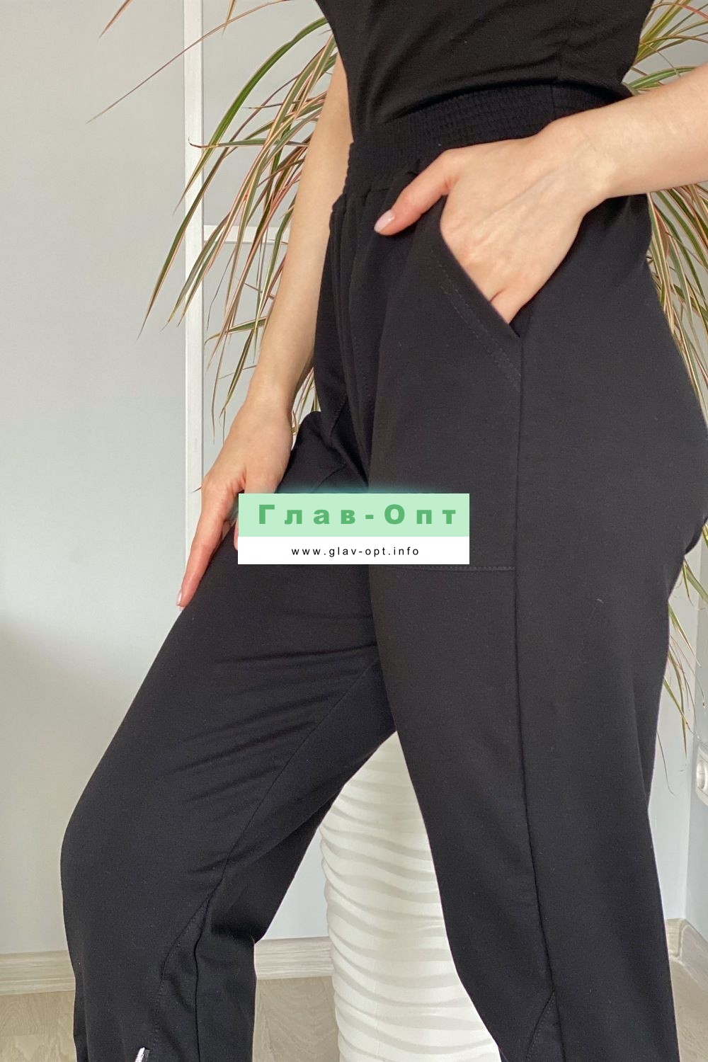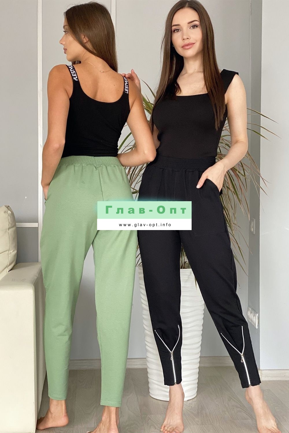 Брюки свободные, с боковыми накладными карманами, на эластичном поясе. В нижней части передних половинок обработаны декоративные элементы с молниями.