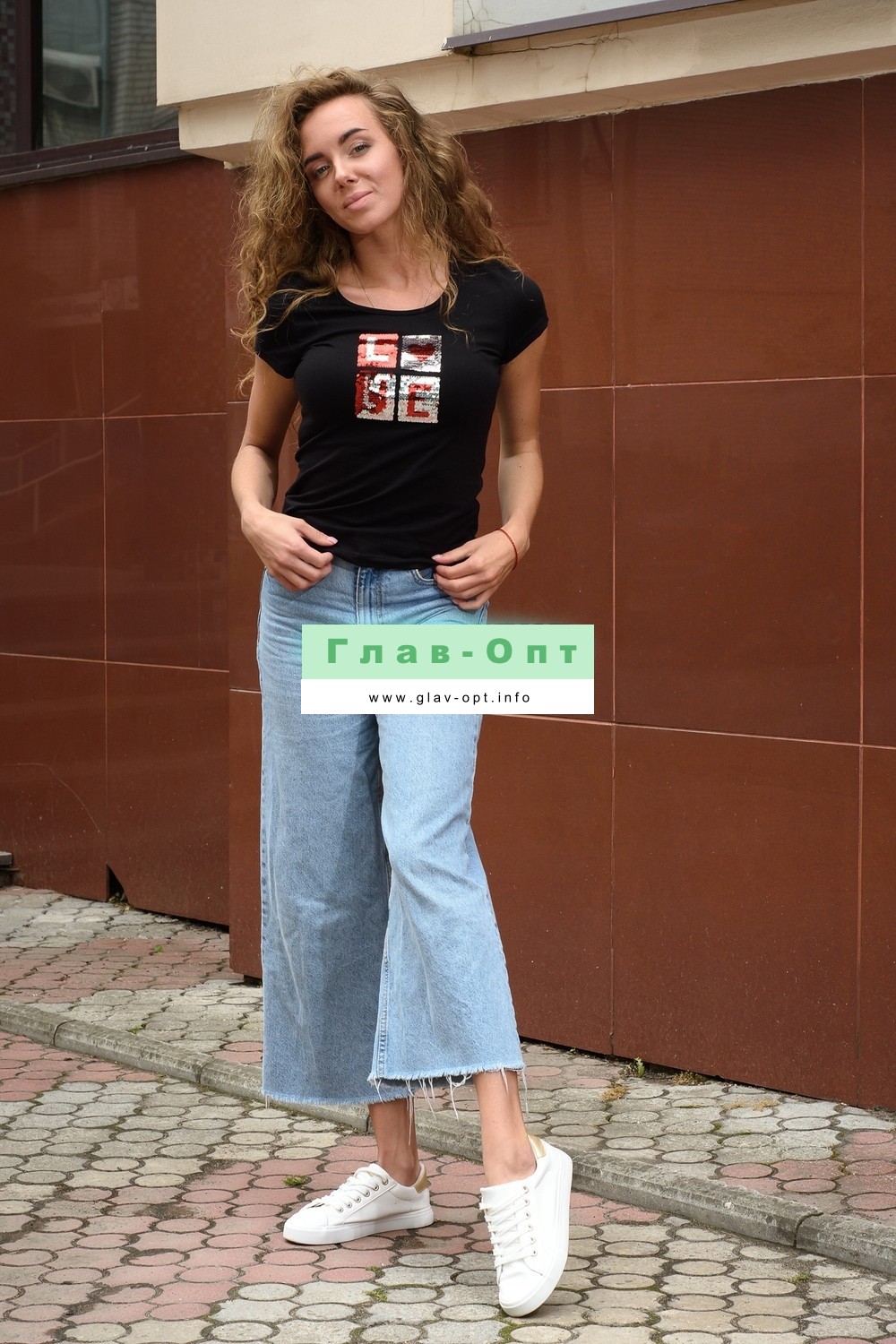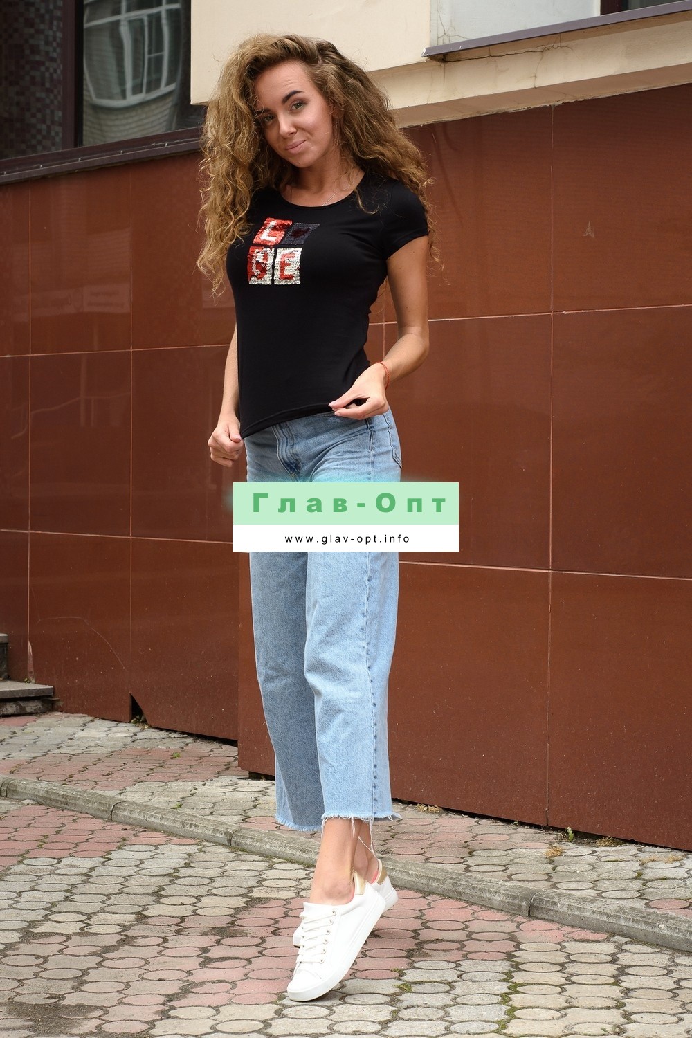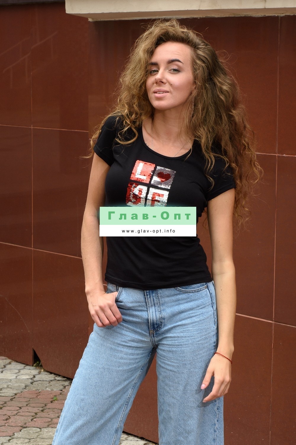 Футболка полуприлегающего силуэта, с округлой горловиной, длиной до середины бедра. Рукав втачной короткий. Горловина обработана бейкой из основного полотна. На полочке аппликация из пайеток