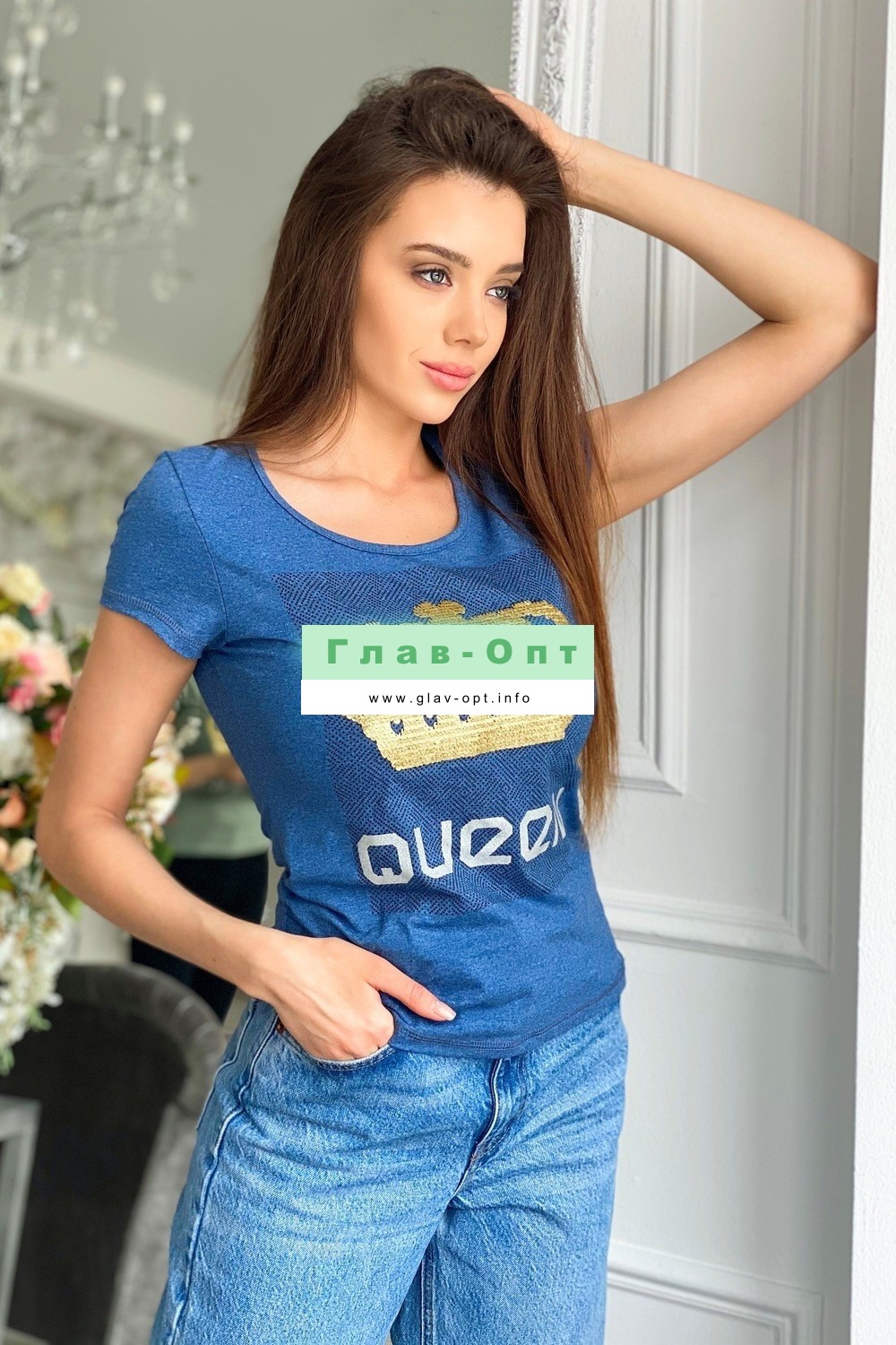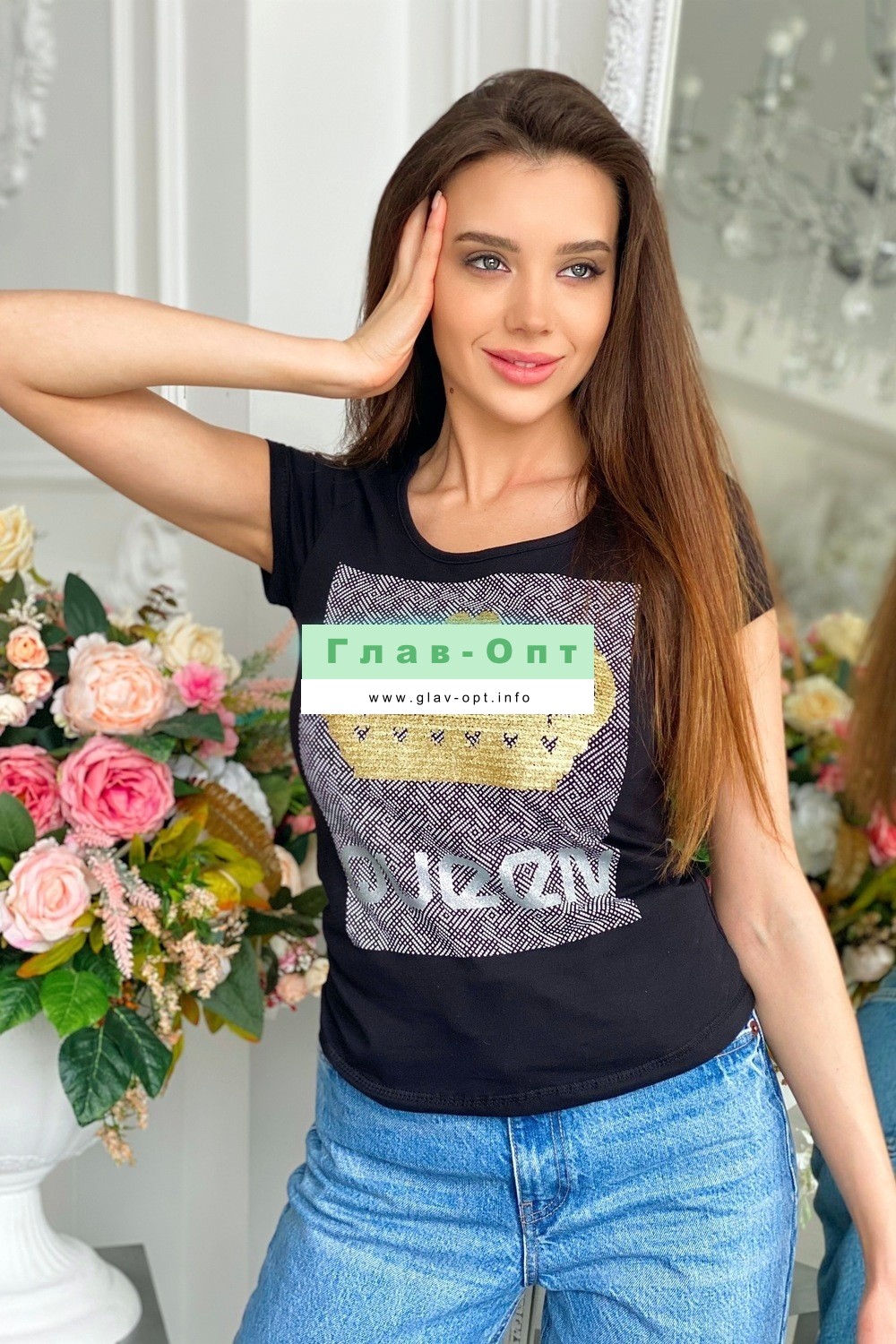 Футболка полуприлегающего силуэта, с округлой горловиной, длиной до середины бедра. Рукав втачной короткий. Горловина обработана бейкой из основного полотна. На полочке эффектная печать из пайеток