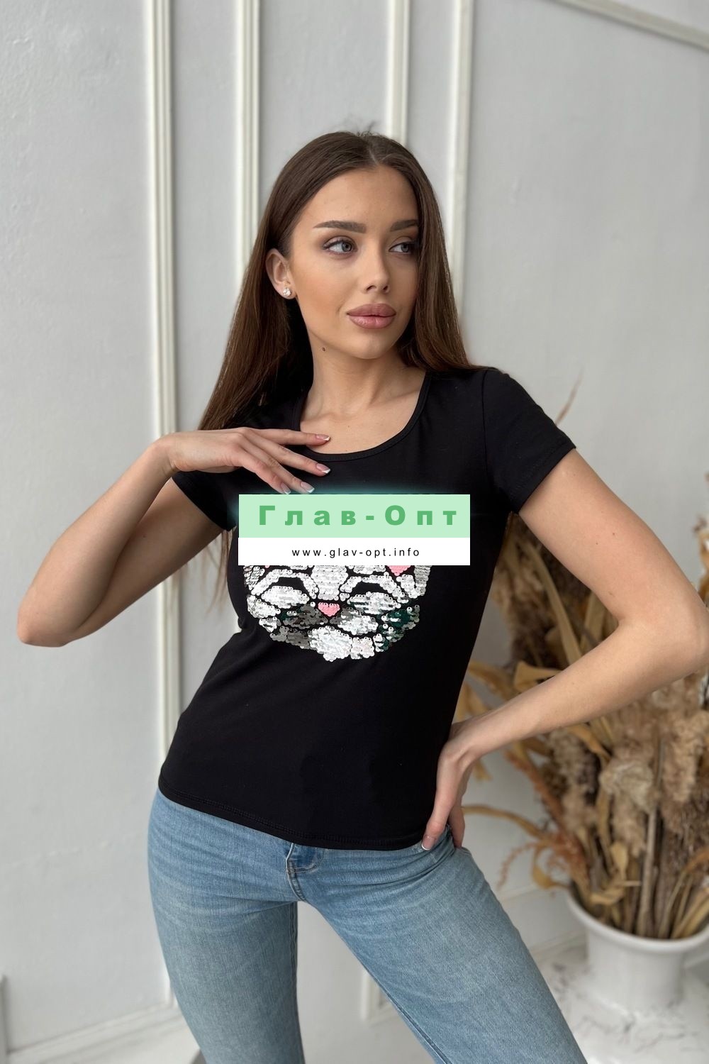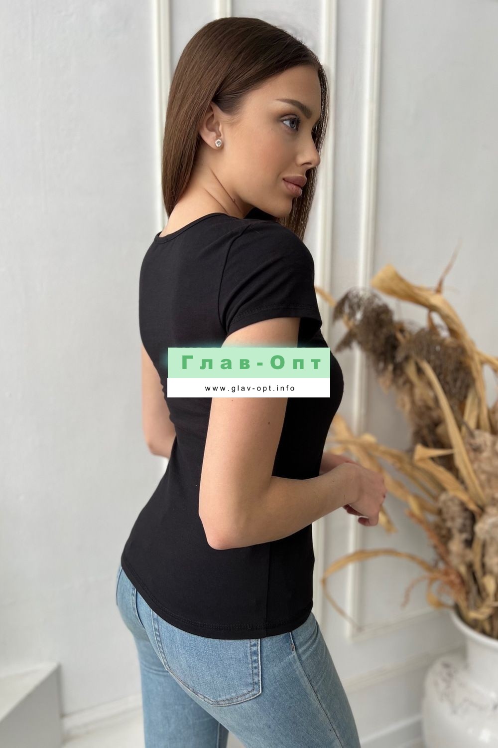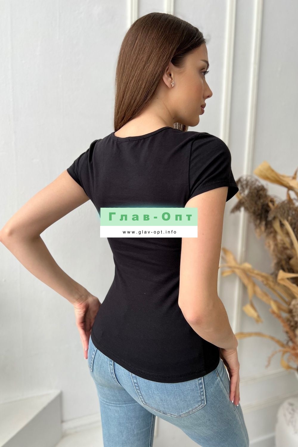 Футболка полуприлегающего силуэта, с округлой горловиной, длиной до середины бедра. Рукав втачной короткий. Горловина обработана бейкой из основного полотна.