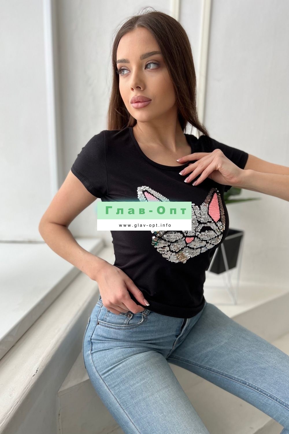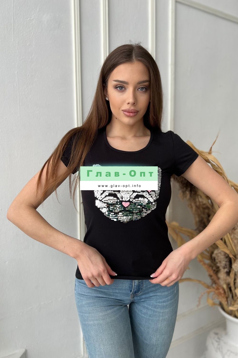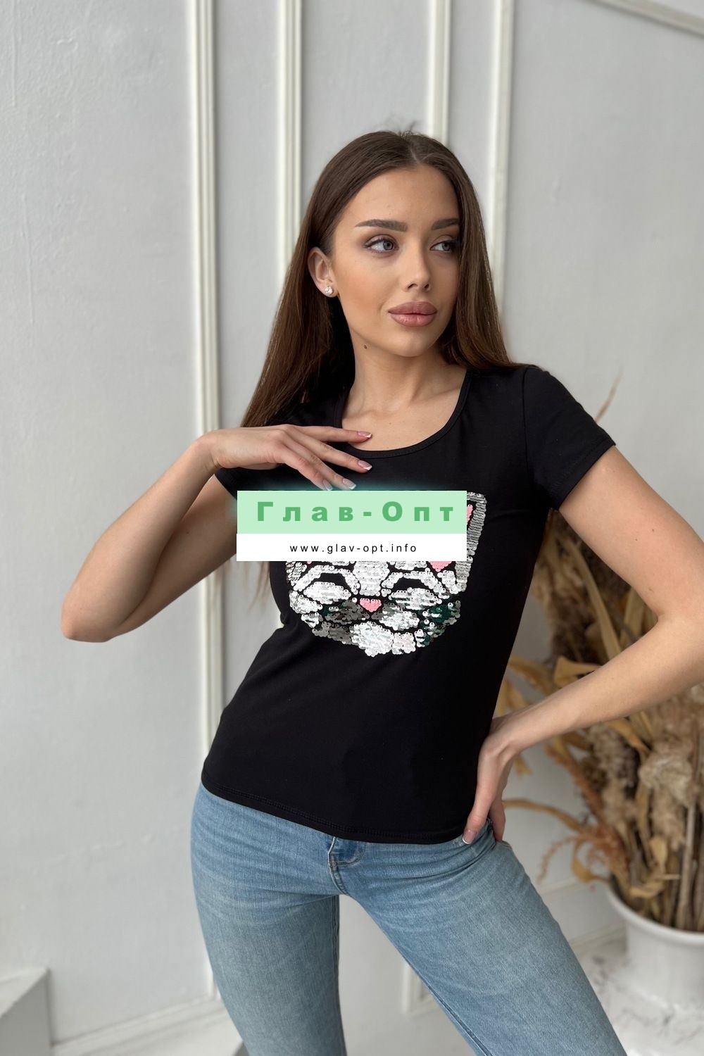 Футболка полуприлегающего силуэта, с округлой горловиной, длиной до середины бедра. Рукав втачной короткий. Горловина обработана бейкой из основного полотна.