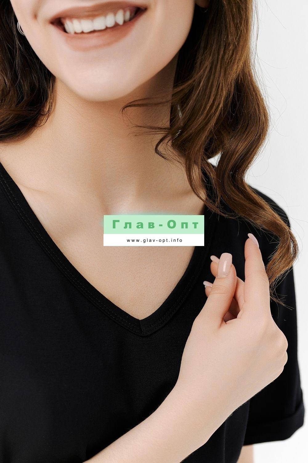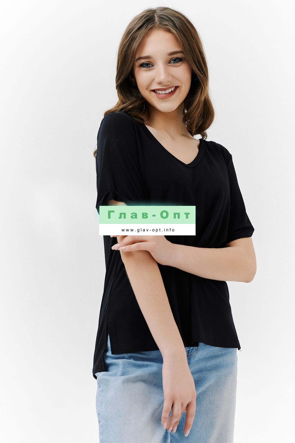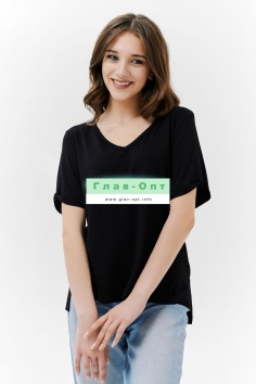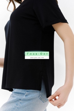 Футболка прямого силуэта, с V-образной горловиной, с разрезами в нижней части боковых швов. Спинка с кокеткой, удлиненная. Горловина обработана бейкой из основного полотна.