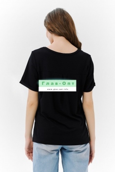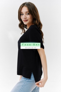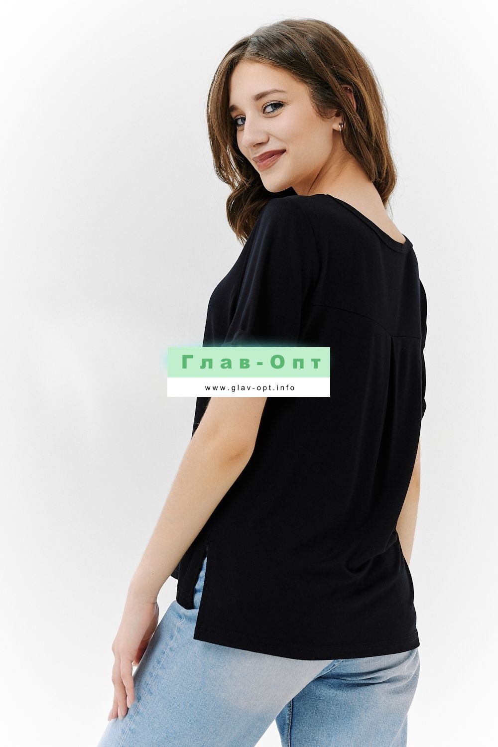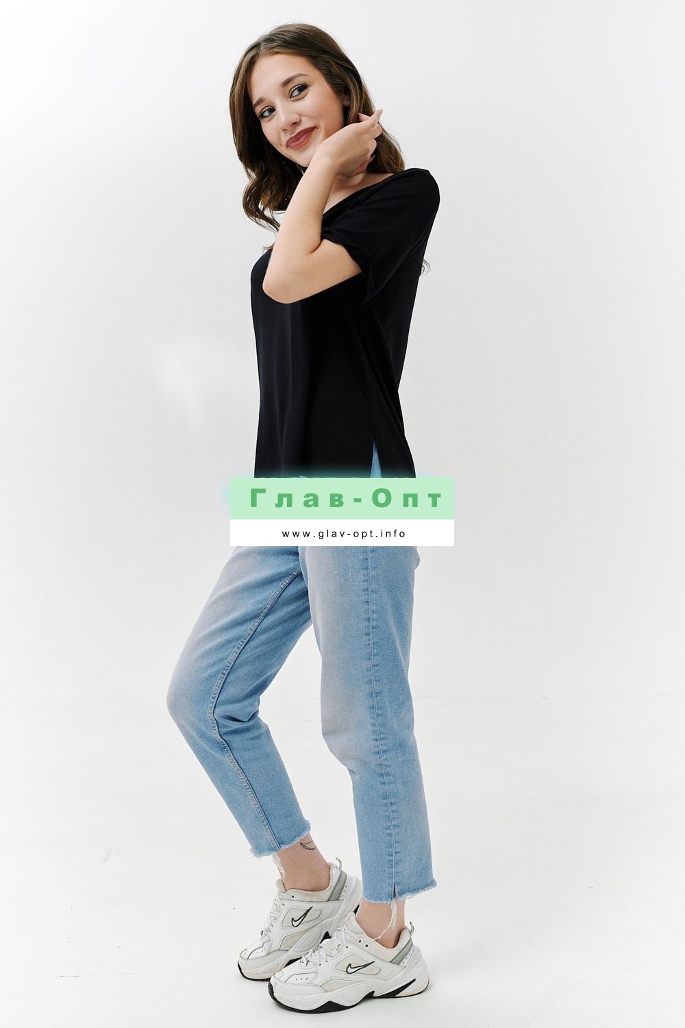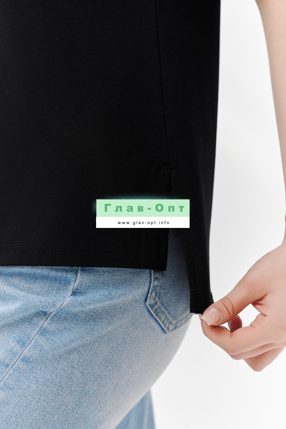 Футболка прямого силуэта, с V-образной горловиной, с разрезами в нижней части боковых швов. Спинка с кокеткой, удлиненная. Горловина обработана бейкой из основного полотна.