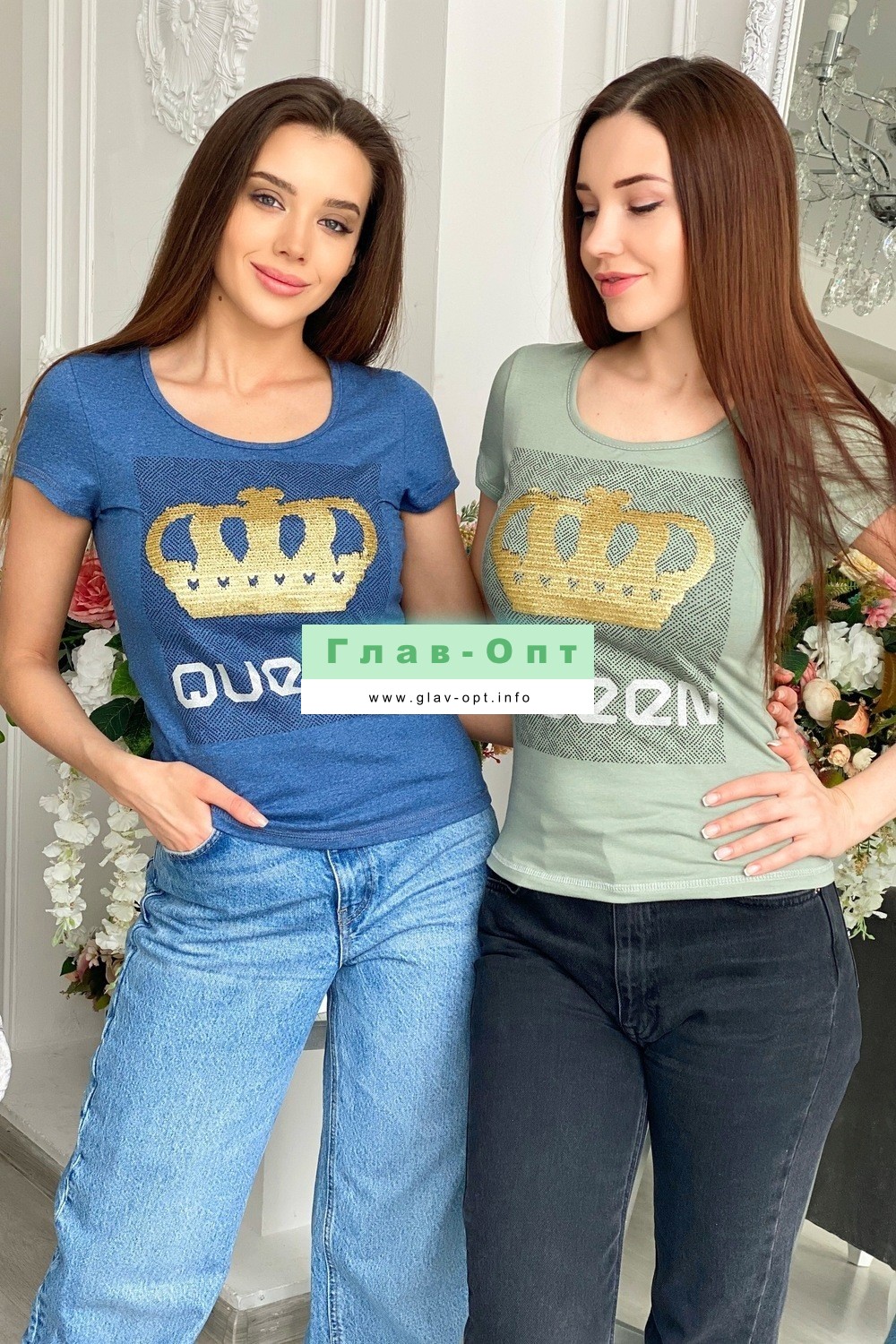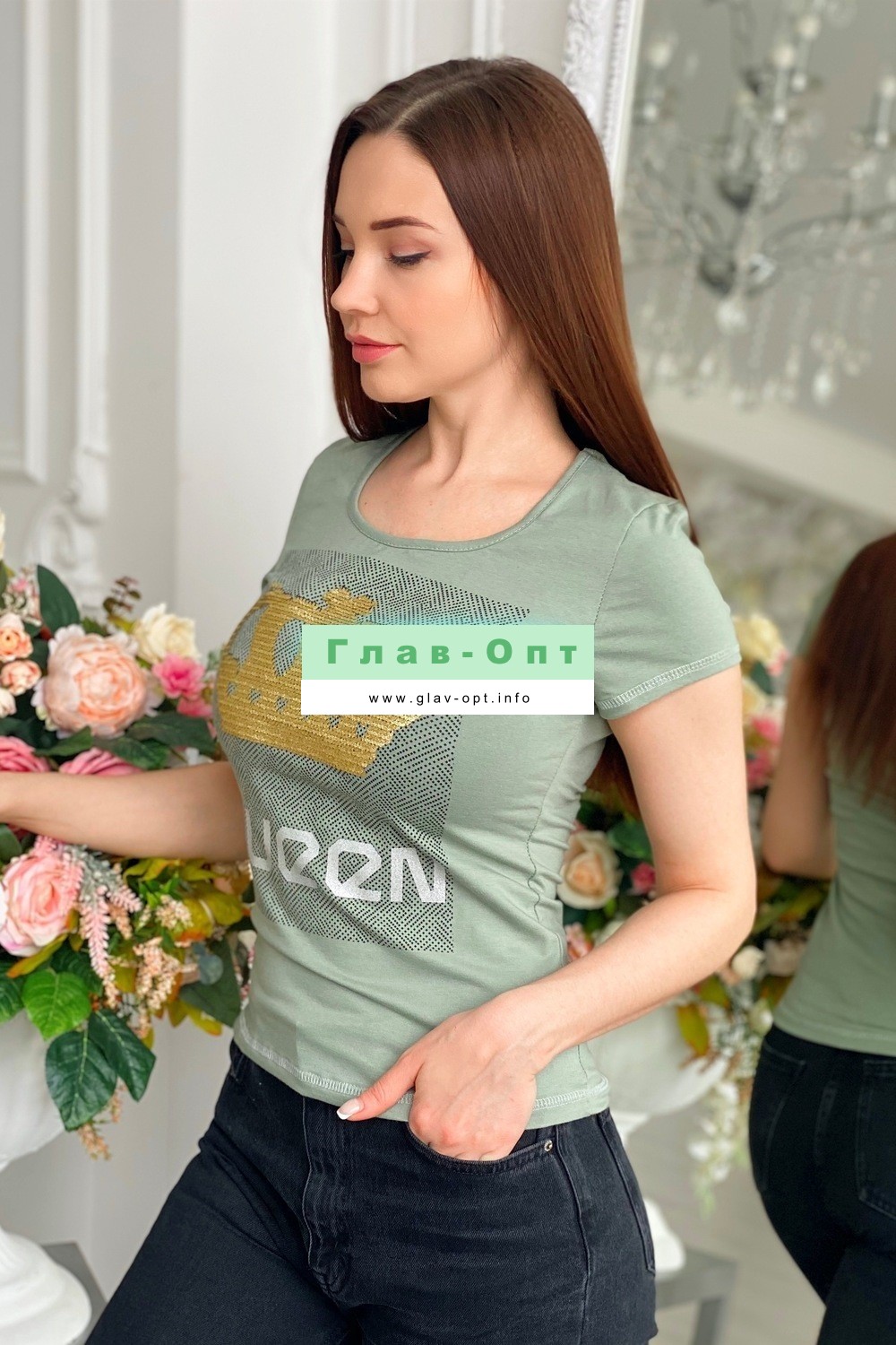 Футболка полуприлегающего силуэта, с округлой горловиной, длиной до середины бедра. Рукав втачной короткий. Горловина обработана бейкой из основного полотна. На полочке эффектная печать из пайеток