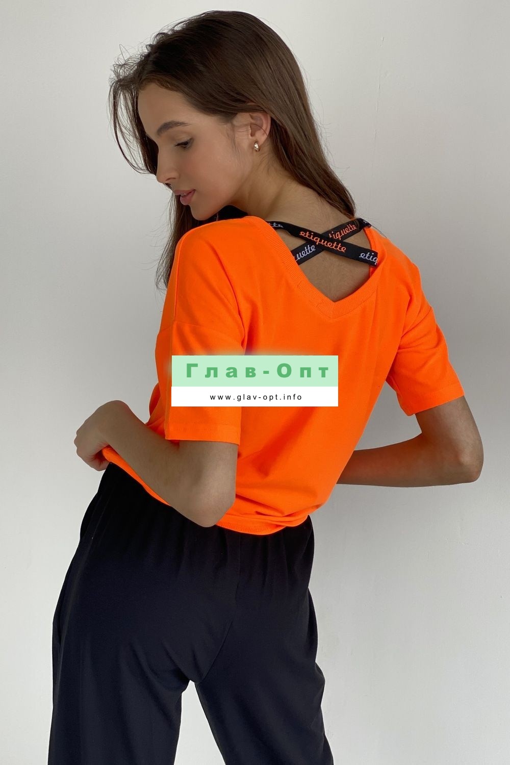 Футболка прямого силуэта, с округлой горловиной. Рукав короткий. В верхней части спинки обработан фигурный вырез с декоративной тесьмой. Горловина обработана эластичной обтачкой.