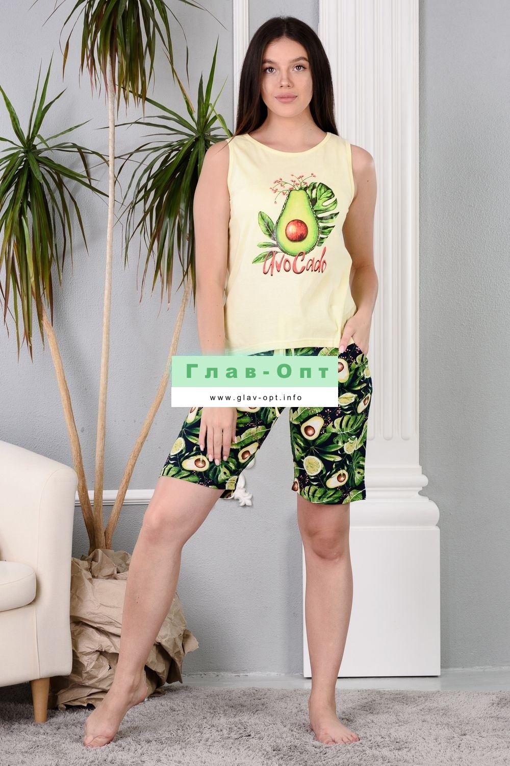 Нежный женский костюм из 100% хлопка - комплект из удлиненных шортиков и майки. Скругленная линия подола спереди и сзади. Разница в длине спинки и полочки в 19 см. На шортах глубокие удобные карманы. Принт - авокадо.