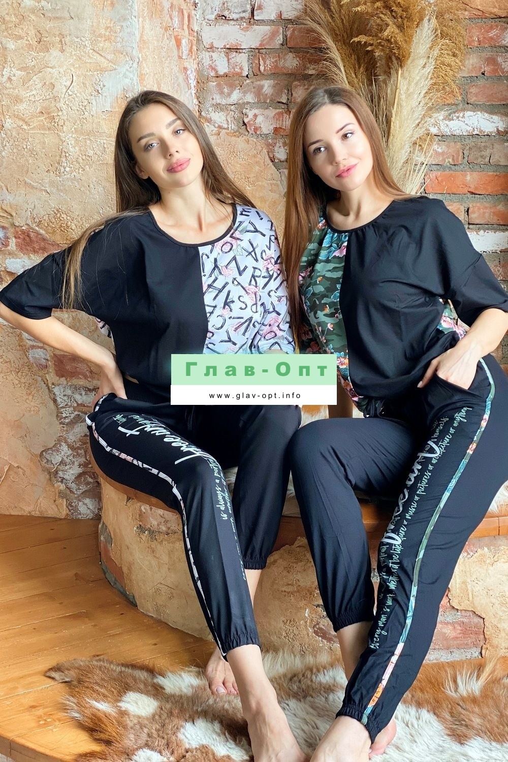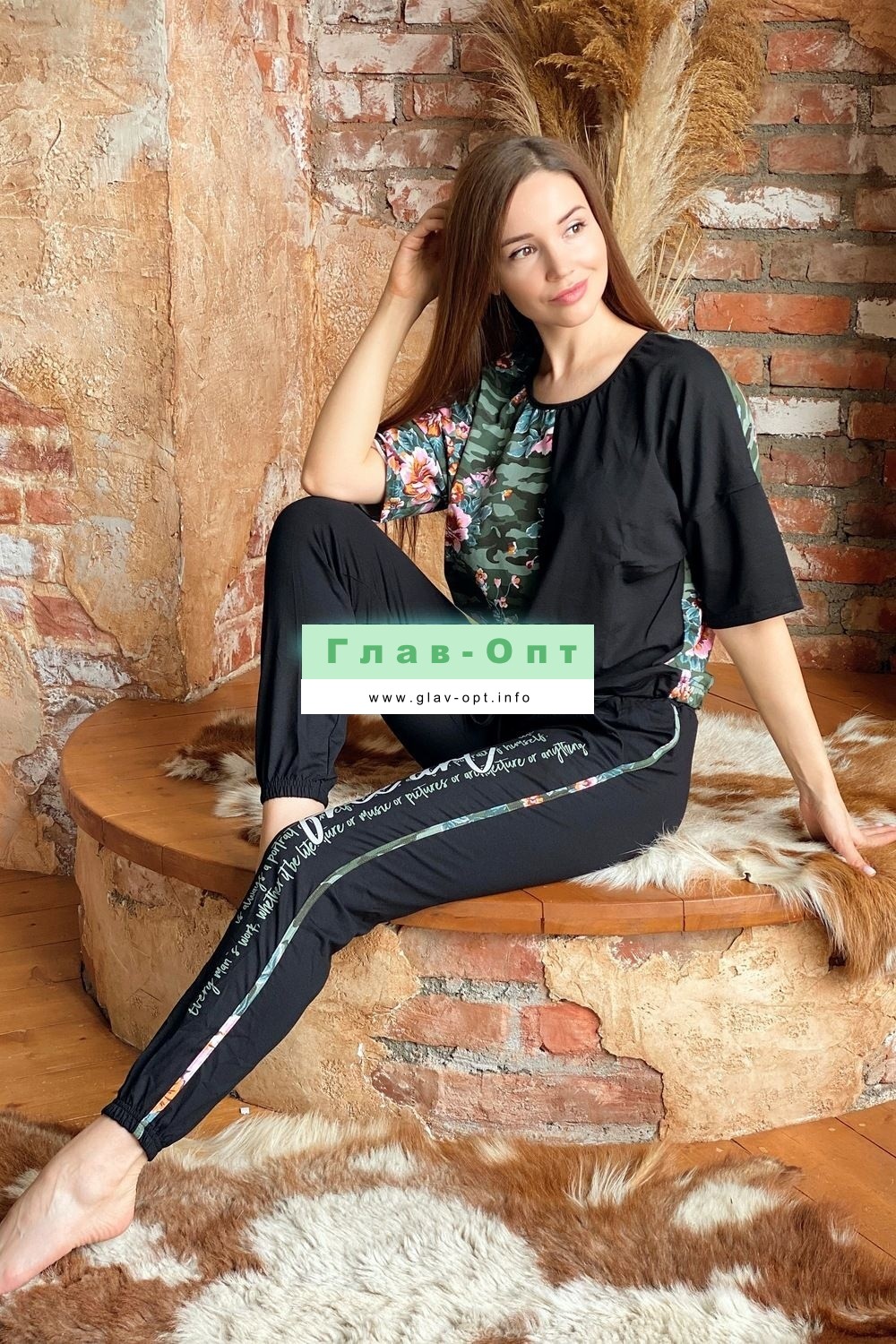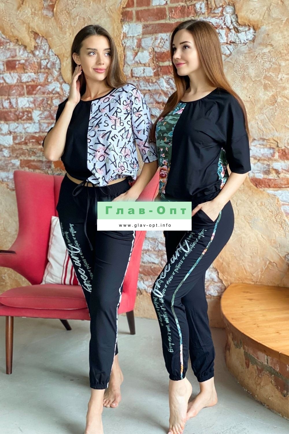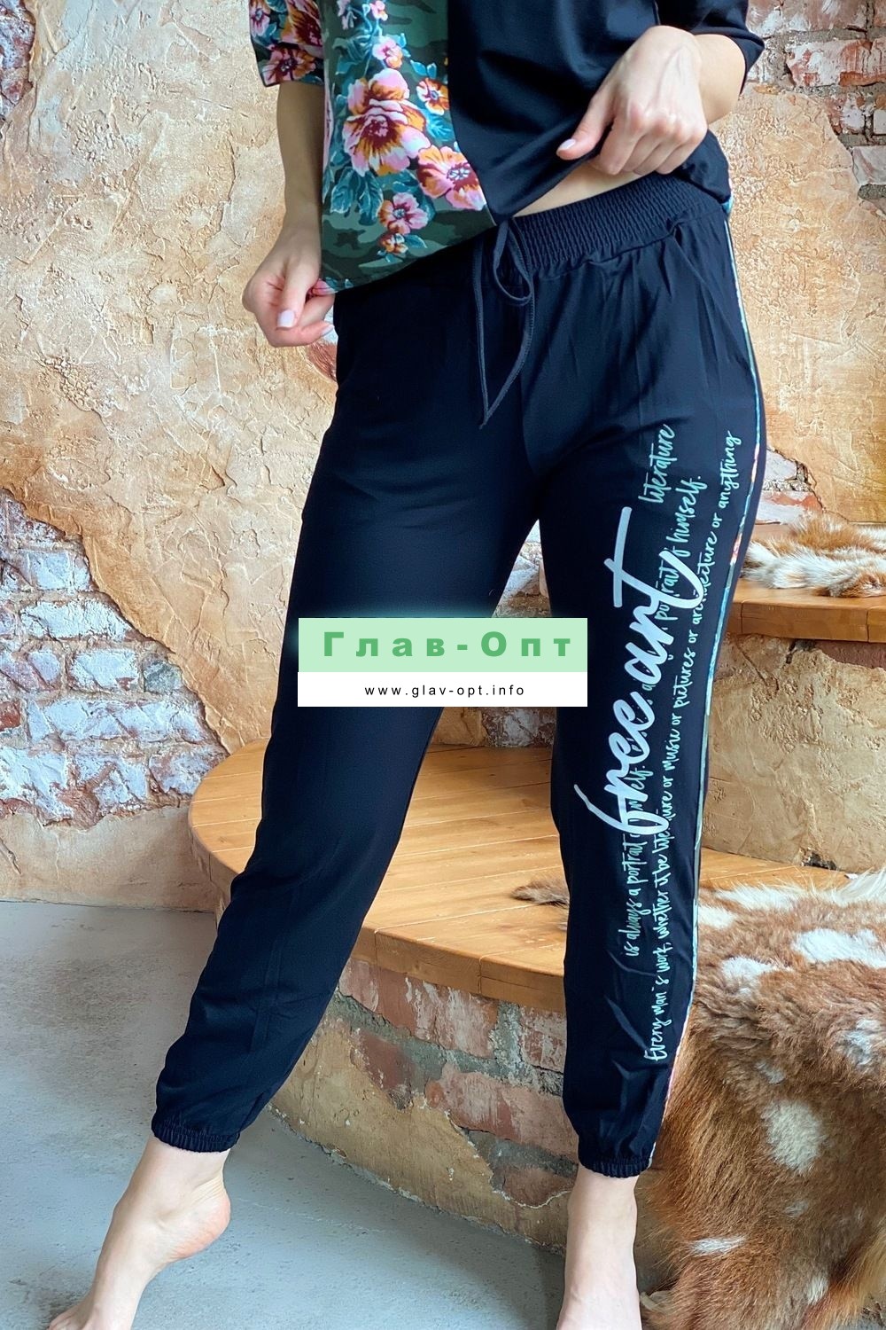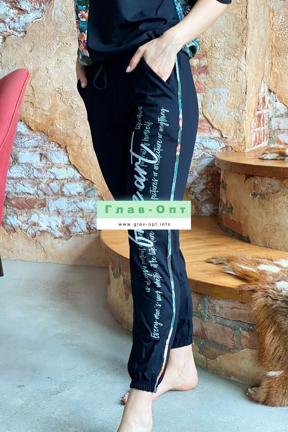 Костюм состоит из футболки и брюк. Футболка прямая, с округлой горловиной. Половина полочки выполнена из отделочного полотна. По низу обработана кулиса со шнуром-стяжкой. Шнур и горловина обработаны бейкой из отделочного полотна. Брюки выполнены из отделочного полотна. Брюки свободные, длинные, с карманами, на эластичном поясе, с резинкой по низу. Вдоль боковых швов расположен лампас из основного полотна.