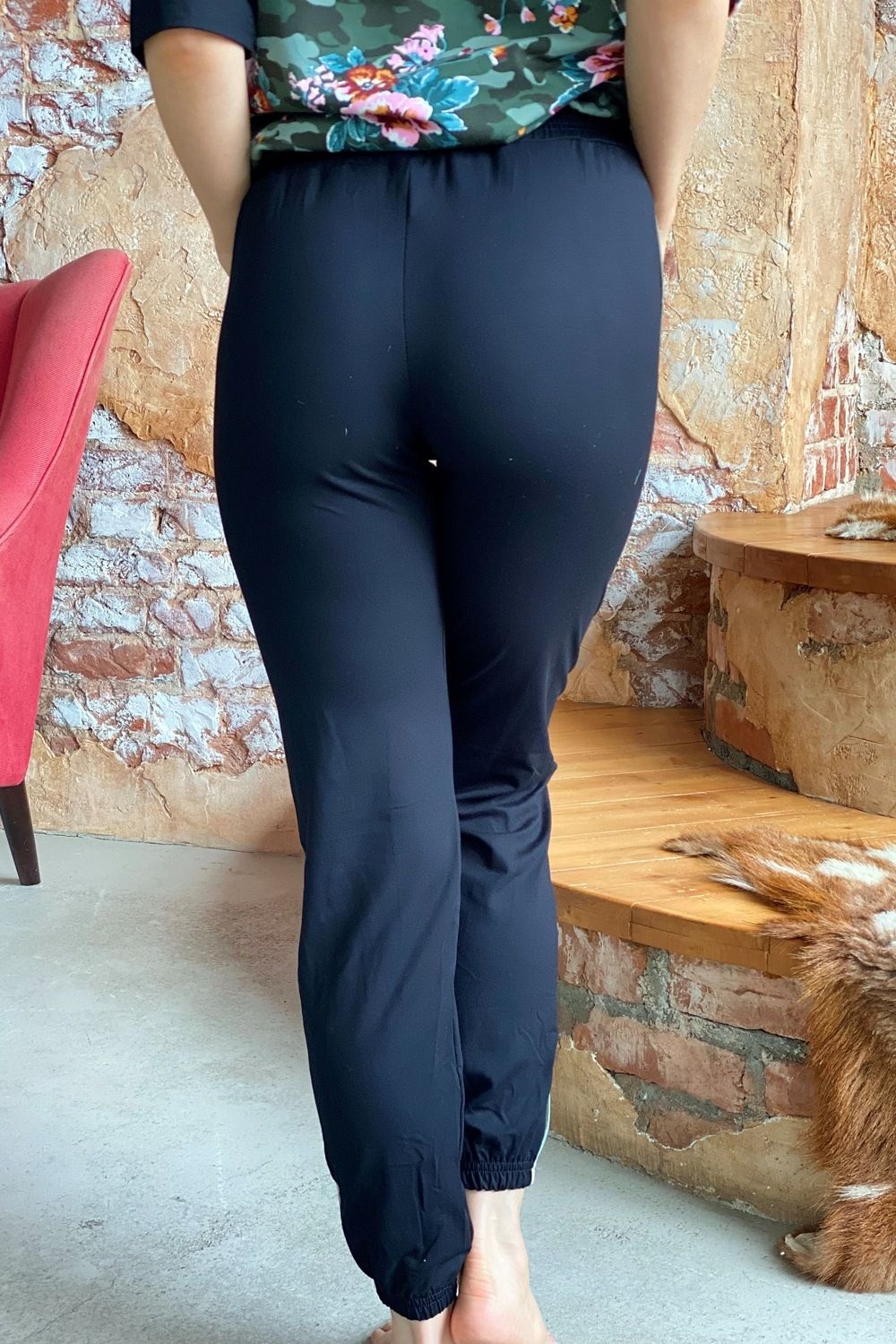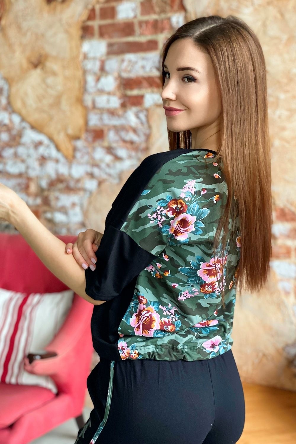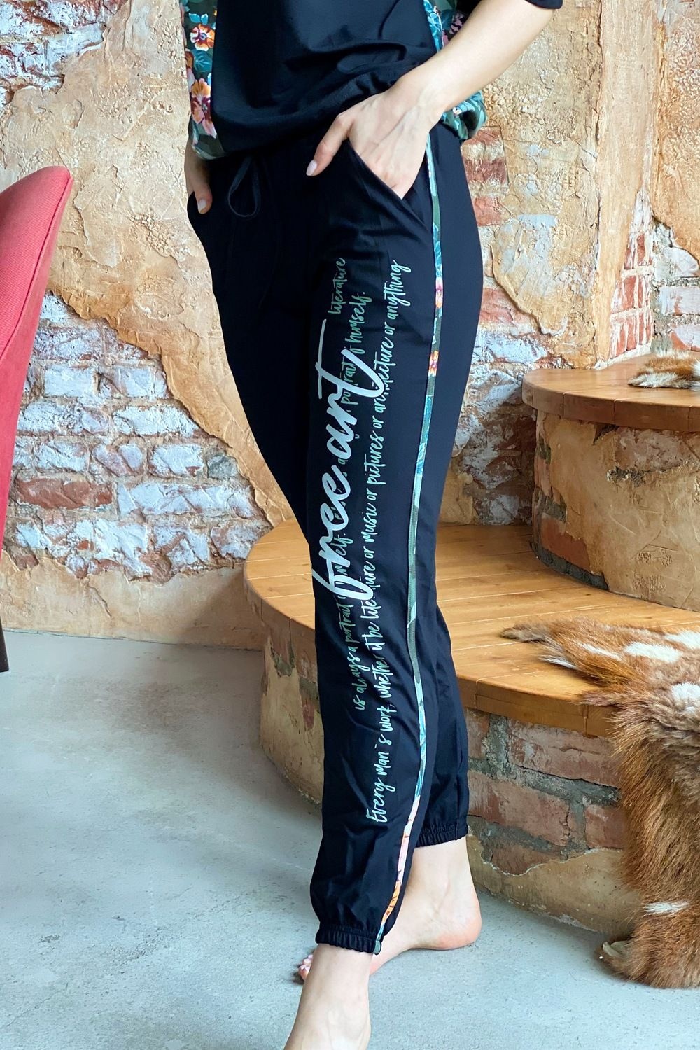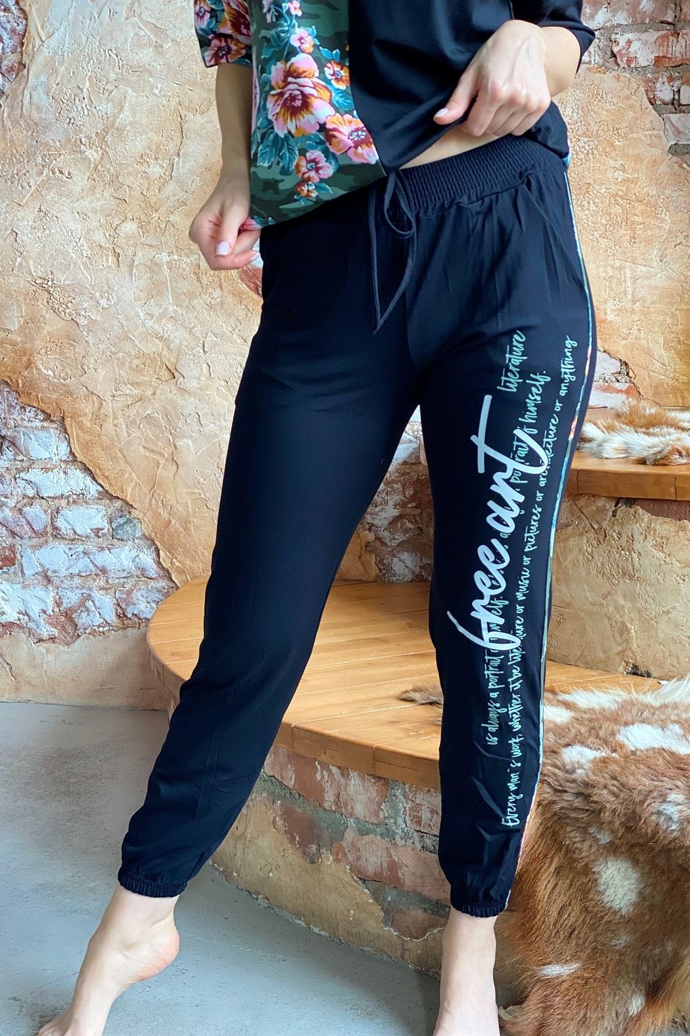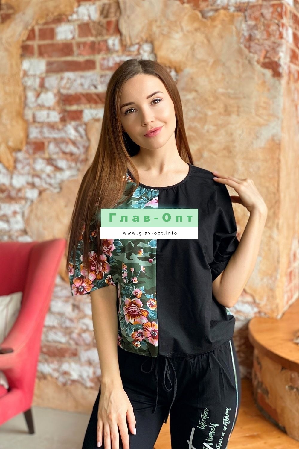 Костюм состоит из футболки и брюк. Футболка прямая, с округлой горловиной. Половина полочки выполнена из отделочного полотна. По низу обработана кулиса со шнуром-стяжкой. Шнур и горловина обработаны бейкой из отделочного полотна. Брюки выполнены из отделочного полотна. Брюки свободные, длинные, с карманами, на эластичном поясе, с резинкой по низу. Вдоль боковых швов расположен лампас из основного полотна.