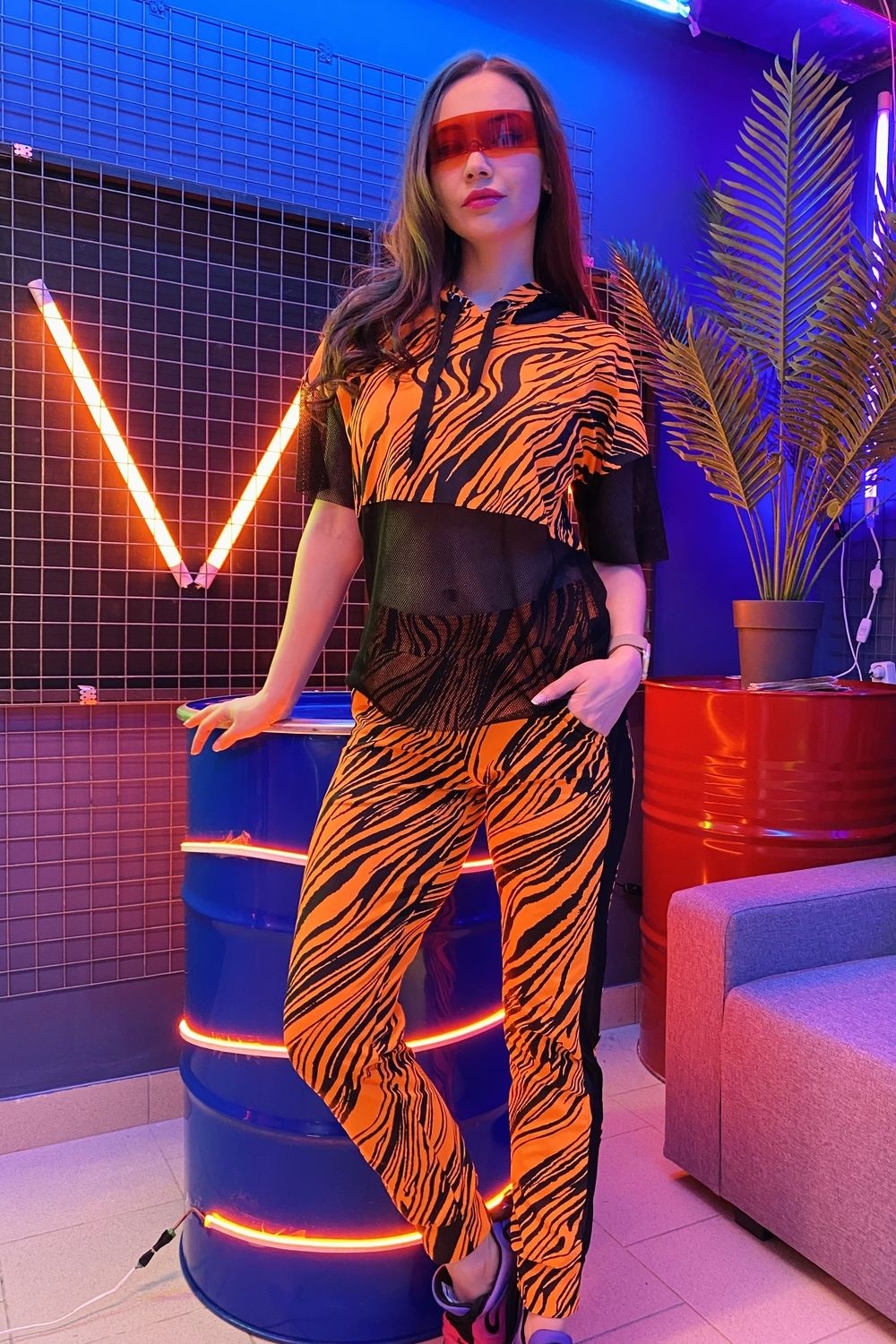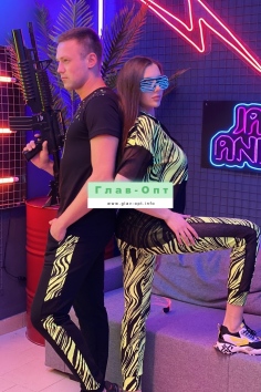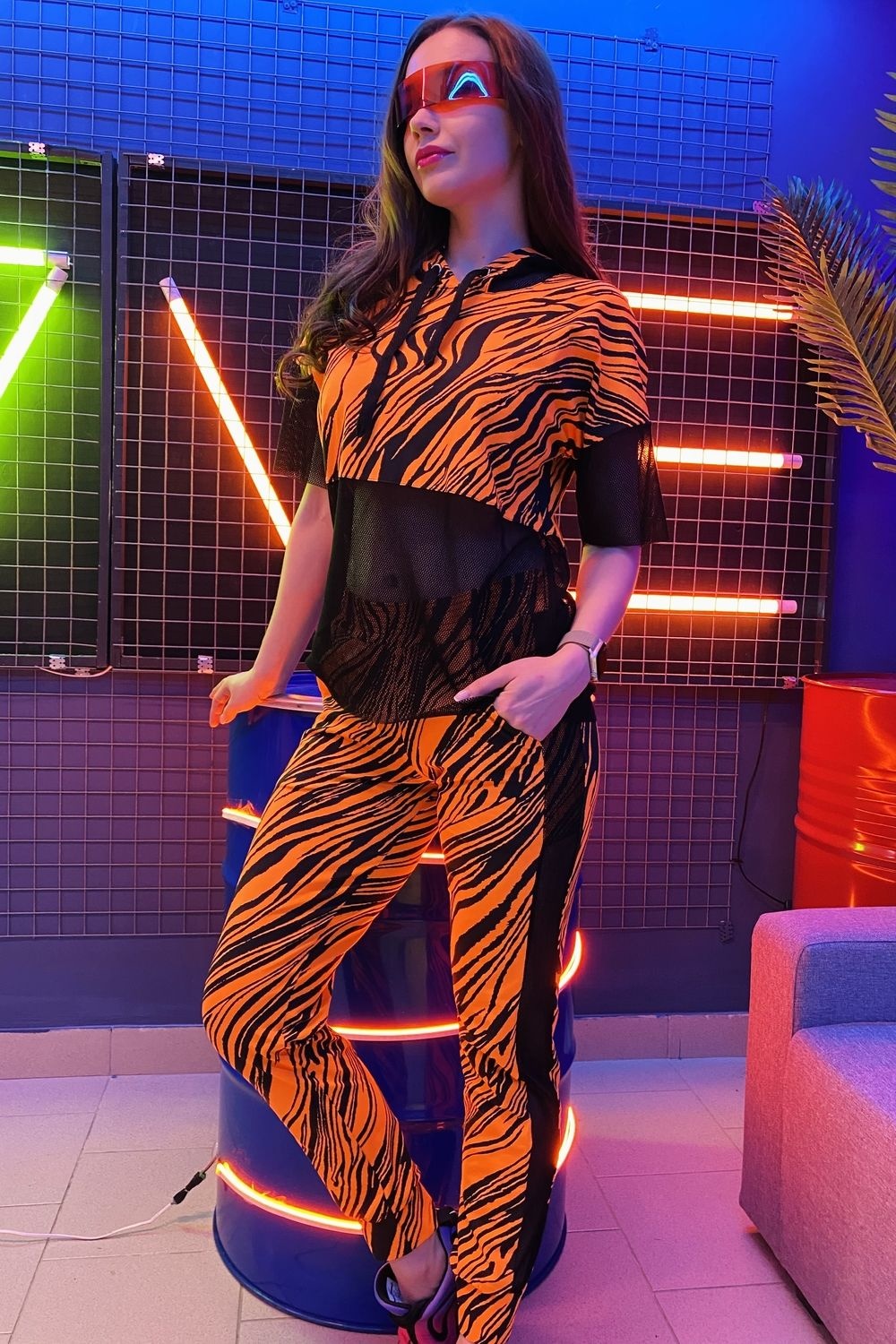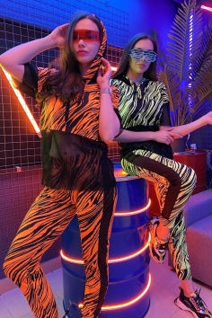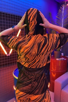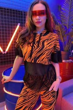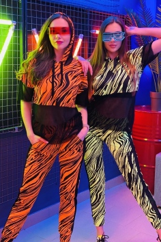 Комплект состоит из туники и брюк. Брюки на поясе, с карманами, с лампасами из сетки вдоль боковых швов, на манжете по низу. Туника свободная, с капюшоном из сетки, с удлиненной спинкой, длиной до середины бедра. Рукав короткий, из сетки. Нижняя часть полочки и спинки выполнены из сетки.