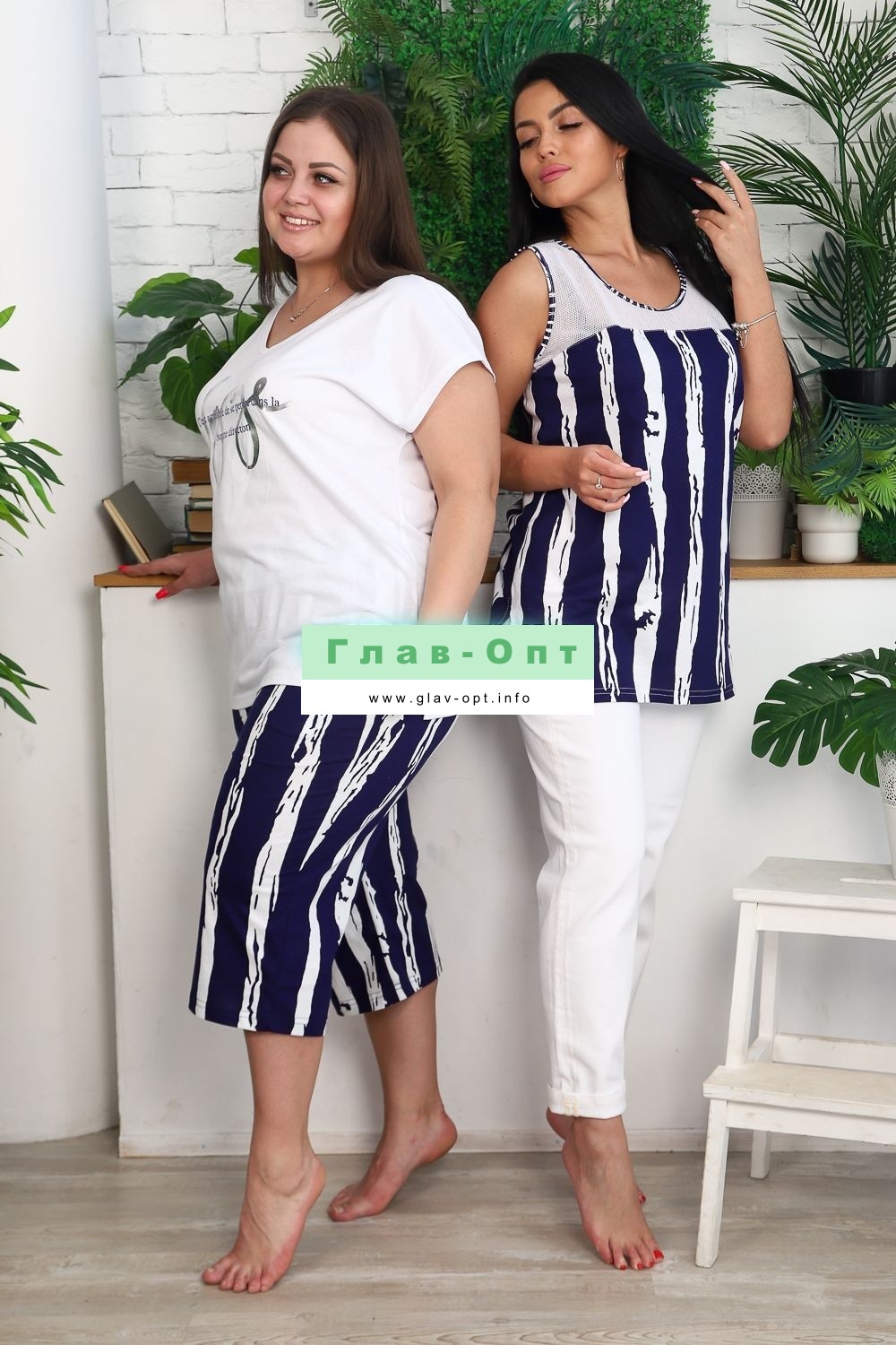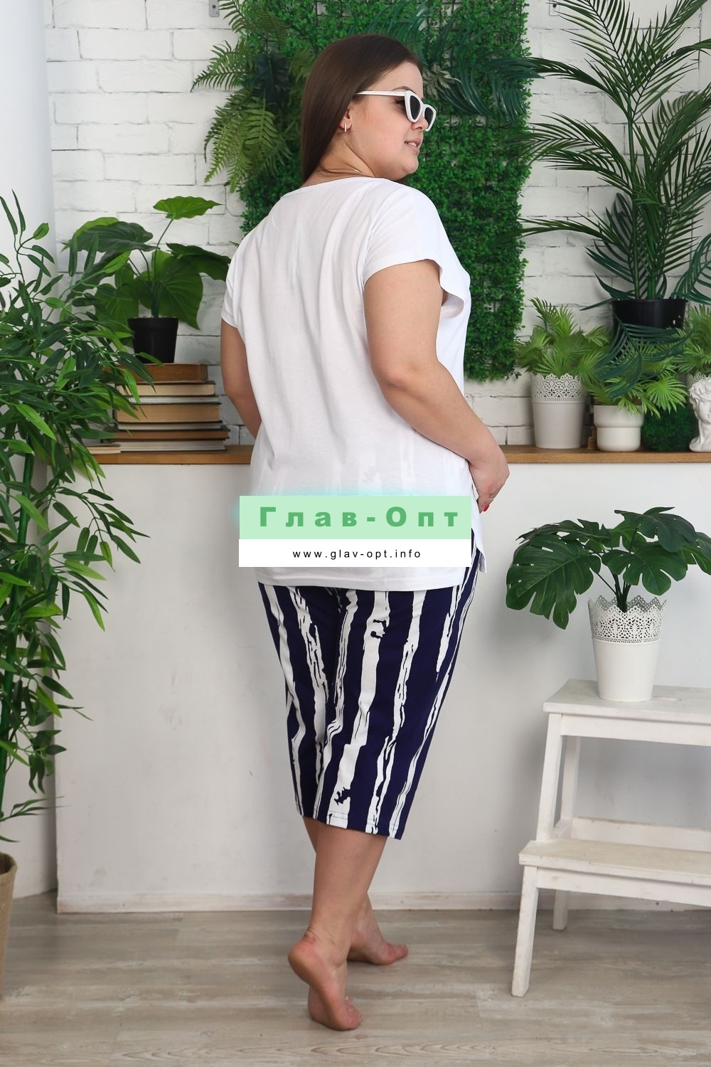 Костюм женский: футболка и бриджи. Футболка прямого силуэта, рукав цельнокроенный короткий, вырез V-образный, в боковом шве разрезы. На полочке модный принт. Бриджи полуприлегающие, длина ниже колена, с хорошей прибавкой на свободу движений. На передней части брюк внутренние карманы. На модели 52 размер. На фото майка из той же коллекции 9126