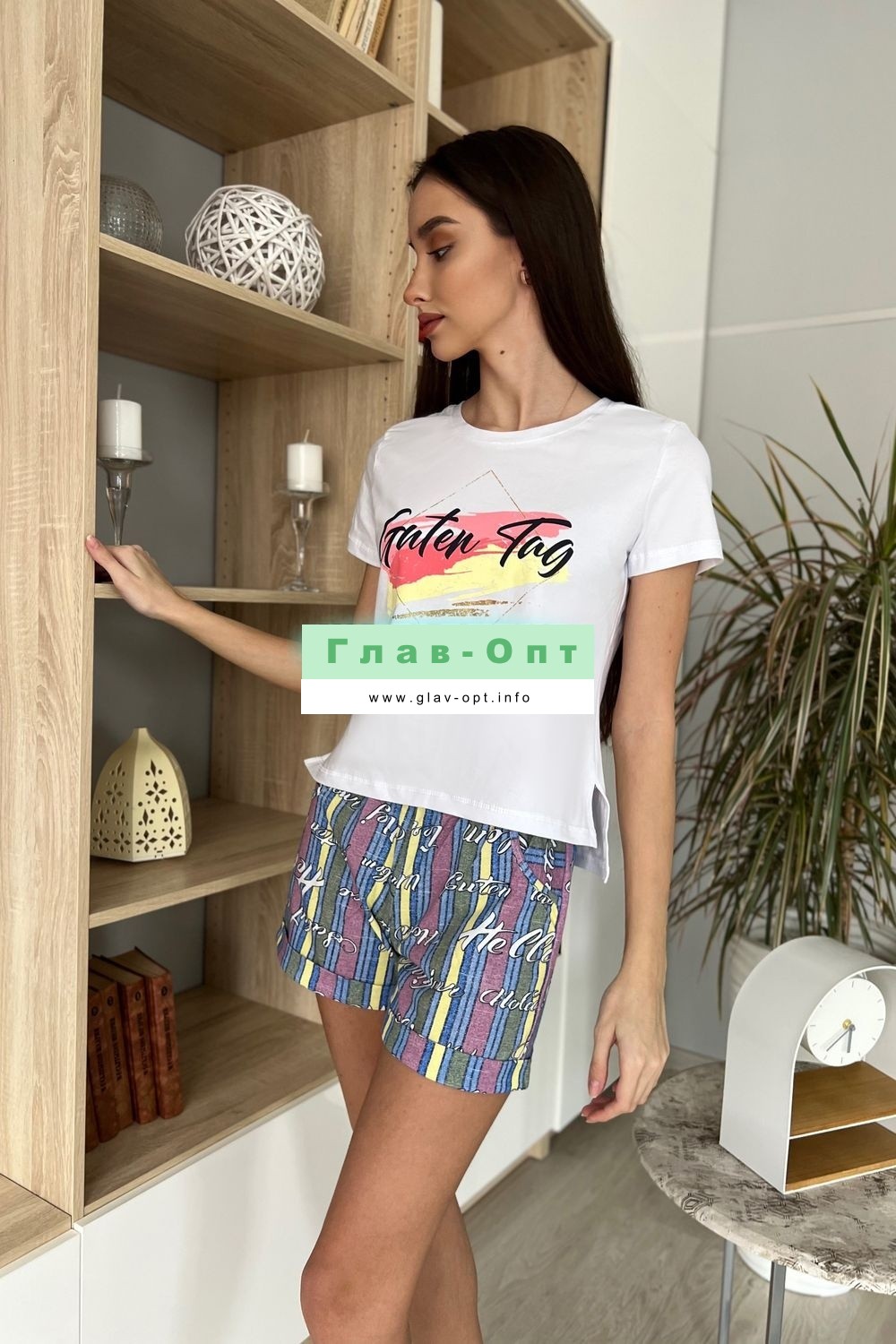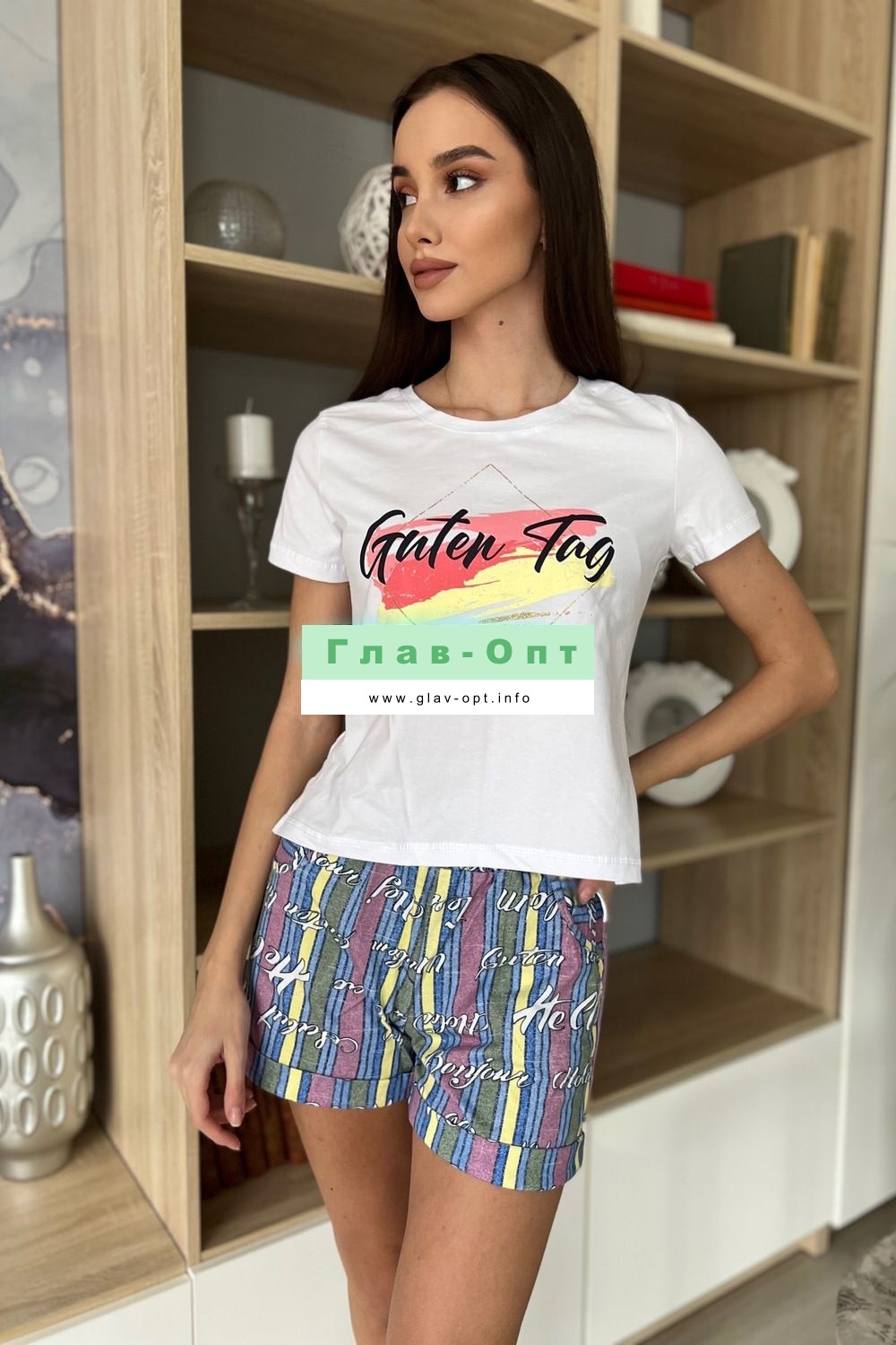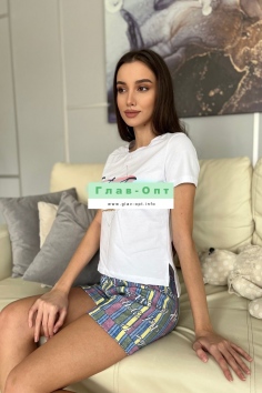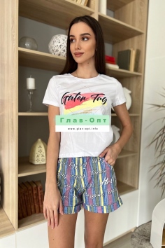 Костюм состоит из футболки и шорт. Футболка прямого силуэта, с удлиненной спинкой, с округлой горловиной. Рукав втачной, короткий. В нижней части боковых швов обработаны разрезы. Горловина обработана обтачкой из основного полотна. Шорты прямые, на поясе, с карманами, с манжетом по низу.