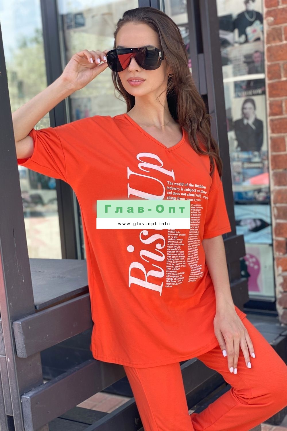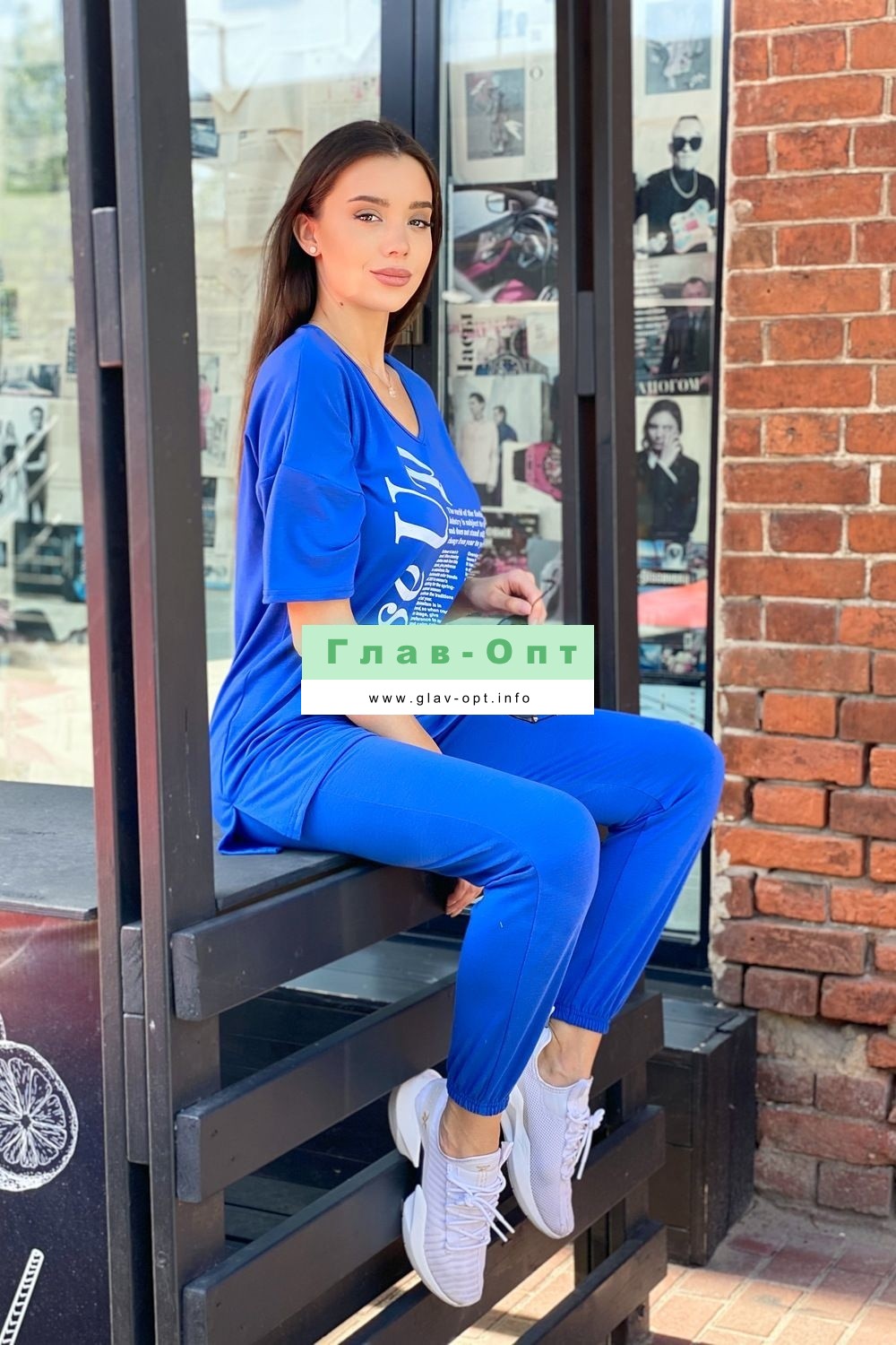 Комплект состоит из туники и брюк. Туника прямого силуэта, с V-образной горловиной, с удлиненной спинкой, с разрезами в нижней части боковых швов. Рукав короткий. Горловина обработана бейкой из основного полотна. Брюки длинные, с карманами, с кокеткой сзади, на эластичном поясе. Низ брюк на резинке.