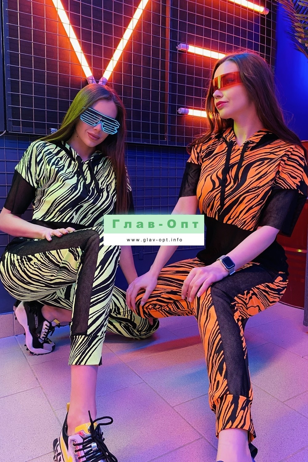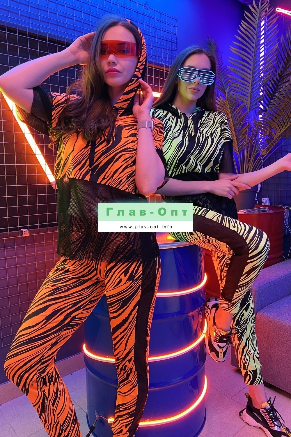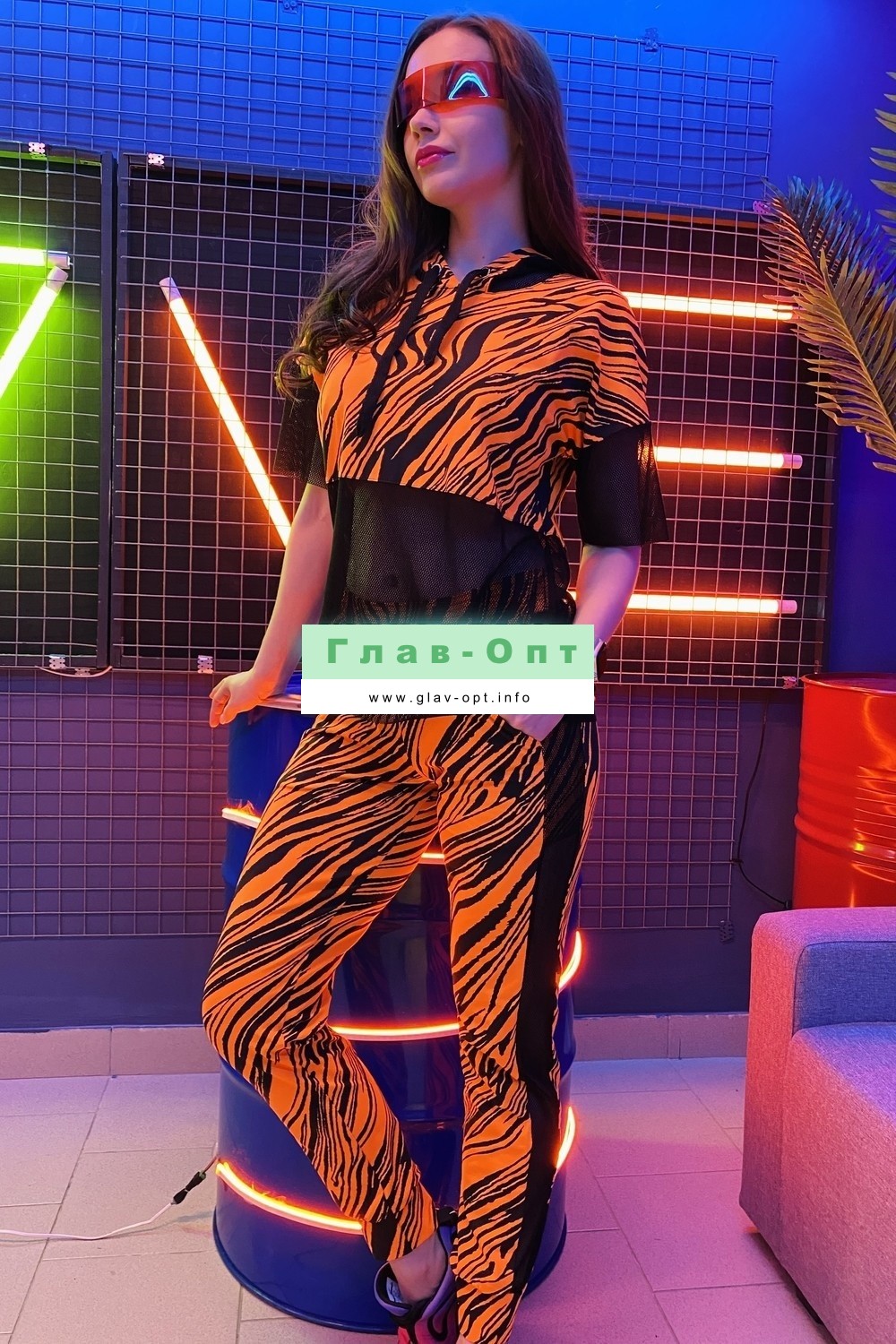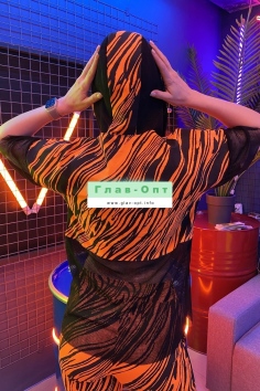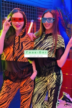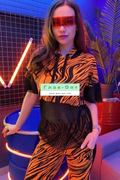 Комплект состоит из туники и брюк. Брюки на поясе, с карманами, с лампасами из сетки вдоль боковых швов, на манжете по низу. Туника свободная, с капюшоном из сетки, с удлиненной спинкой, длиной до середины бедра. Рукав короткий, из сетки. Нижняя часть полочки и спинки выполнены из сетки.