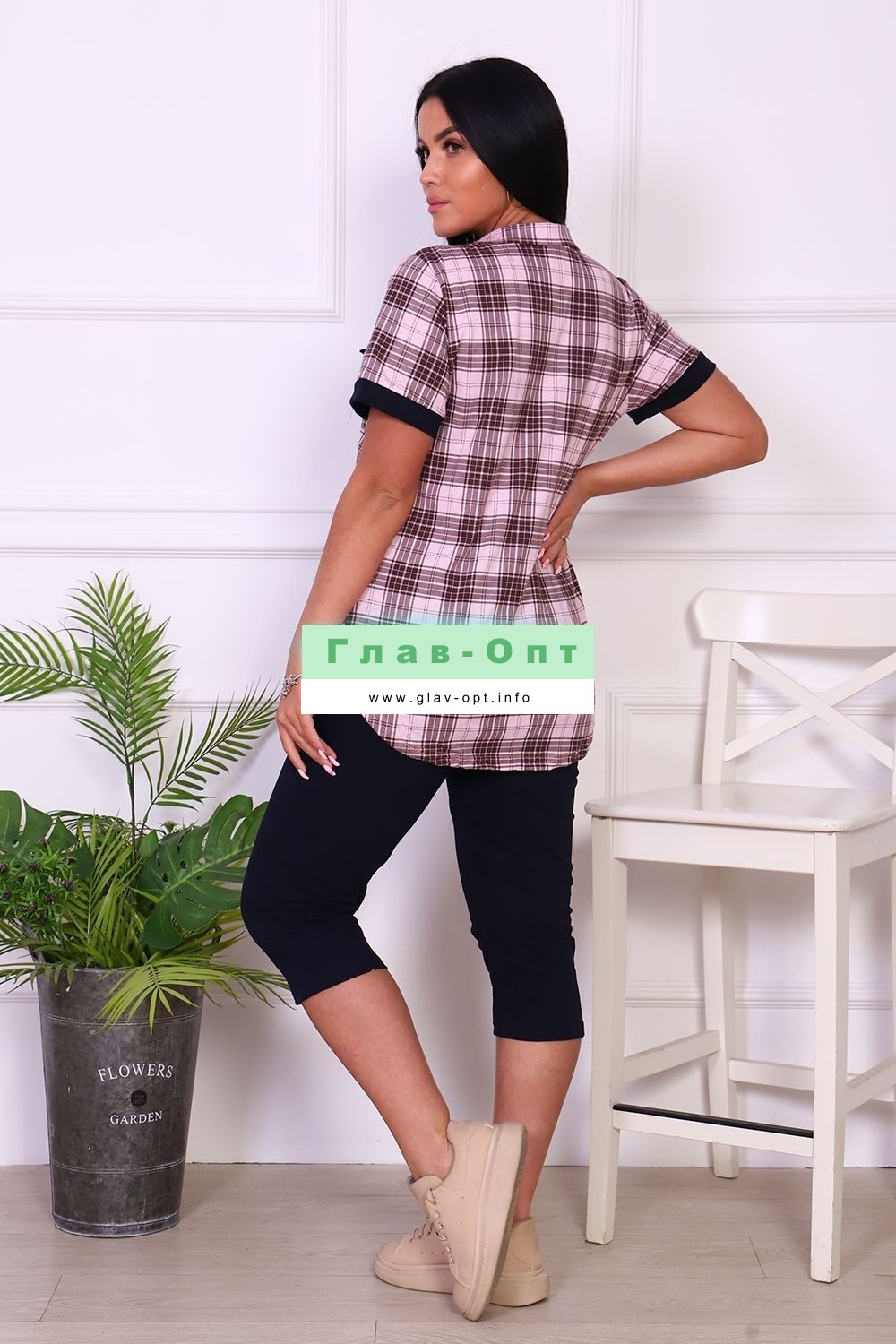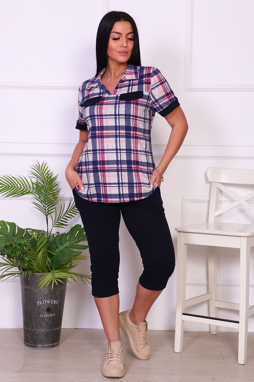 Костюм женский туника и бриджи. Туника свободного силуэта, с коротким рукавом, с накладными фальш-карманами и отложным воротником. Бриджи ниже колена, с карманами. Костюм выполнен из легкого, мягкого трикотажного полотна - 100% хлопок. Вещи из чистого хлопка оптимальны для отдыха и сна. Костюм очень женственный и комфортный.