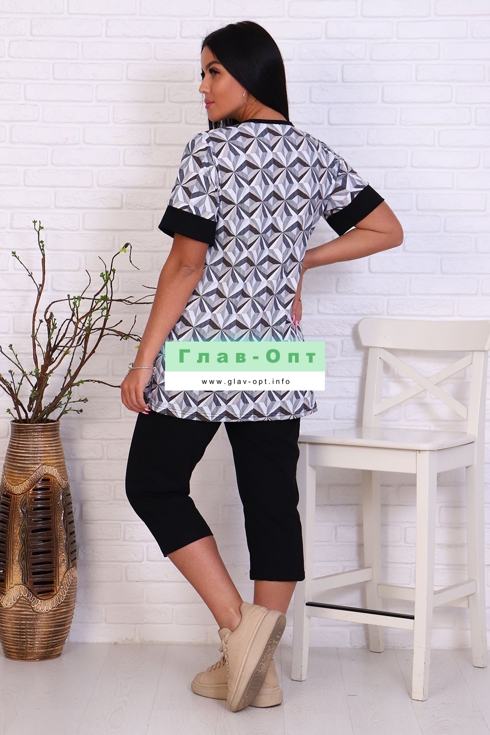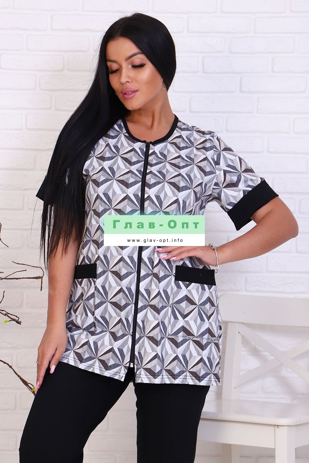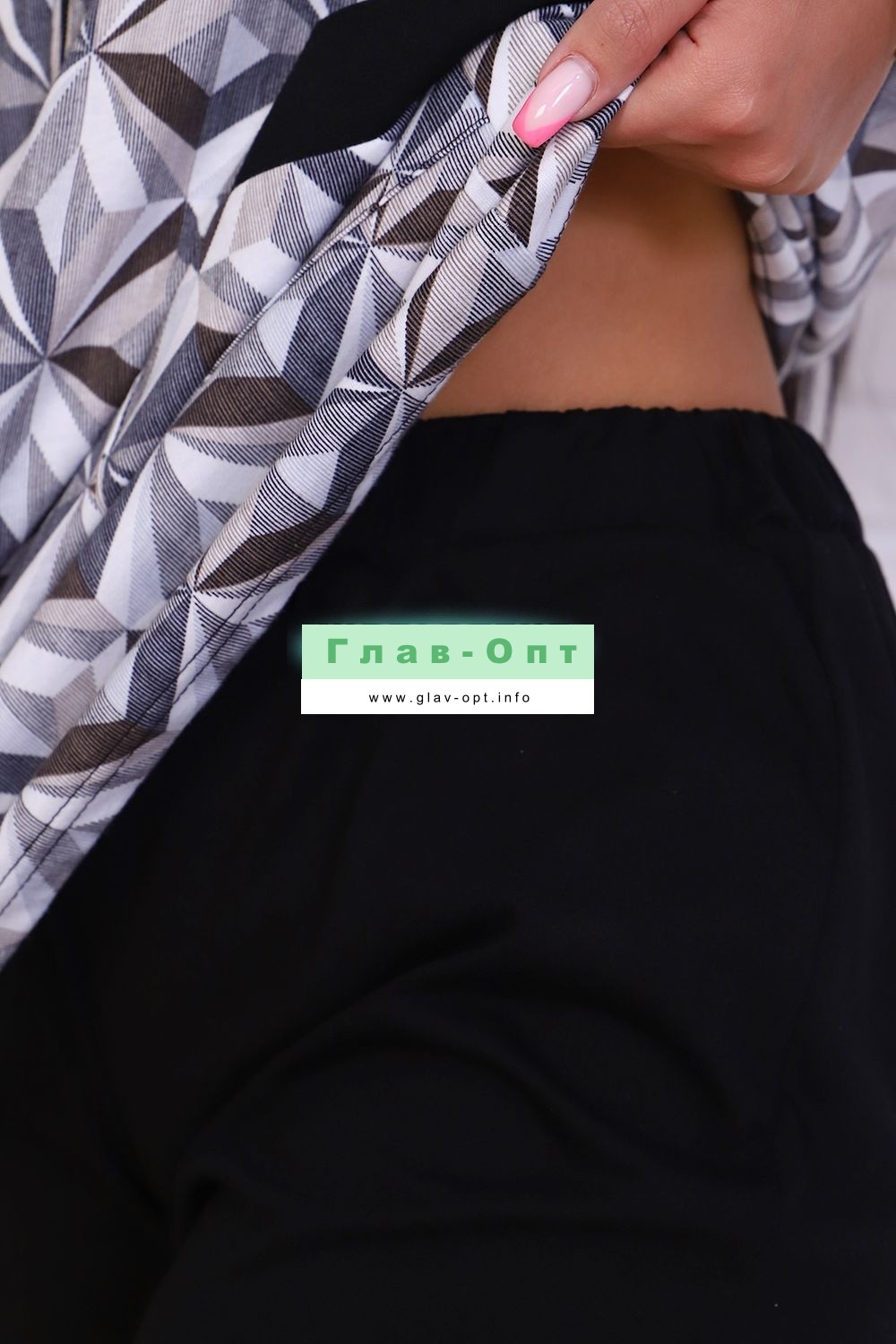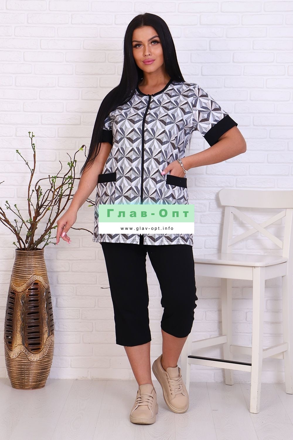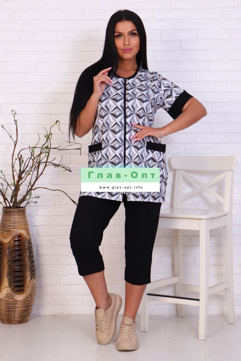 Женский костюм из кулирки кофта + бриджи. Кофта из набивной ткани на молнии с накладными карманами, короткие рукава с манжетами, бриджи из однотонной ткани. Идеальный костюм для отдыха дома, на даче.