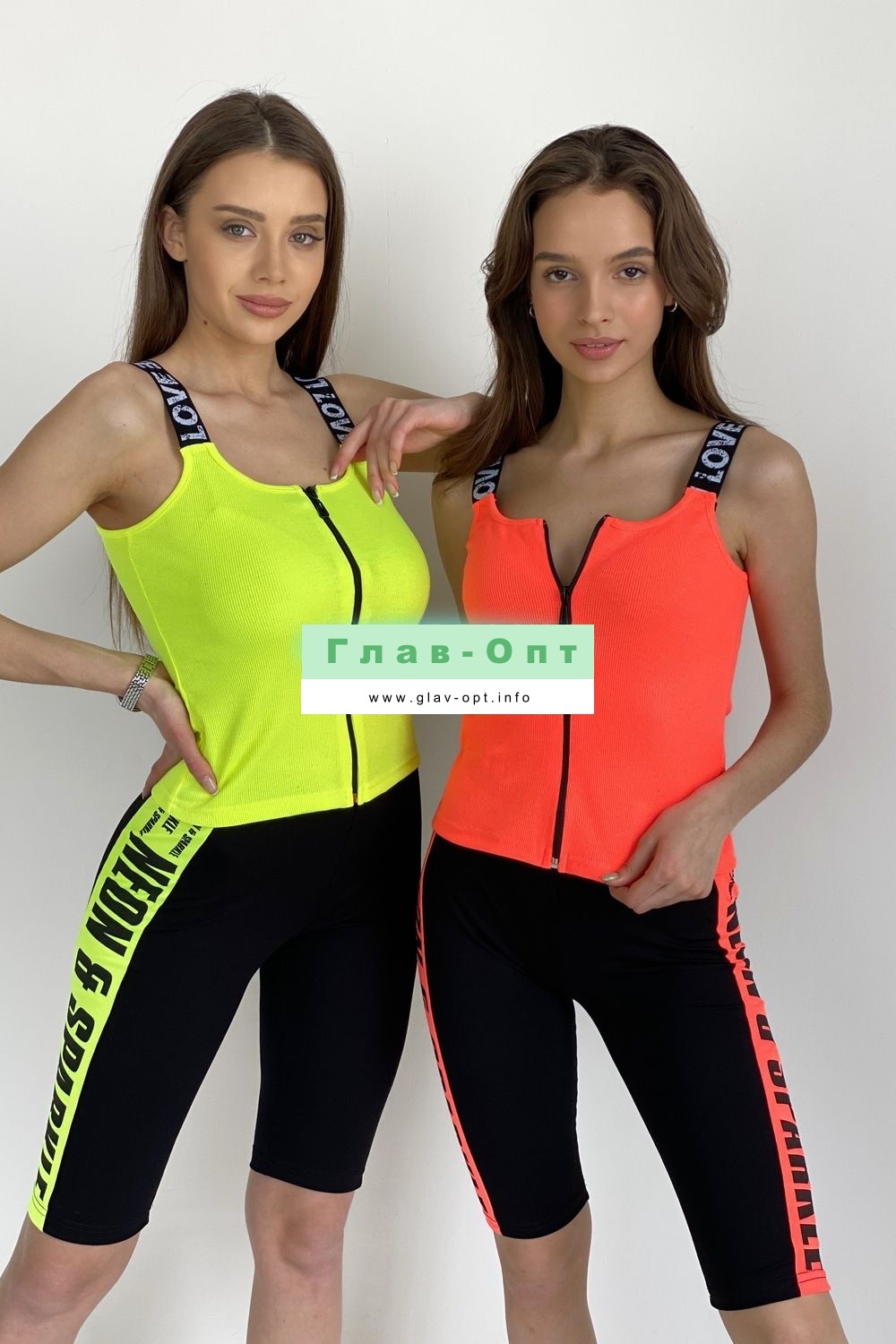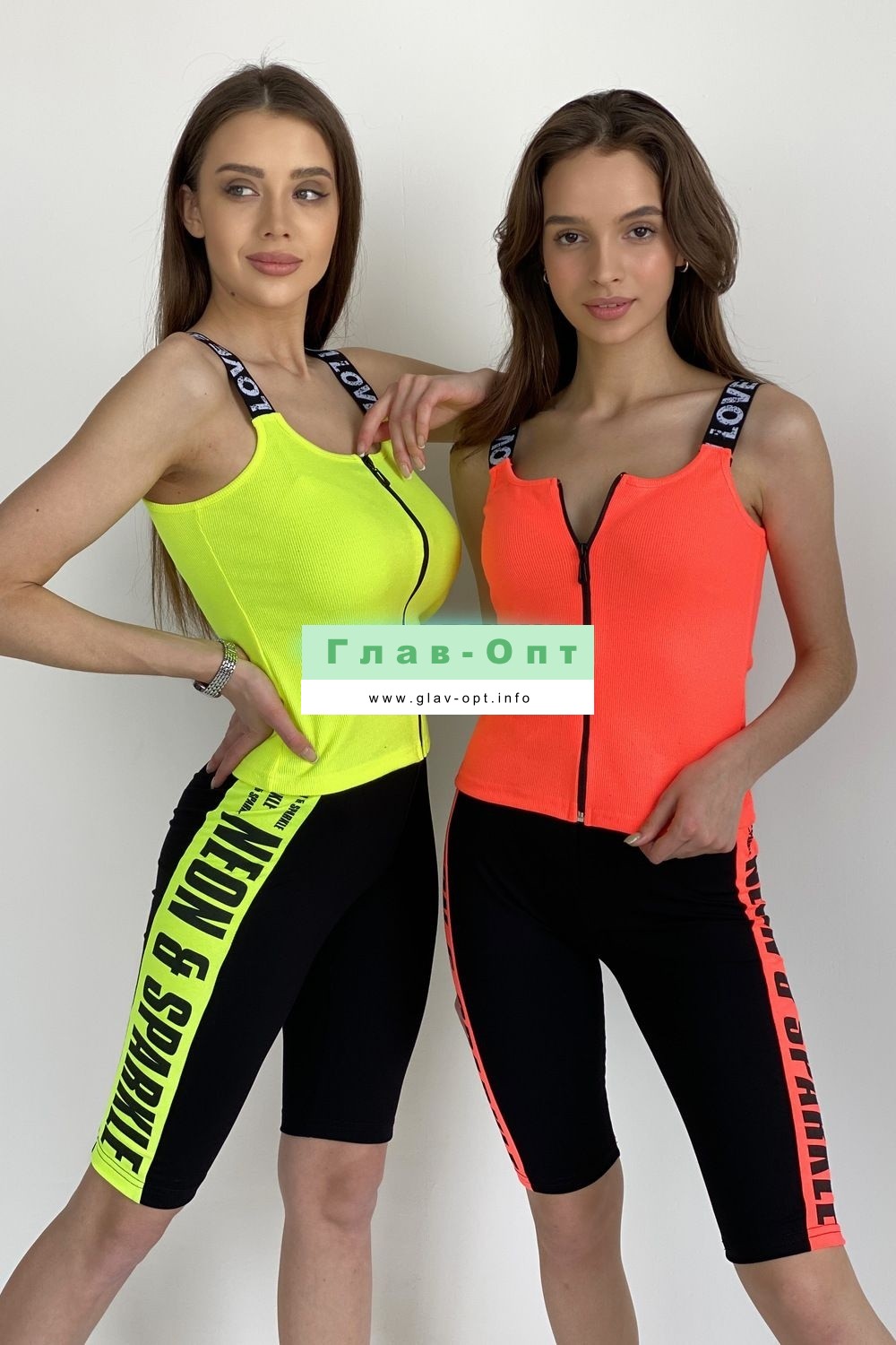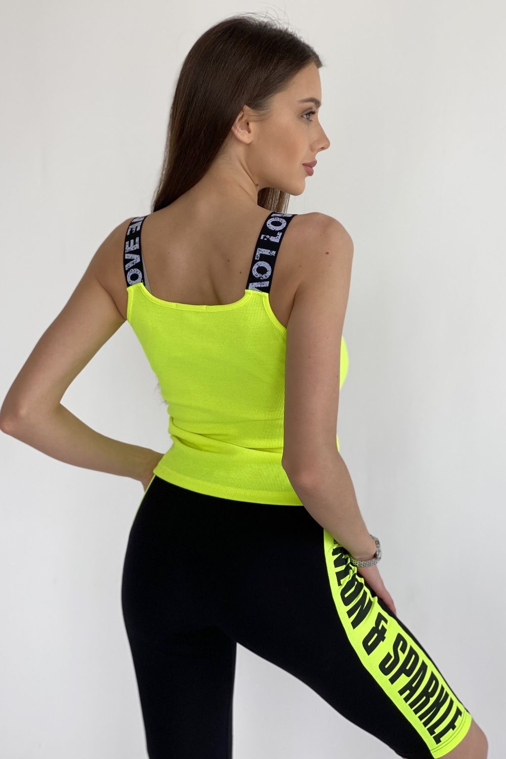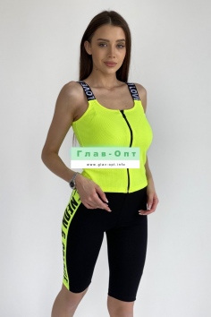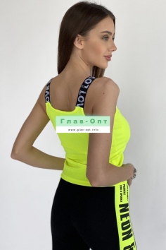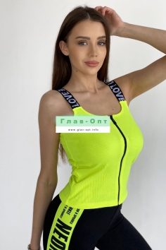 Майка облегающая, средней длины, с округлой горловиной. Размер регулируется за счет эластичности полотна. Бретели выполнены из эластичной тесьмы с надписями. Горловина и проймы обработаны бейкой из основного полотна.