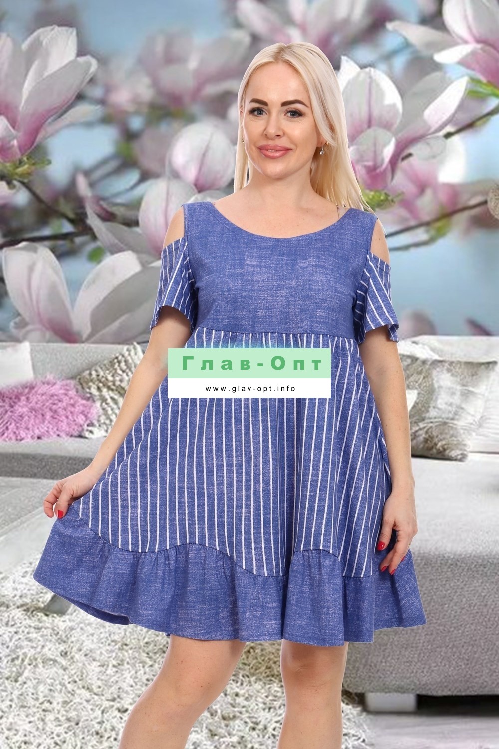 Платье женское молодежное, к низу расширенное, отрезное выше линии талии. Полочка, спинка и волан внизу из однотонной ткани, нижняя часть платья и рукав из ткани-компаньона в полоску.