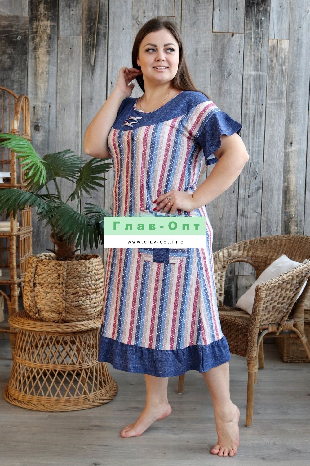 Платье женское полуприлегающего силуэта из ткани в полоску. Рукав короткий цельнокроенный с воланом. На полочке накладные карманы. Кокетка полочки и спинки, воланы рукавов, рюша низа изделия из отделочной ткани. На кокетке полочки и карманах декоративная отделка в виде переплетающейся бейки. На модели 52 размер